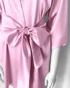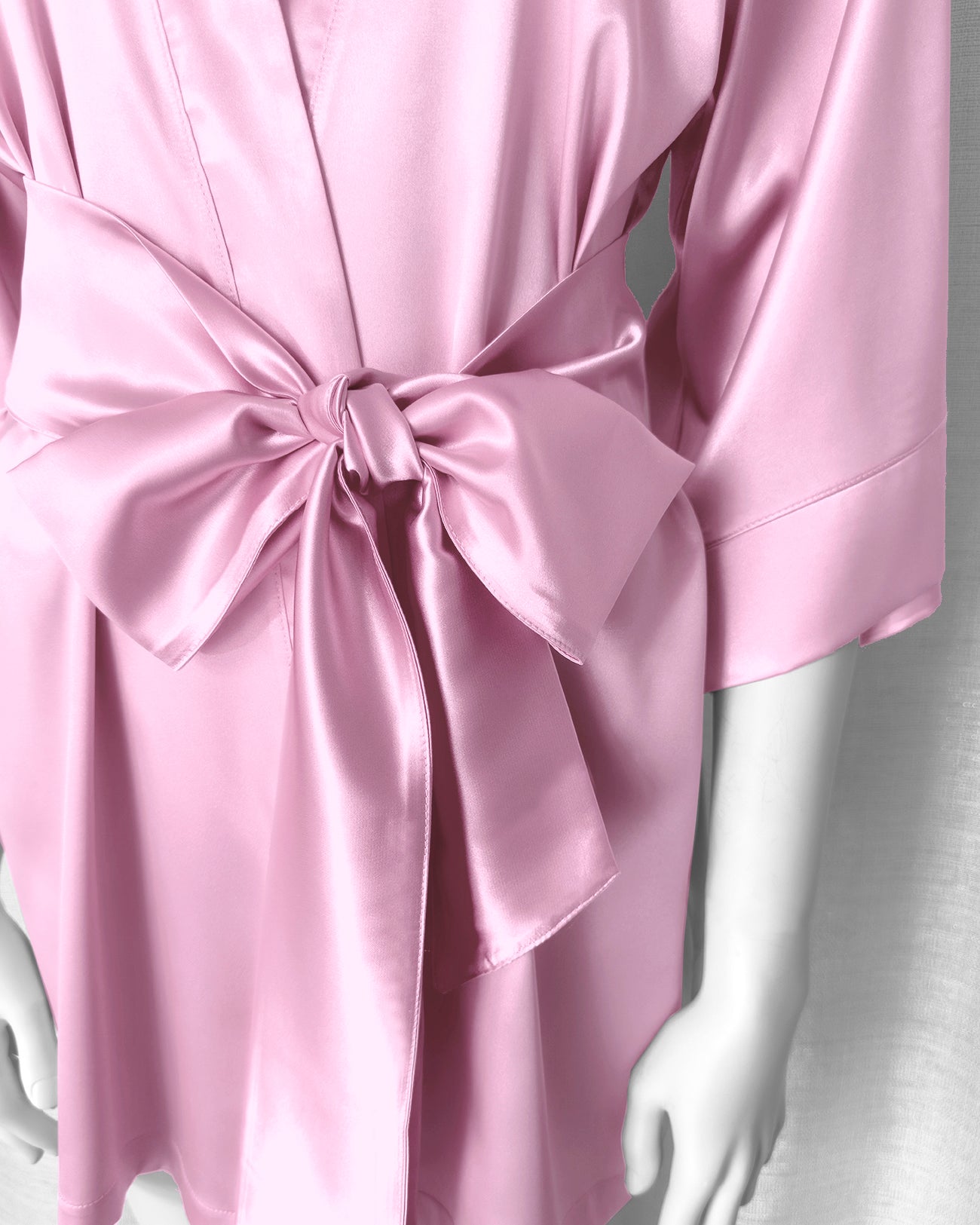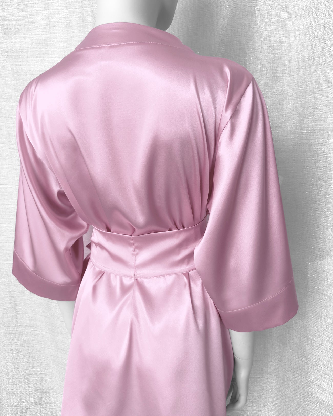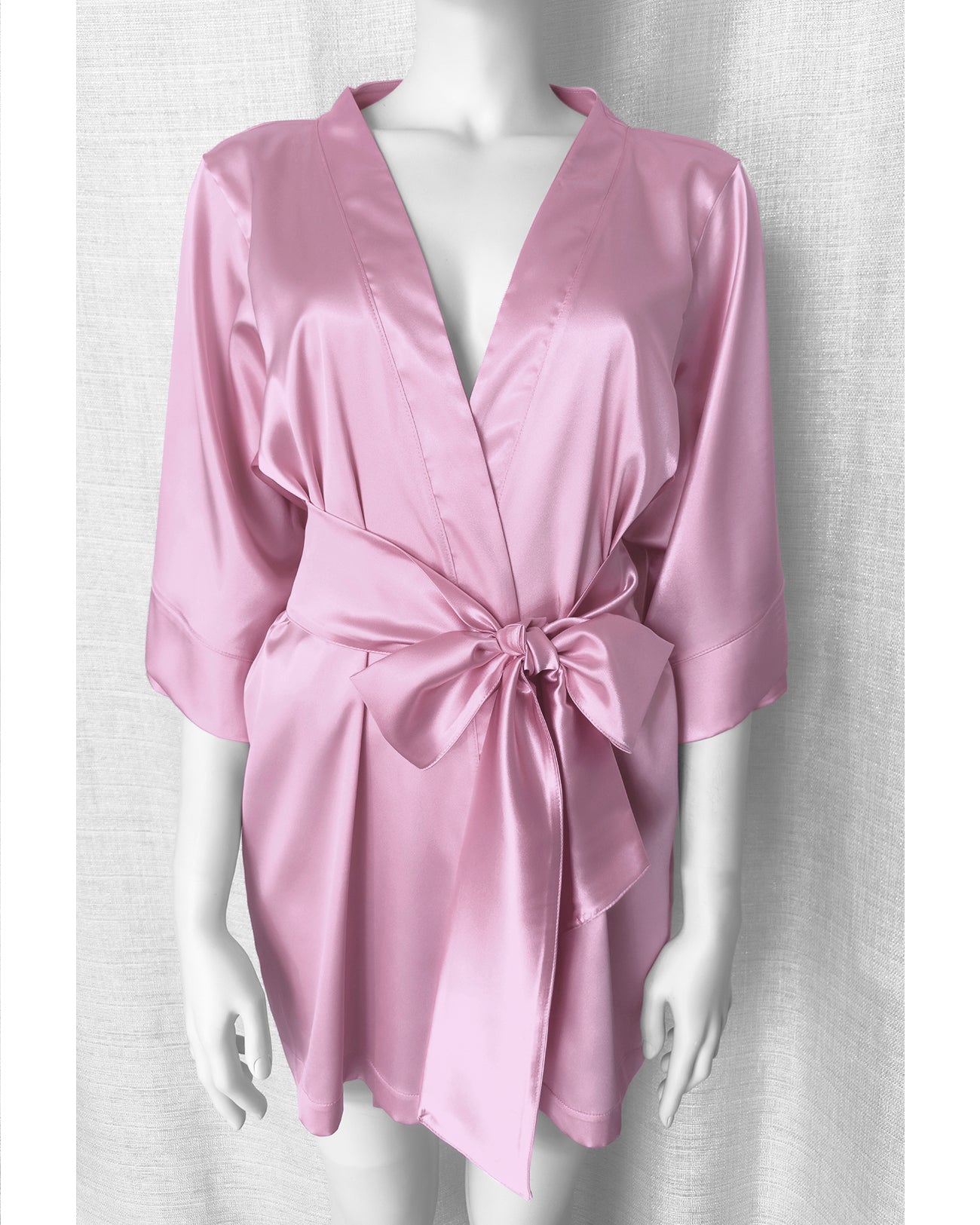 Vestaglia kimono in morbidissimo raso rosa con maniche ampie. Nunce polverosa molto chic! Grazie alla larga cintura in vita è più comoda da annodare e otterrai un bellissimo fiocco! Perfetta come scendiletto o come accessorio per una serata speciale!