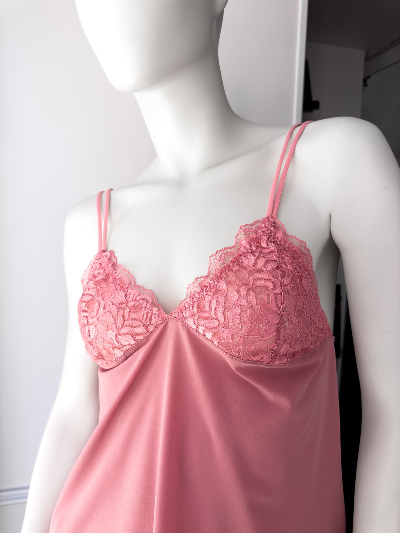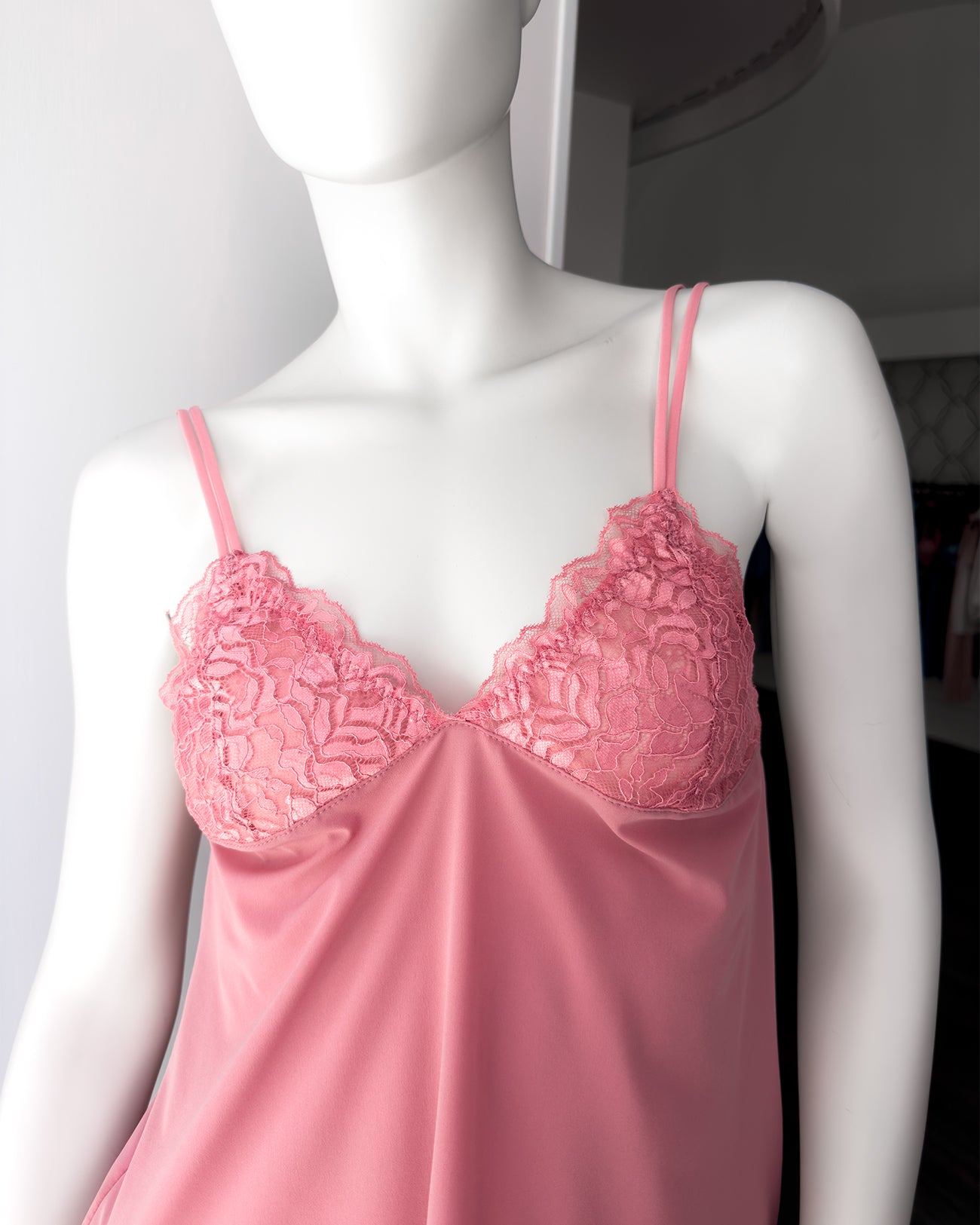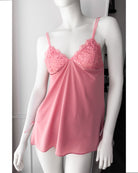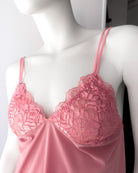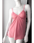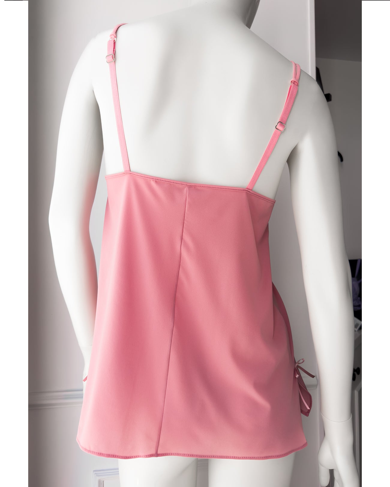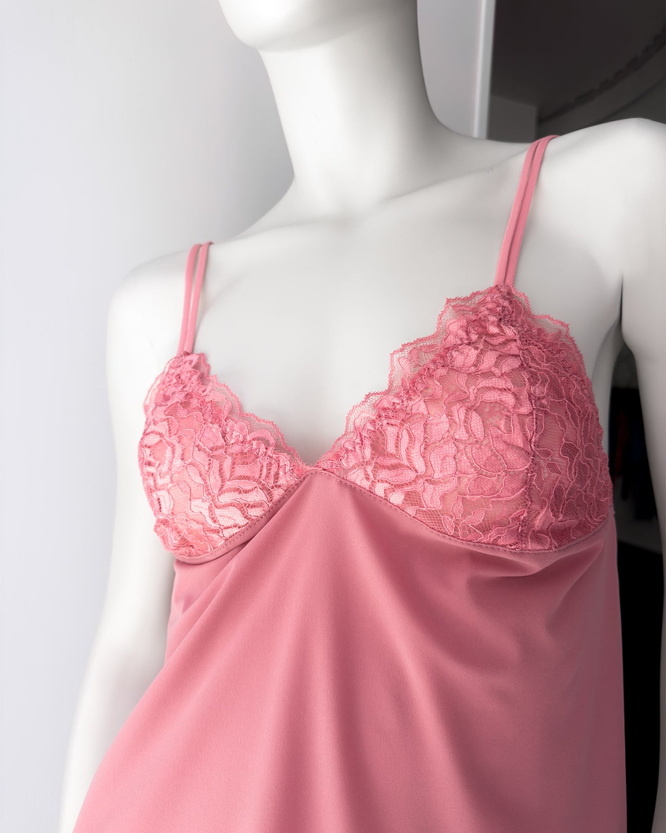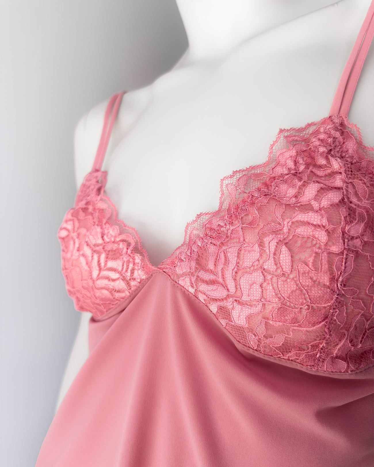 Babydoll realizzato in morbidissimo elasticizzato opaco tessuto rosa antico con coppe in pizzo floreale in nuance dai disegni lucidi e smerlo retato. Sensuali spacchetti laterali con fiocchetto.