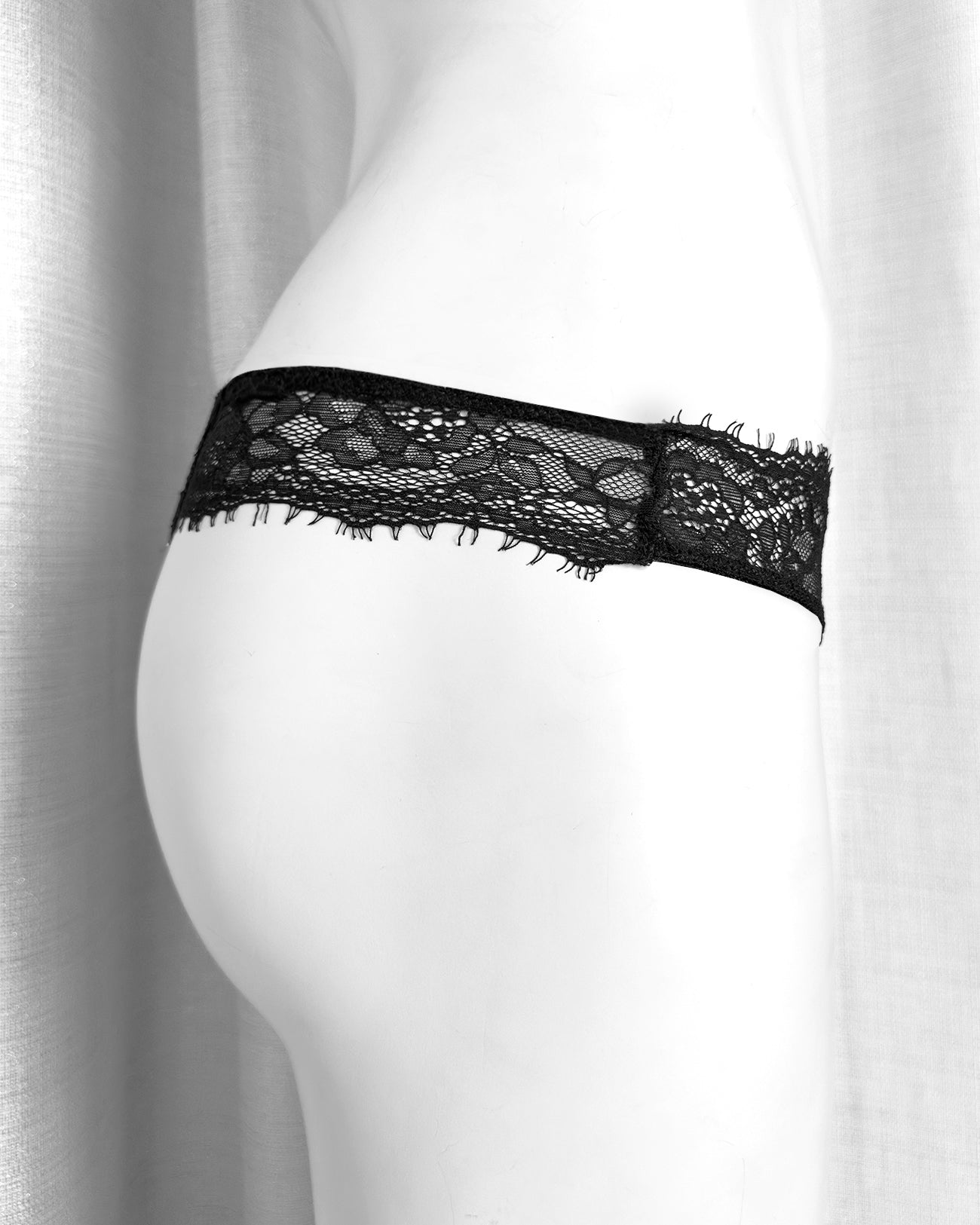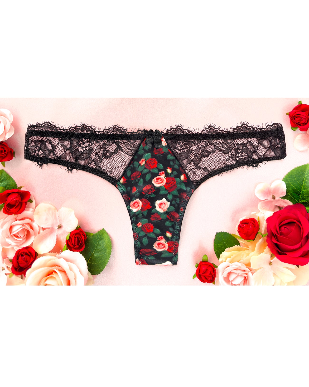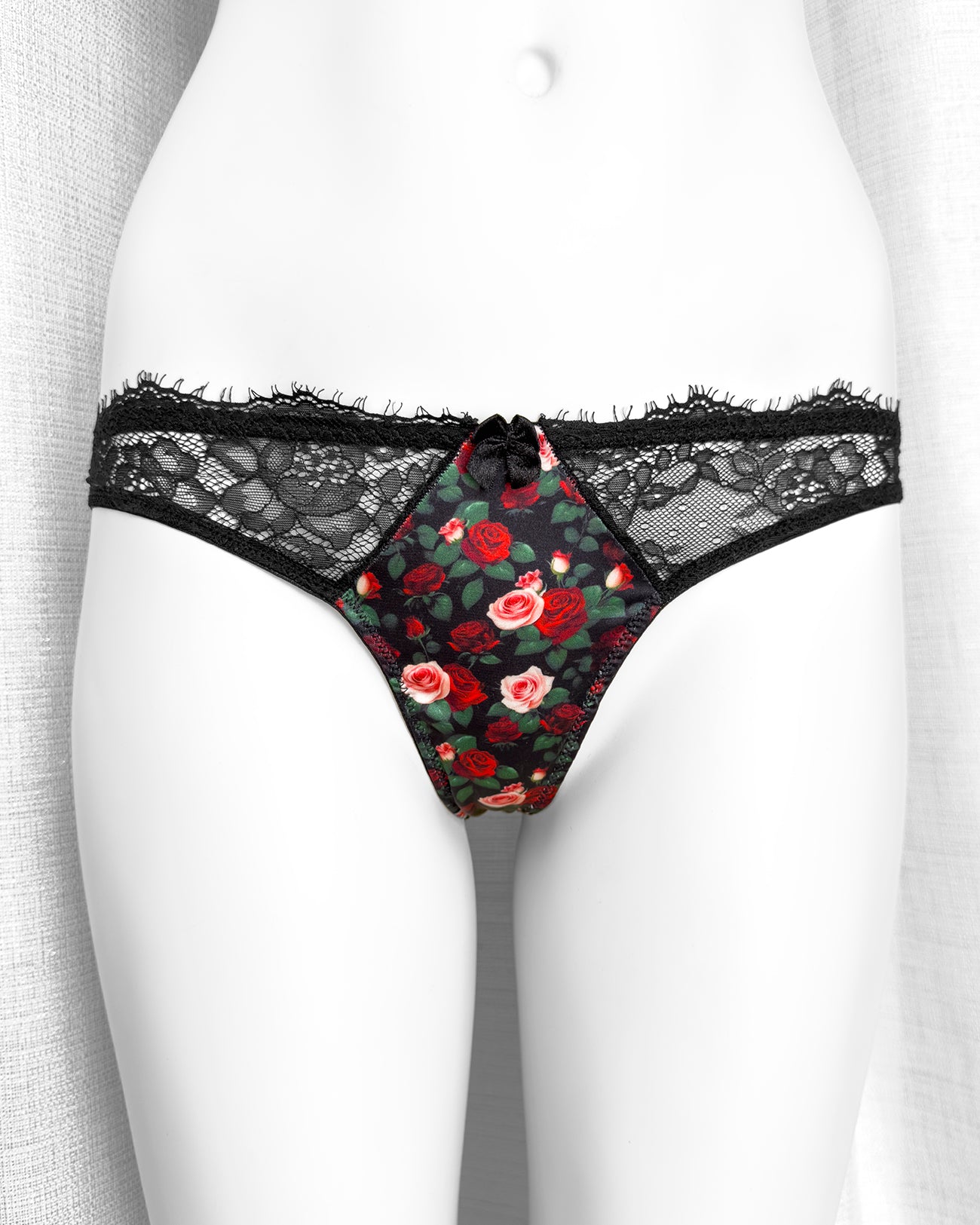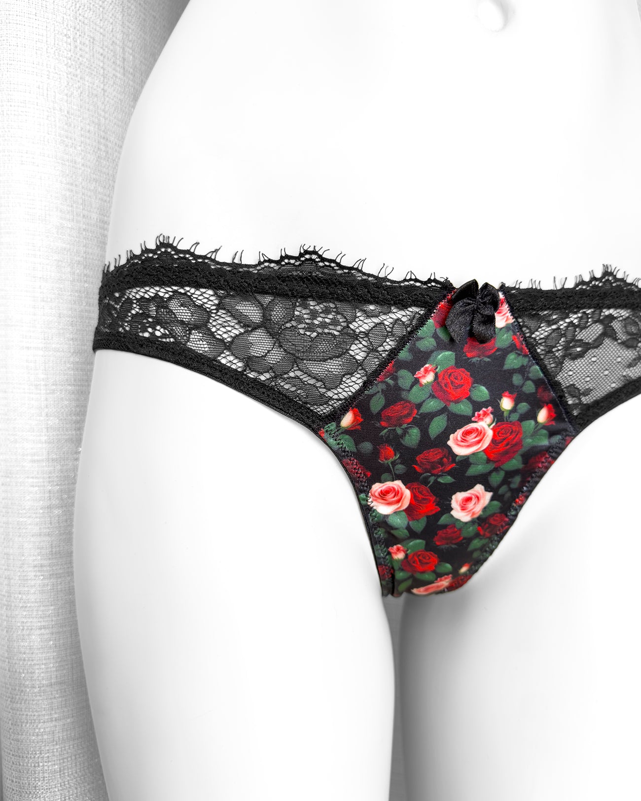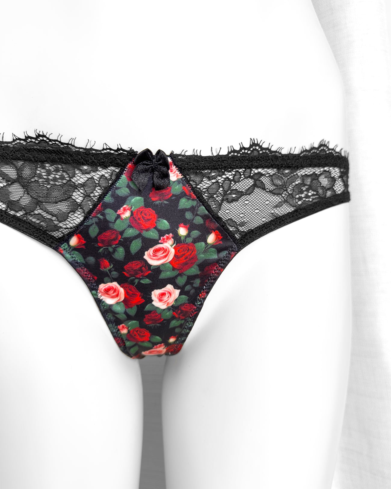 Brasiliana a vita regolare con fronte in morbidissimo raso elasticizzato con stampa con rose rosse e rosa a fondo nero abbinato ad un magnifico pizzo nero. Chic fiocchetto centrale in raso. Retro in splendido pizzo nero cigliato! Pattina interna in 100% cotone.