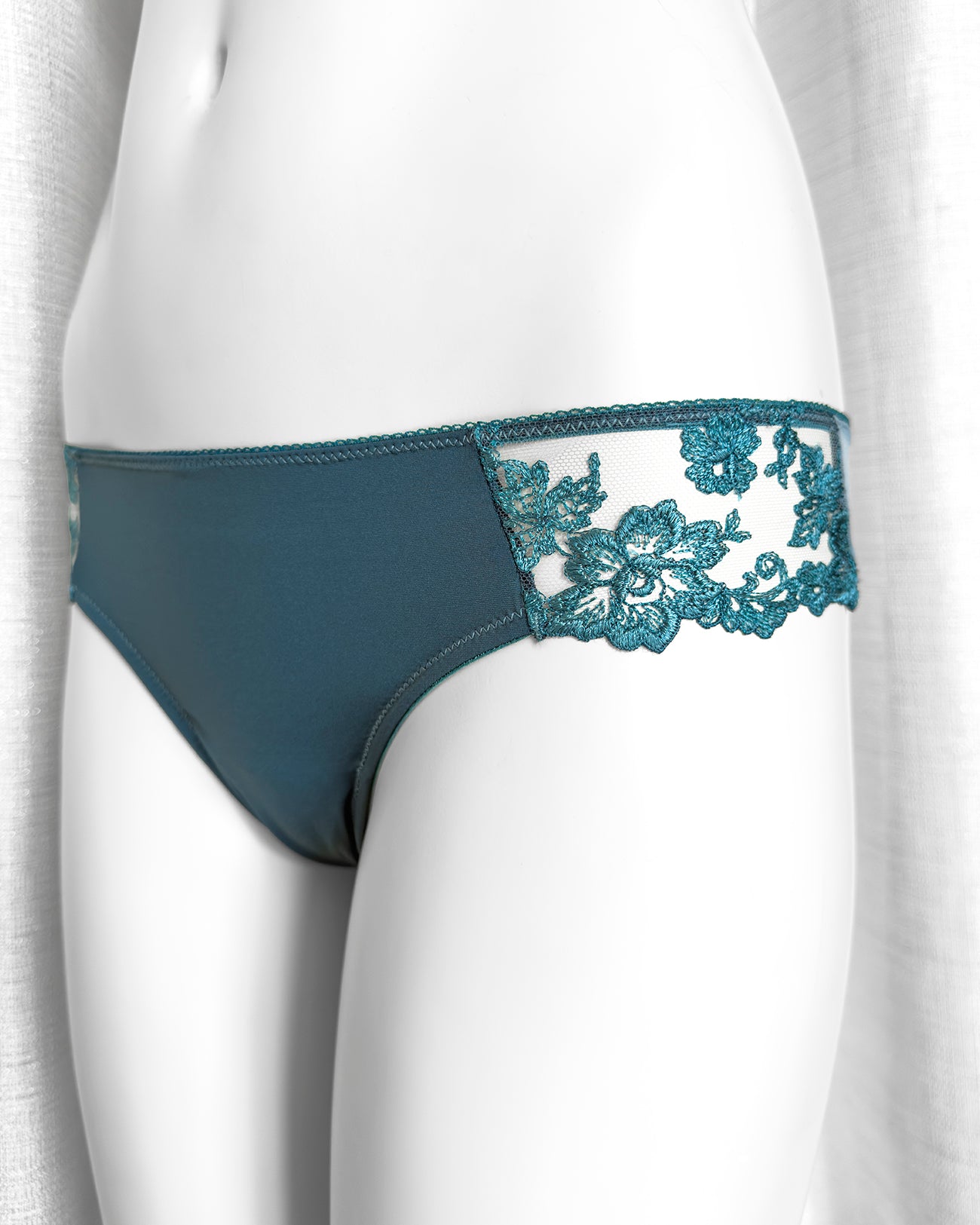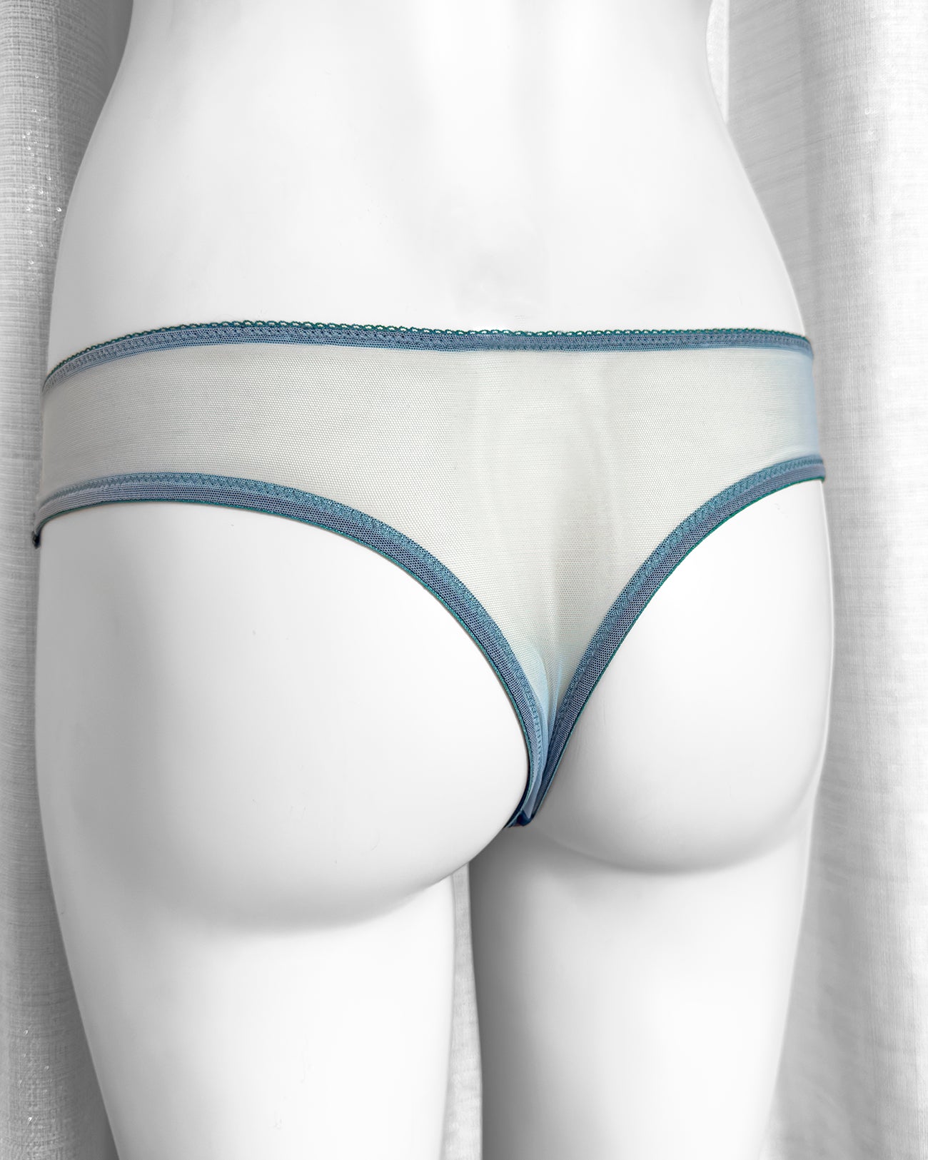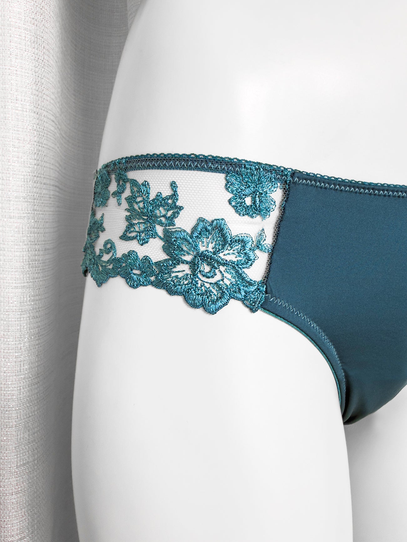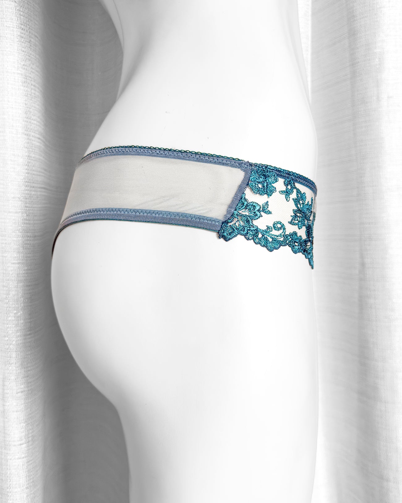 Brasiliana a vita standard. Parte frontale realizzata in elegantissimo tulle blu ottanio ricamato con fiori tridimensionali tono su tono abbinato ad una charmeuse lucida elasticizzata e morbidissima. Il resto del capo è realizzato interamente in tulle elasticizzato in coordinato: sensuale trasparenza e comodità assicurate!