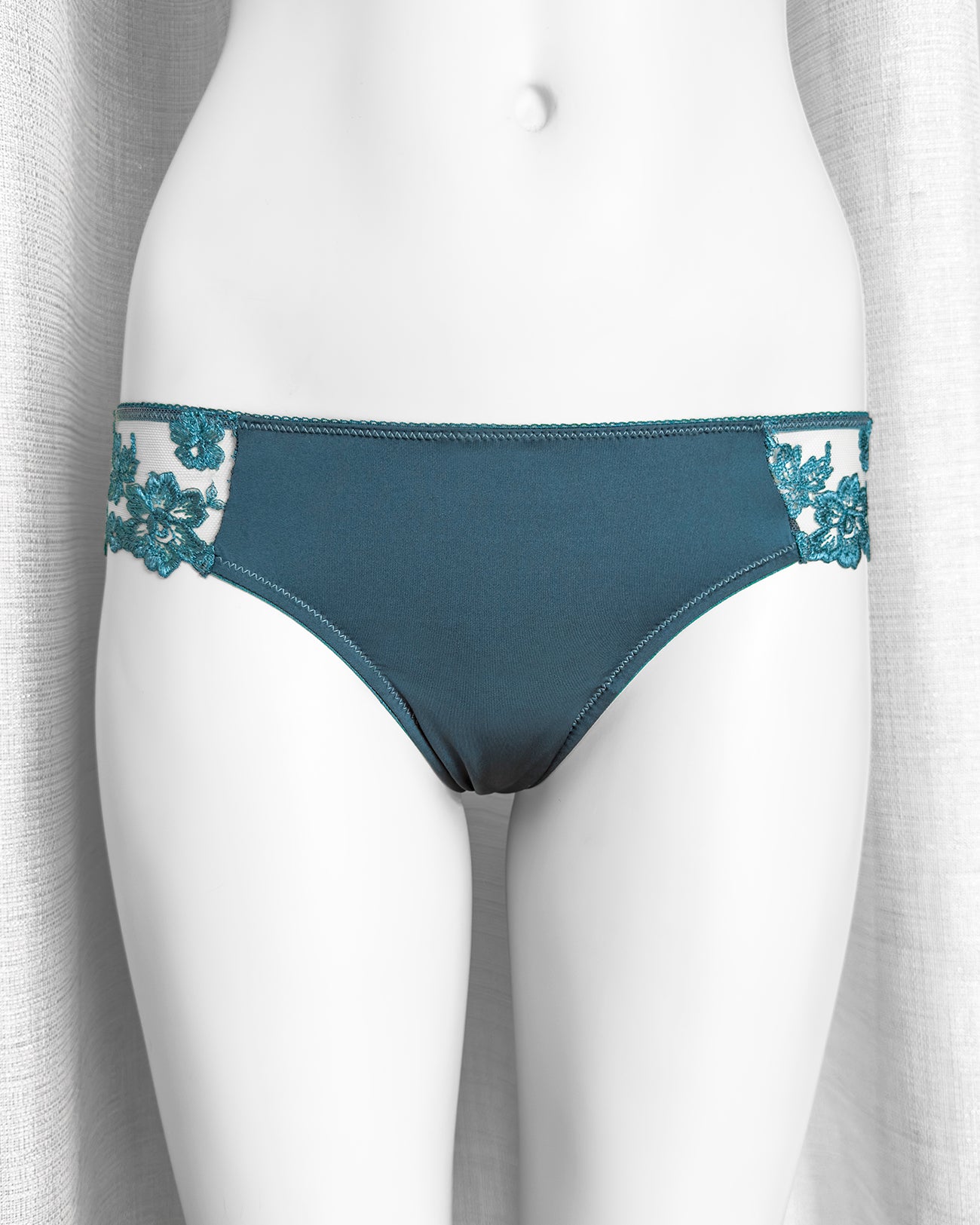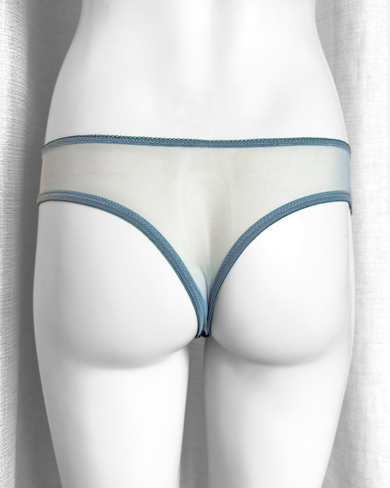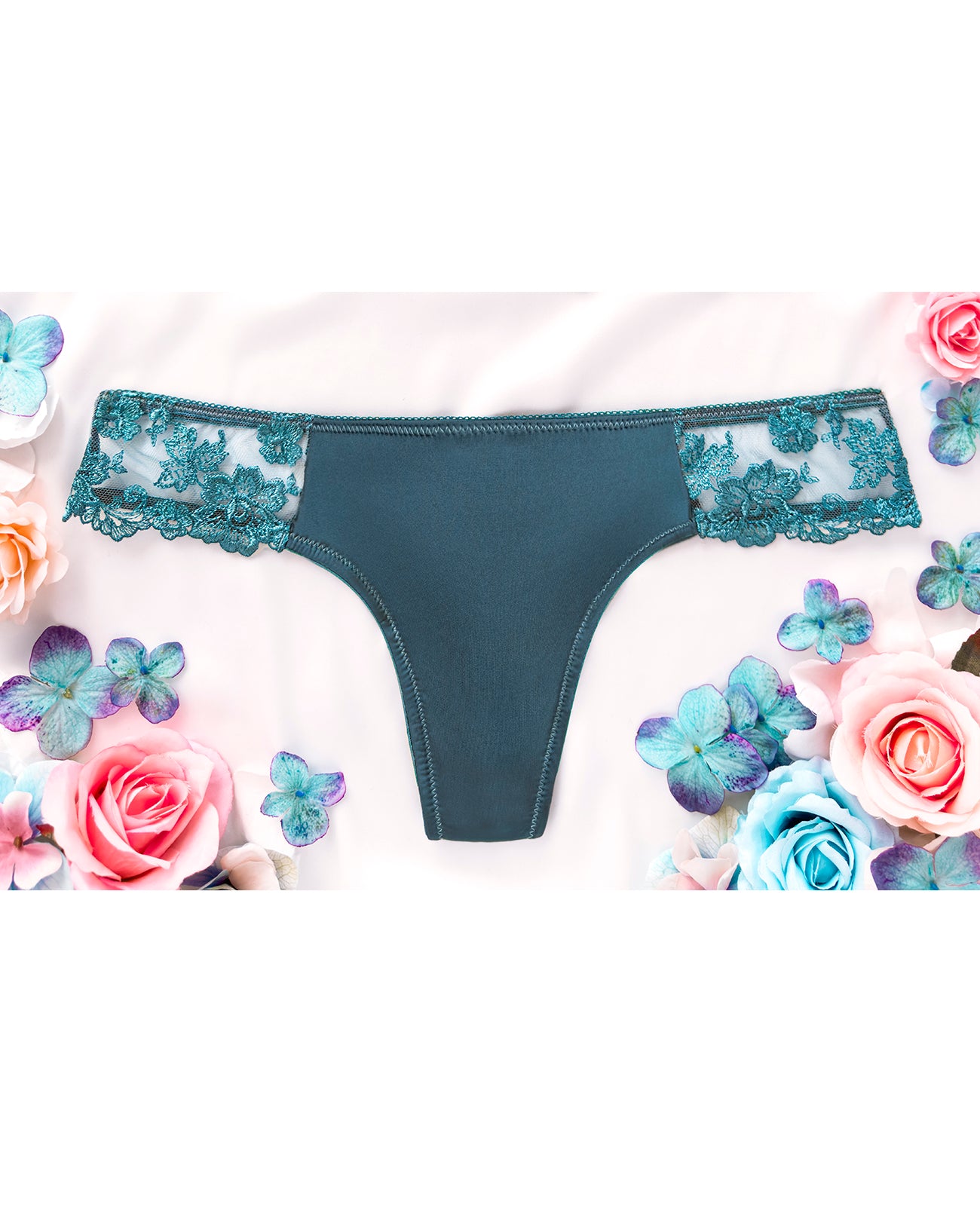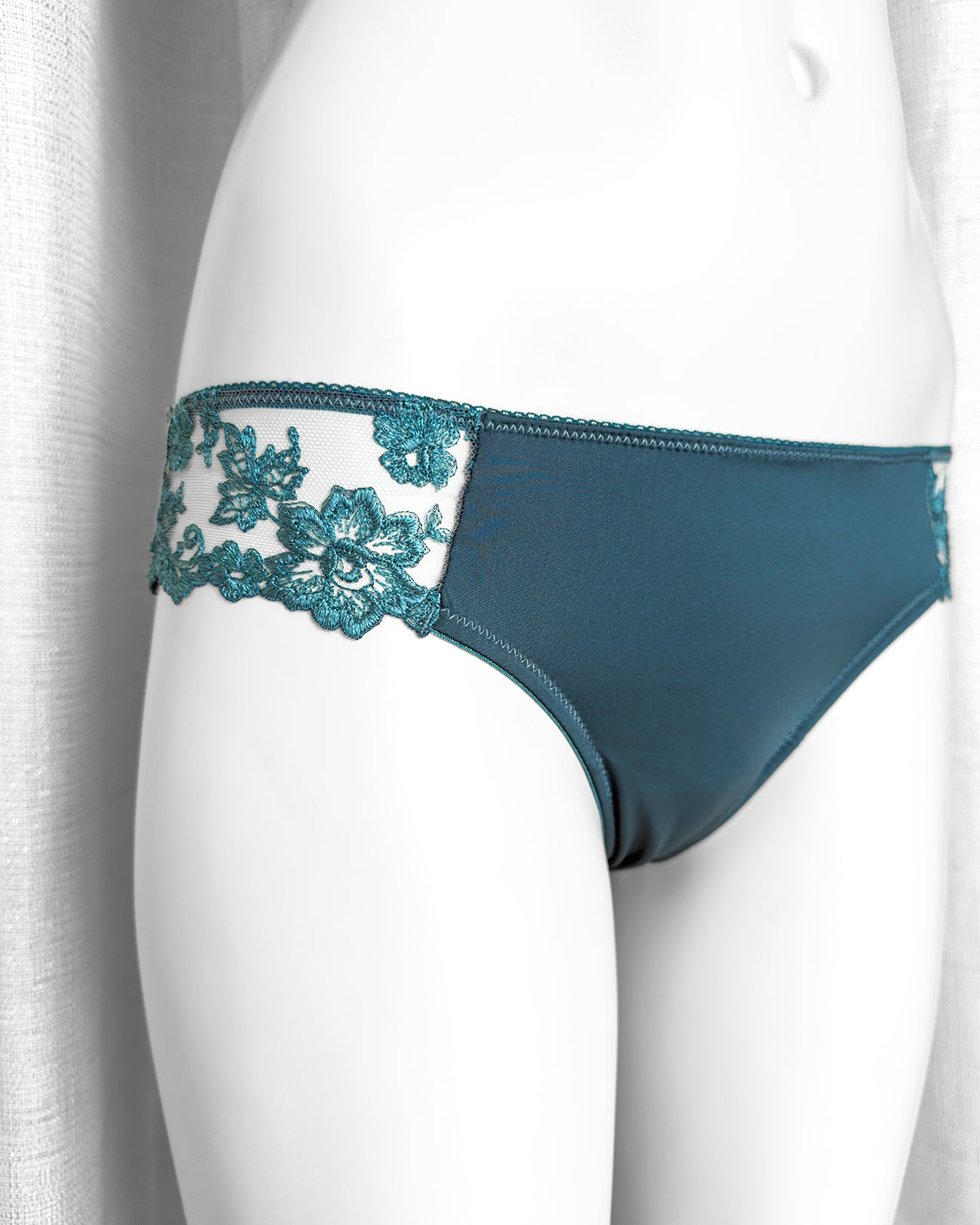 Brasiliana a vita standard. Parte frontale realizzata in elegantissimo tulle blu ottanio ricamato con fiori tridimensionali tono su tono abbinato ad una charmeuse lucida elasticizzata e morbidissima. Il resto del capo è realizzato interamente in tulle elasticizzato in coordinato: sensuale trasparenza e comodità assicurate!