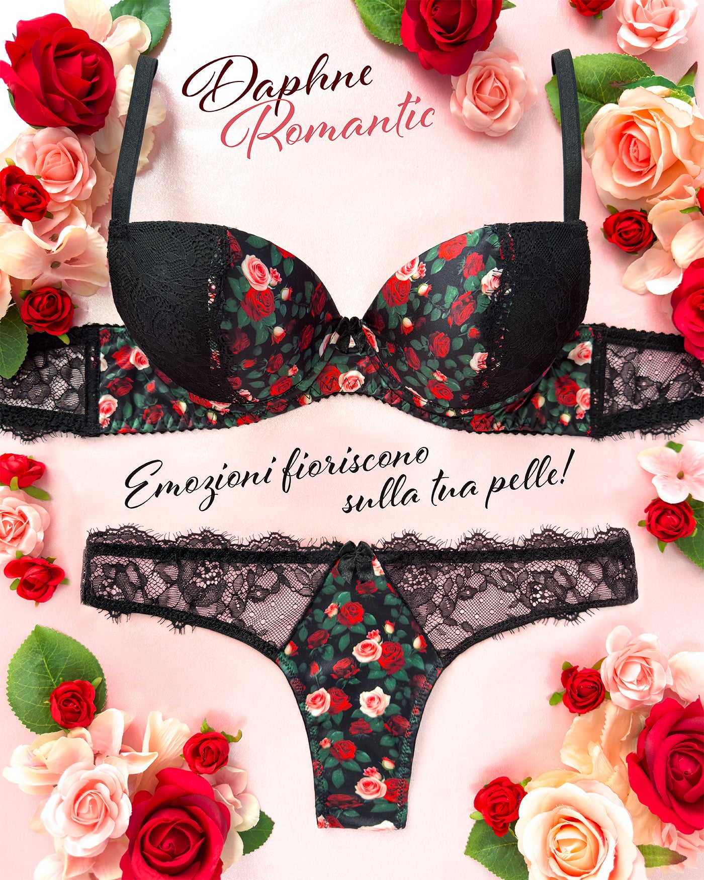 Daphne fiorisce sulla tua pelle: rose rosse e rosa per un tocco romantico ed un favoloso pizzo nero frangiato per una nota sensuale.