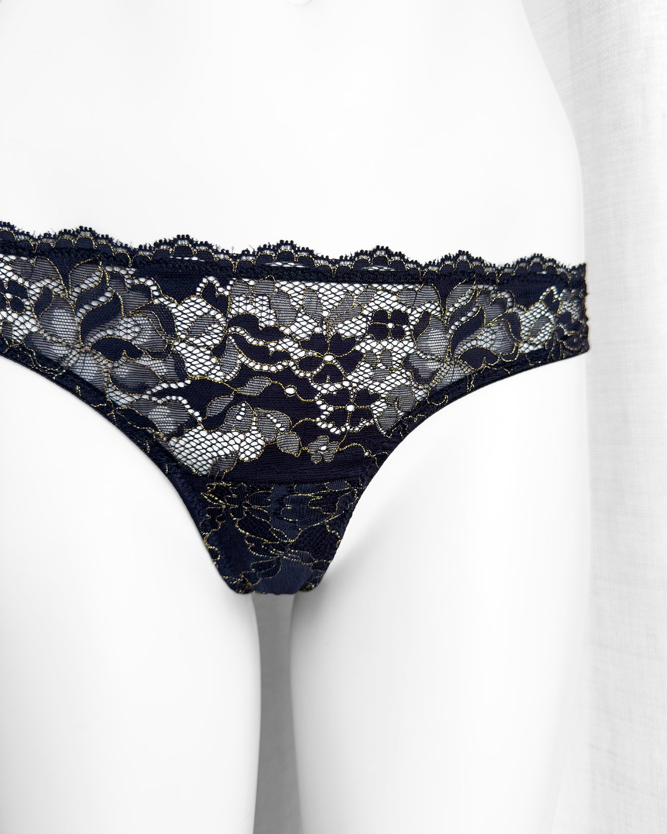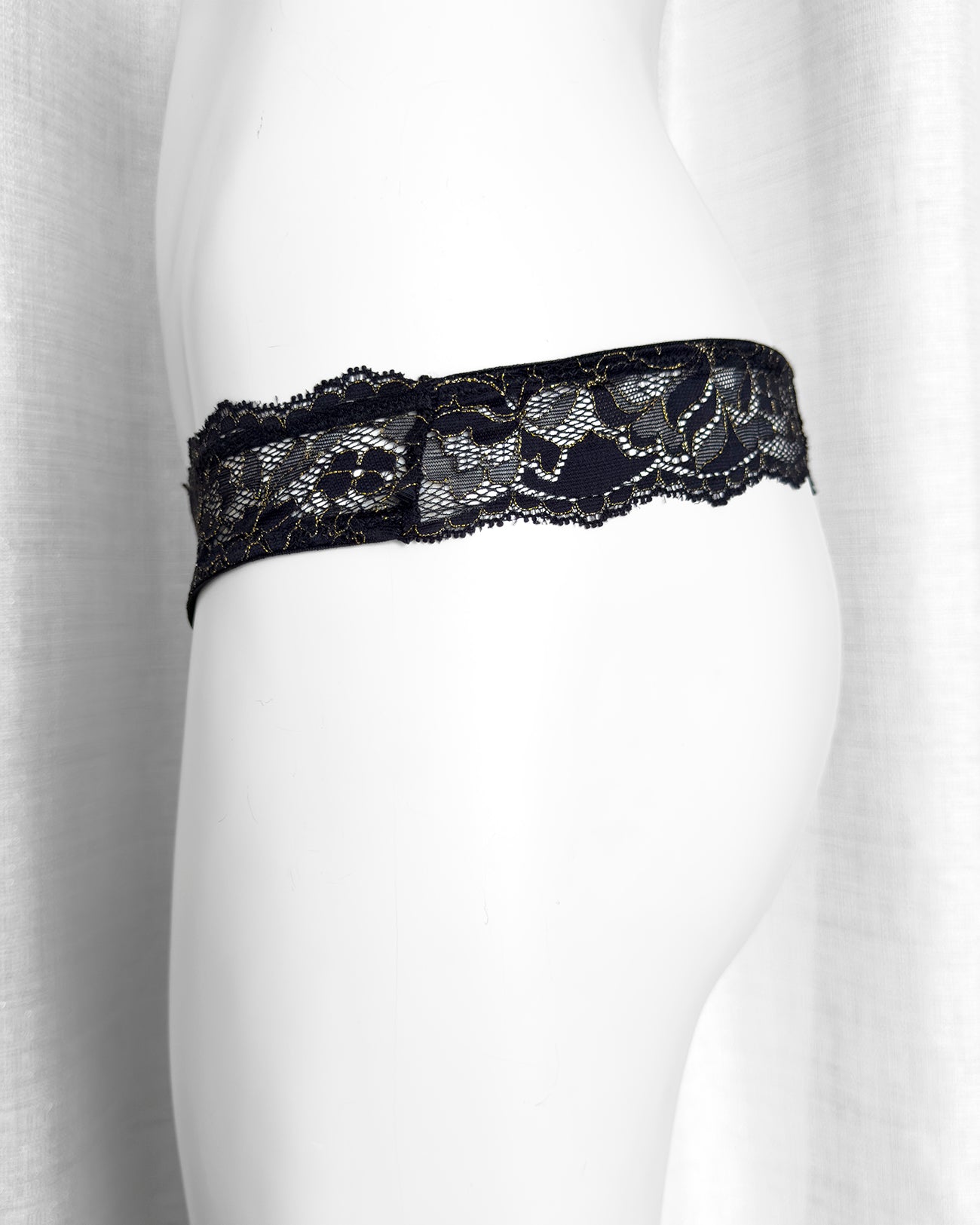Brasiliana a vita regolare realizzata in meraviglioso pizzo nero con disegno floreale, inserti in lurex oro e gioco di trasparenze. Pattina interna in 100% cotone.