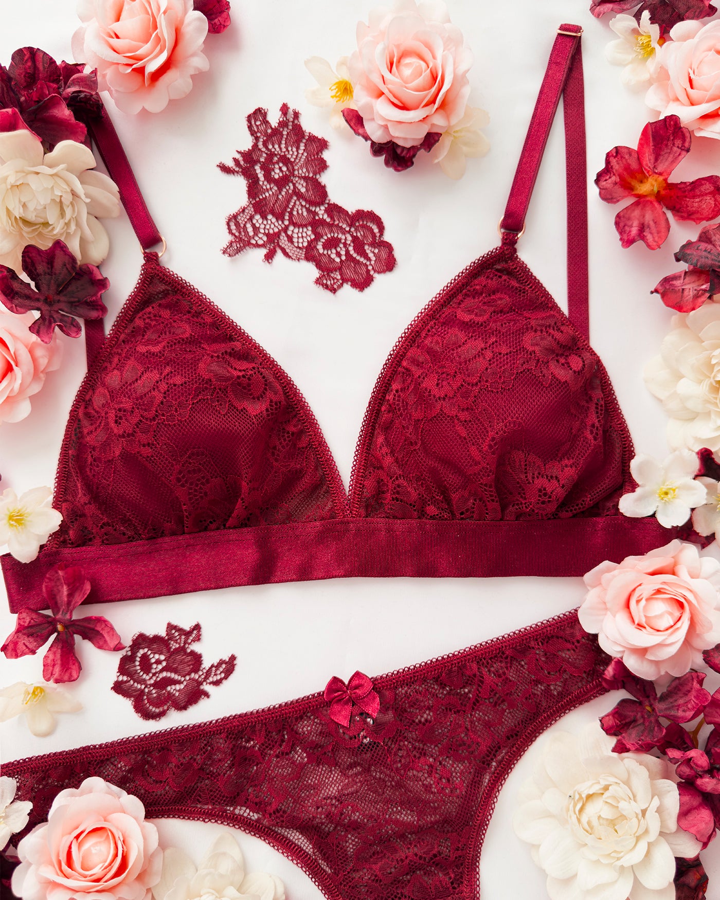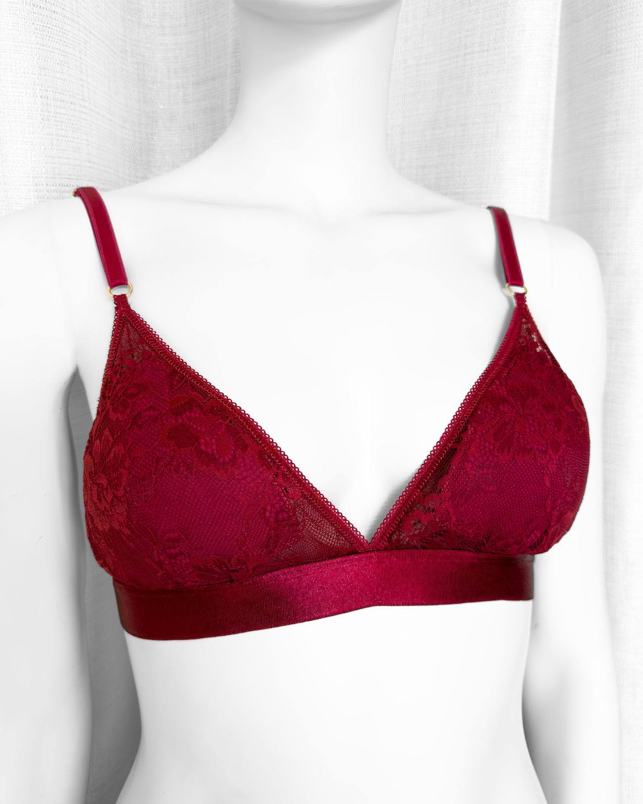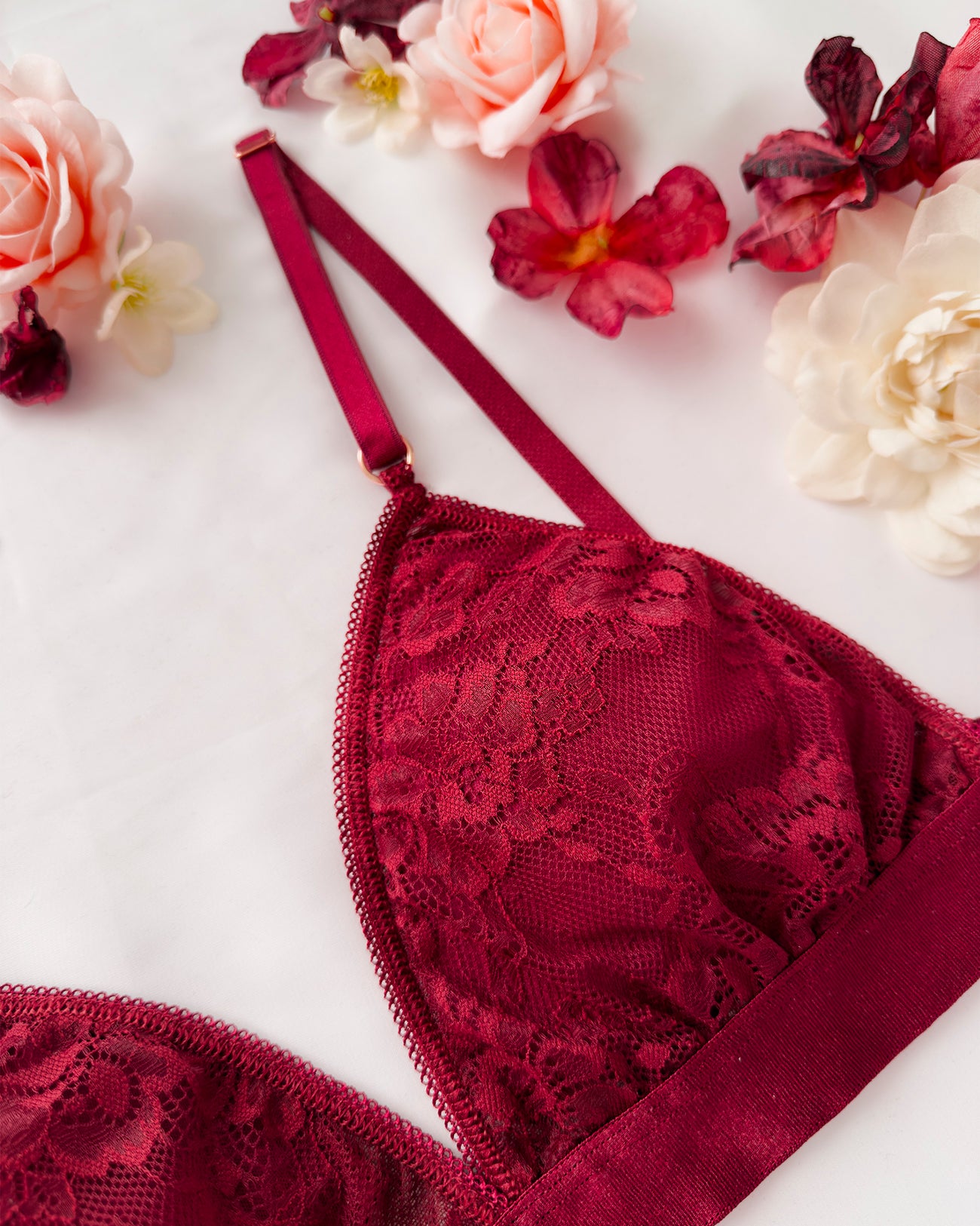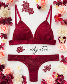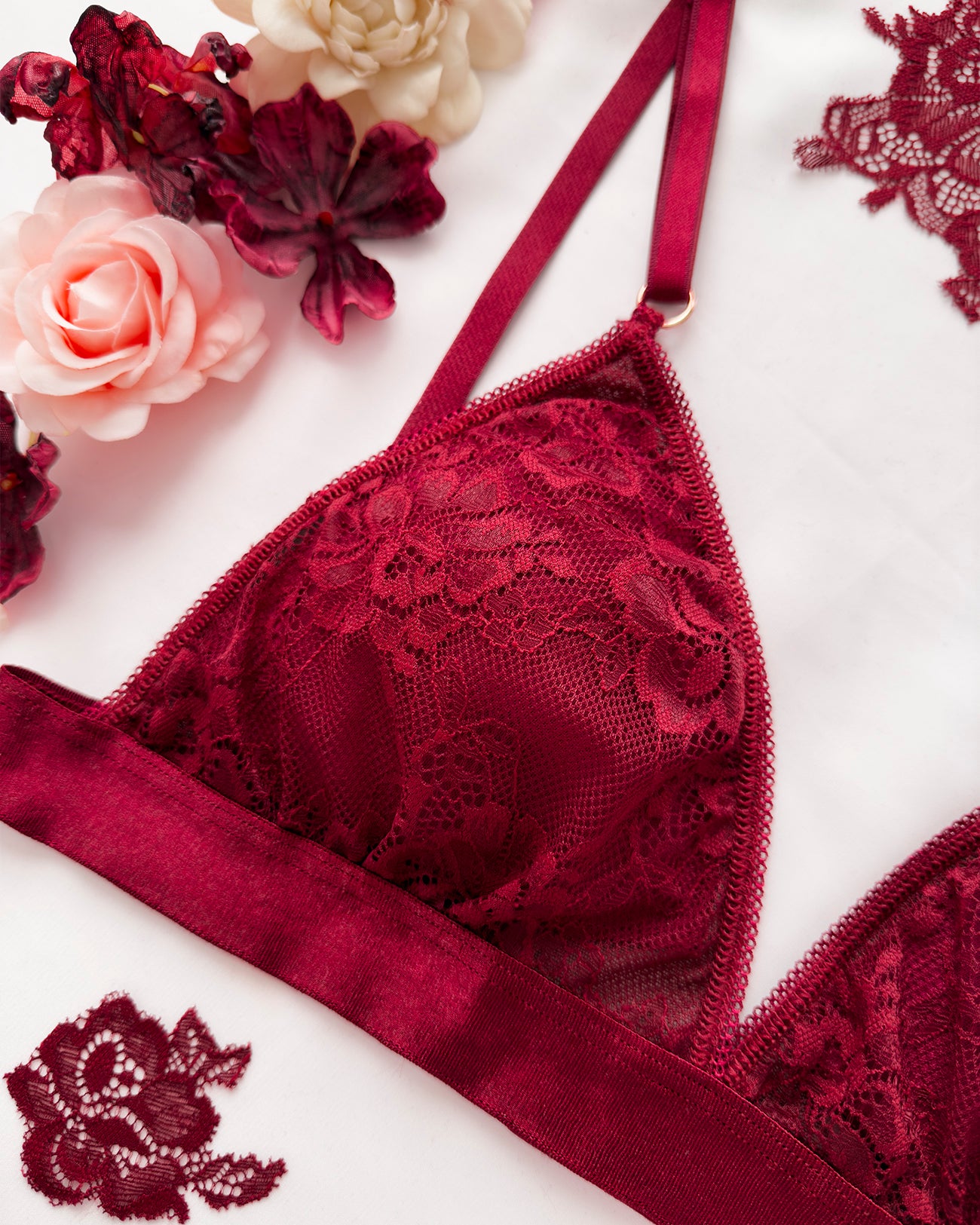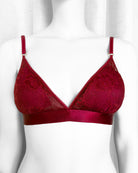 Reggiseno a triangolo senza ferretto con imbottitura estraibile in pizzo bordeaux con elegante motivo floreale tono su tono. Pizzo prezioso con dettagli in rilievo.