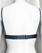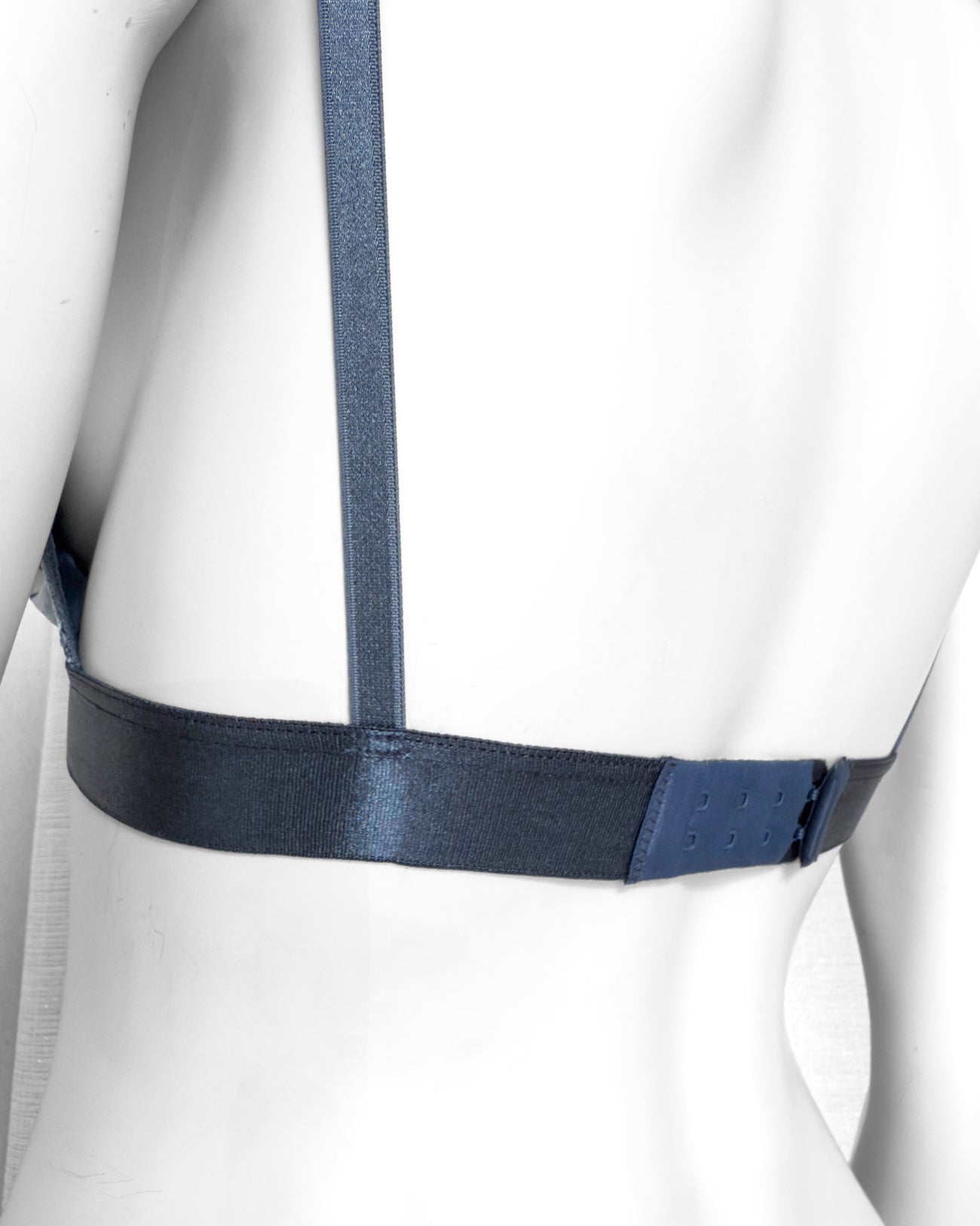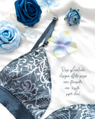 Reggiseno a triangolo senza ferretto con imbottitura estraibile in prezioso raso elasticizzato bicolor argento/blu notte con elegante motivo a ventaglio (il raso non è stampato, il motivo è intrecciato: il capo è splendido e morbidissimo anche all'interno!).