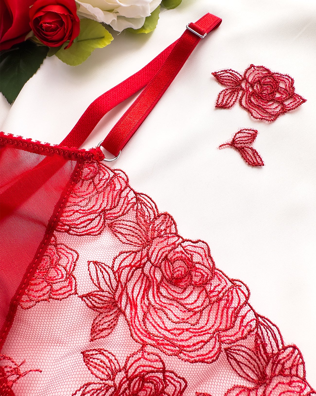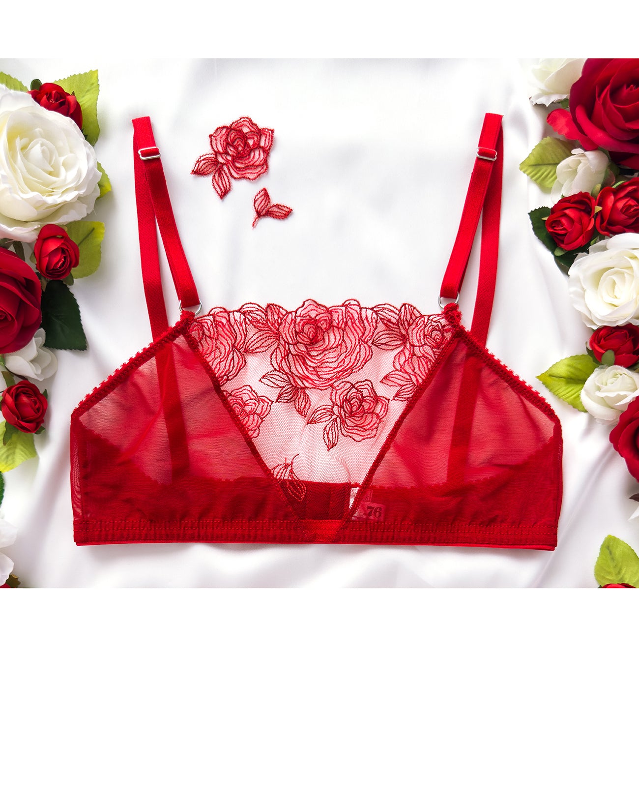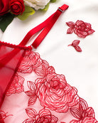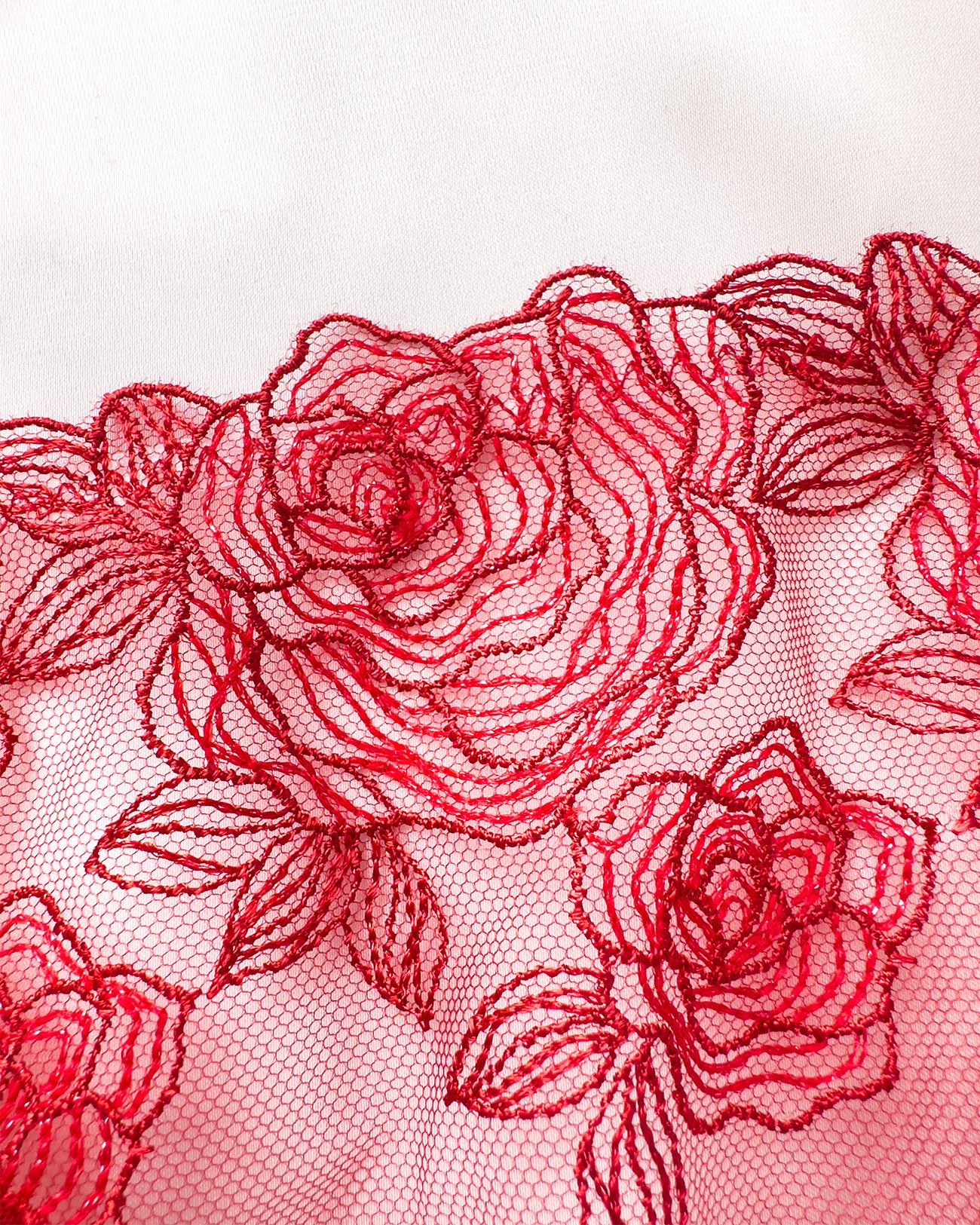 Meravigliose rose rosse ricamate su tulle morbidissimo. Inserti lurex: le rose brillano per davvero! Ricamo rigorosamente 100% made in Italy. Una linea da collezione!
