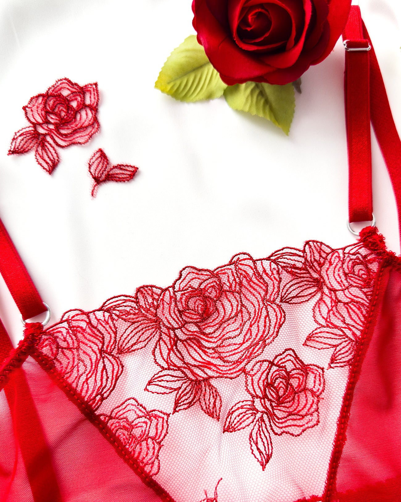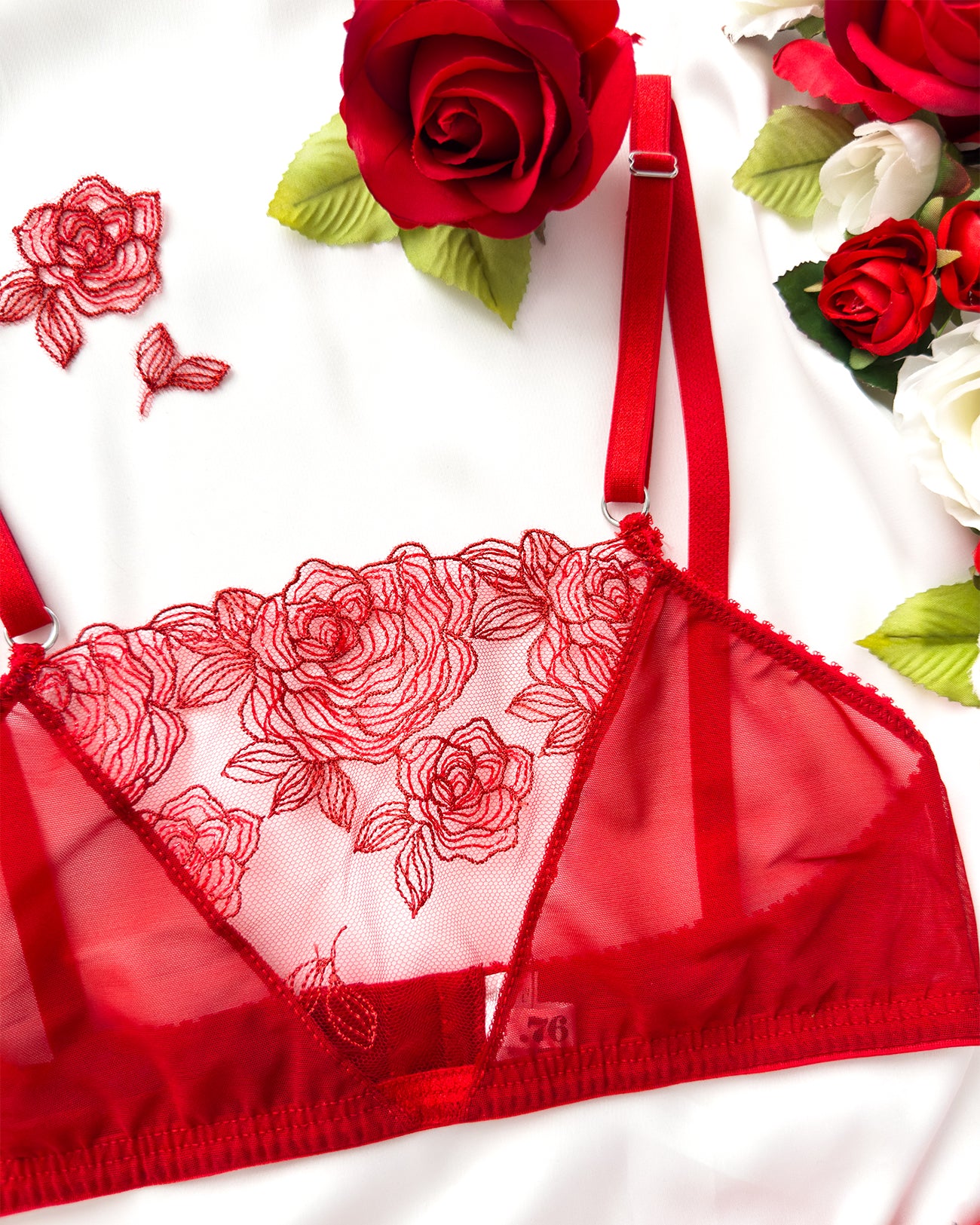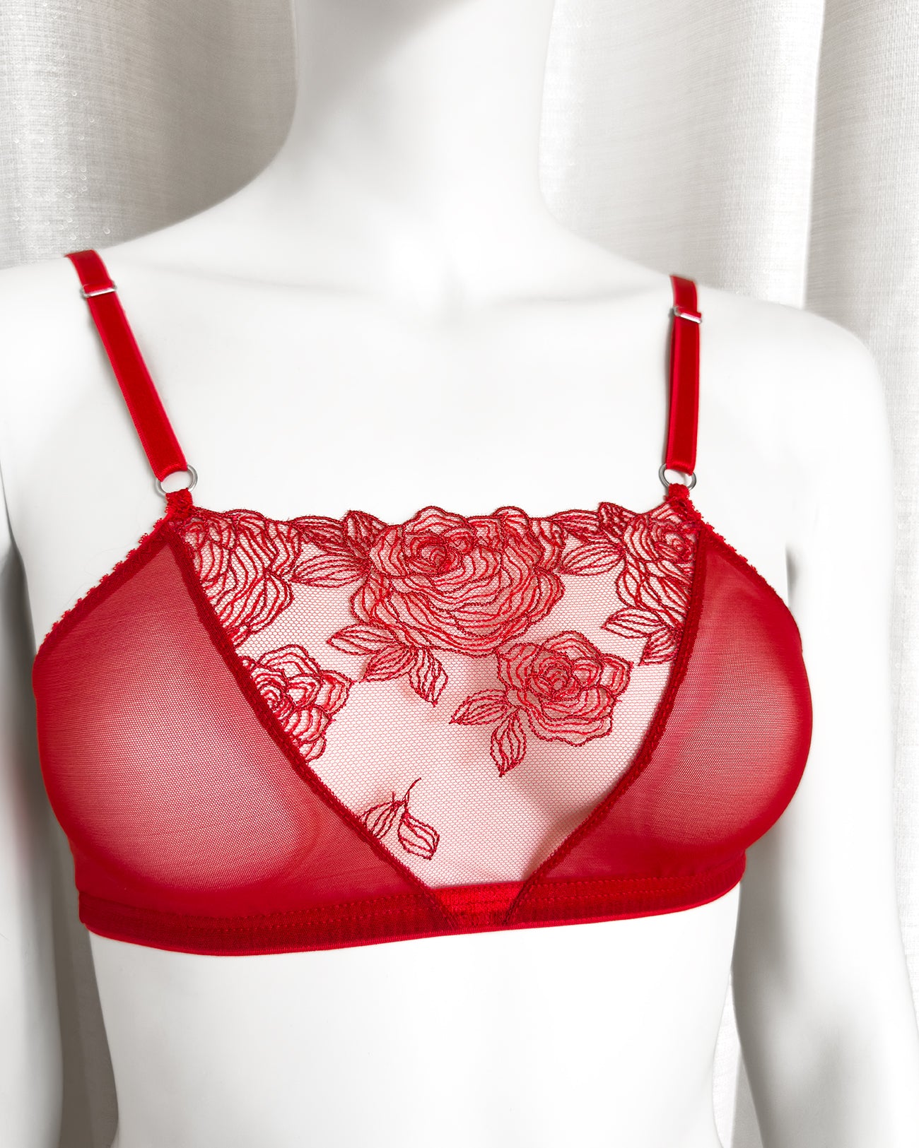 Meravigliose rose rosse ricamate su tulle morbidissimo. Inserti lurex: le rose brillano per davvero! Ricamo rigorosamente 100% made in Italy. Una linea da collezione!