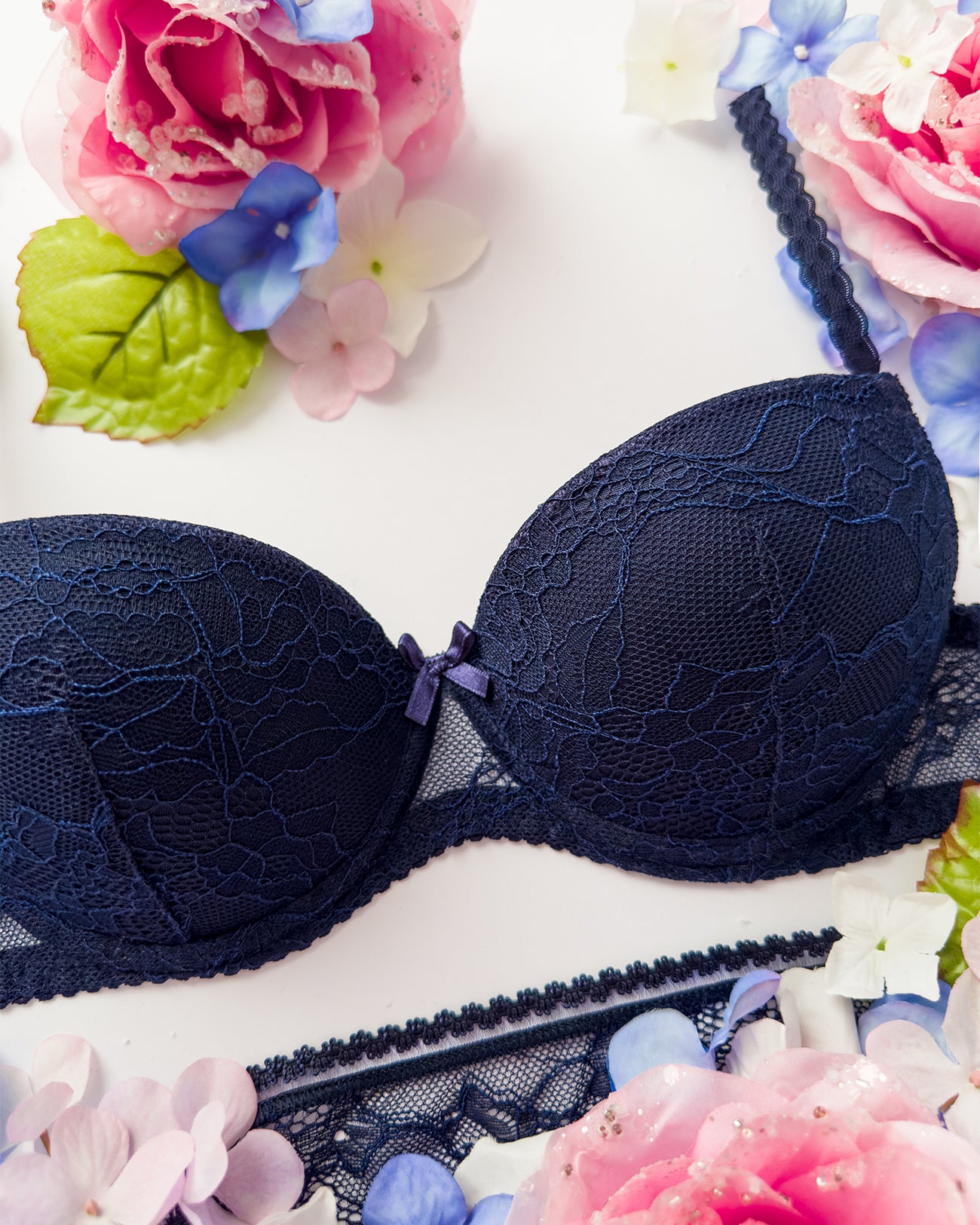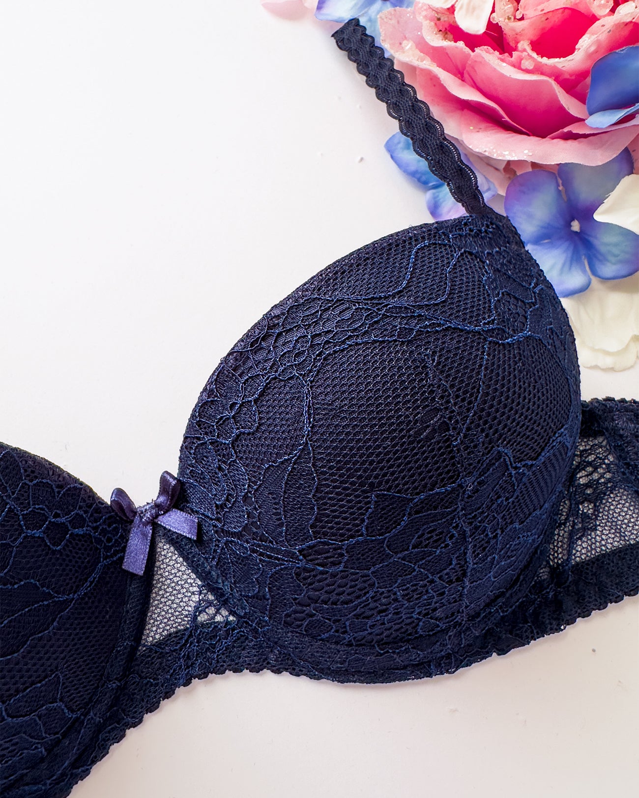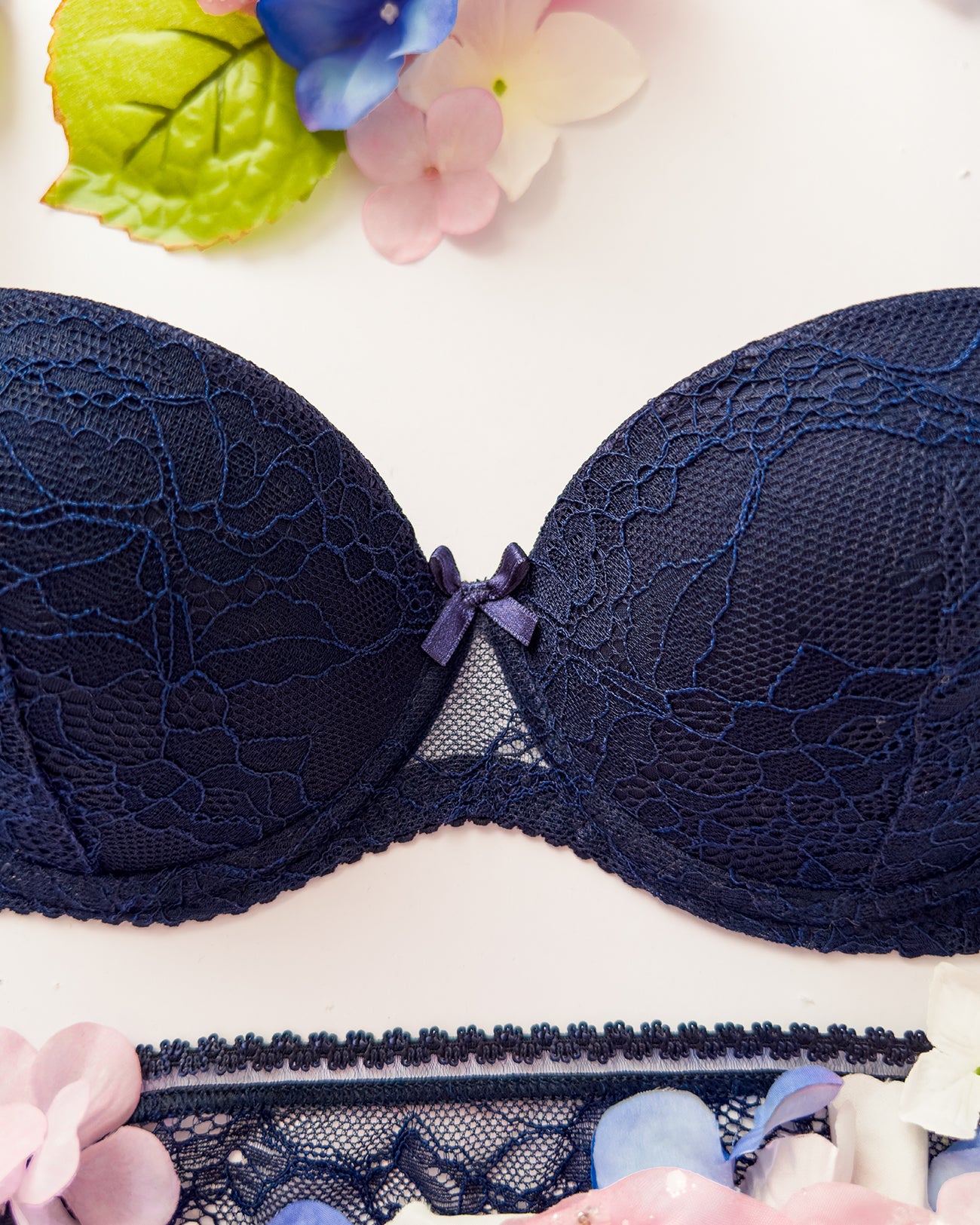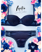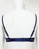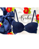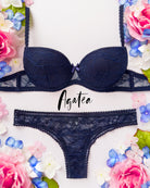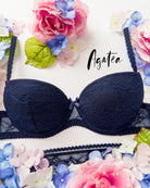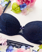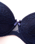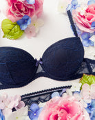 Reggiseno push-up realizzato interamente in pizzo blu notte con elegante motivo floreale tono su tono