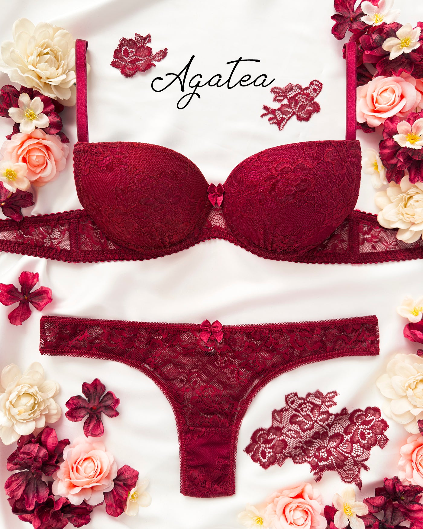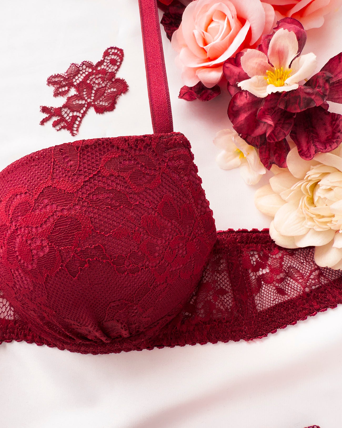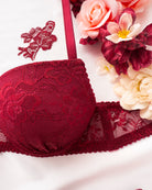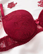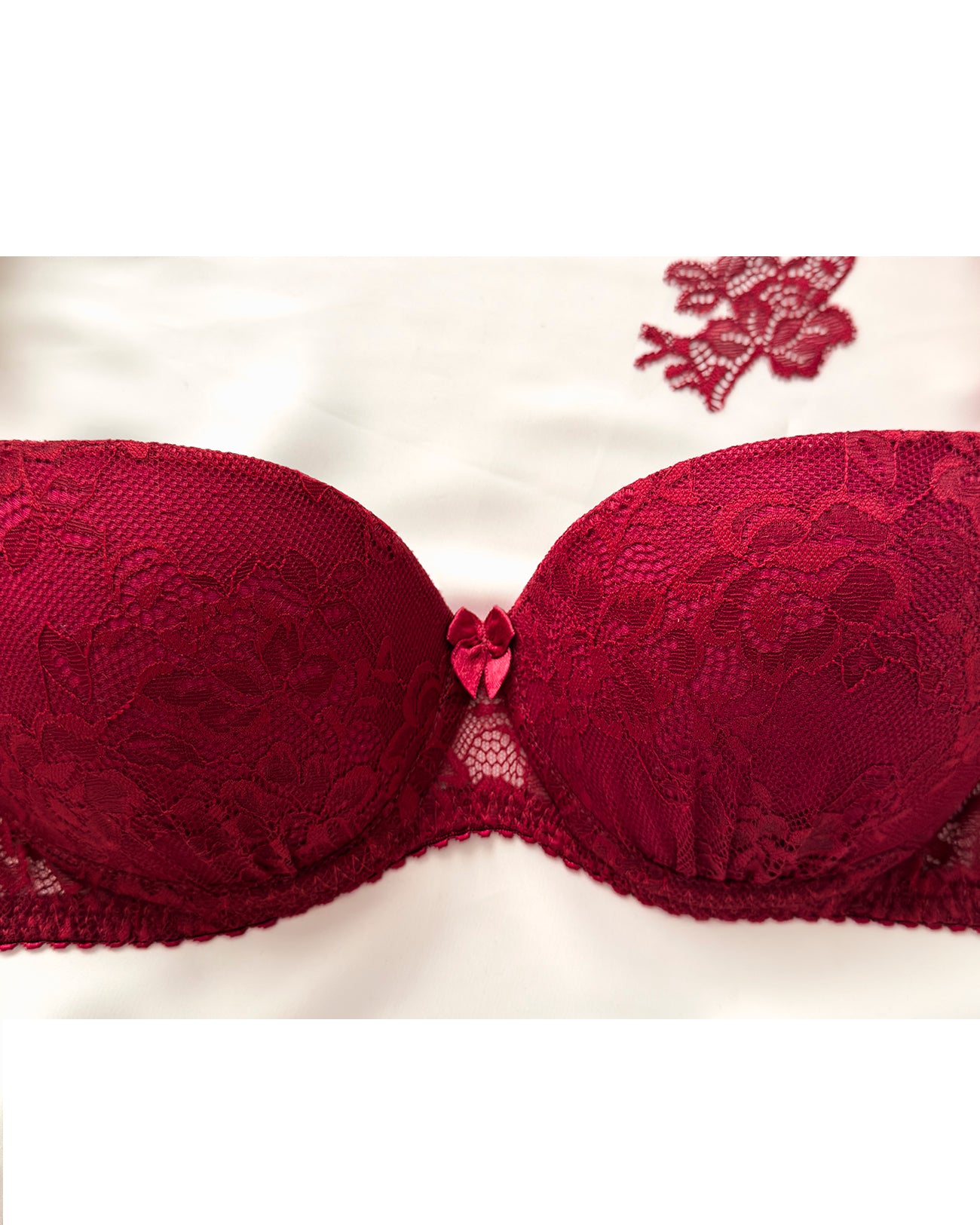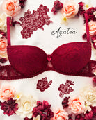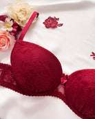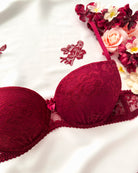 Reggiseno push-up realizzato interamente in pizzo bordeaux con elegante motivo floreale tono su tono. Deliziosa lavorazione a pacchetto della coppa che evita qualsiasi taglio ed esalta il disegno. Pizzo prezioso con dettagli in rilievo. Fiocco centrale in raso bordeaux.