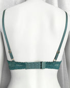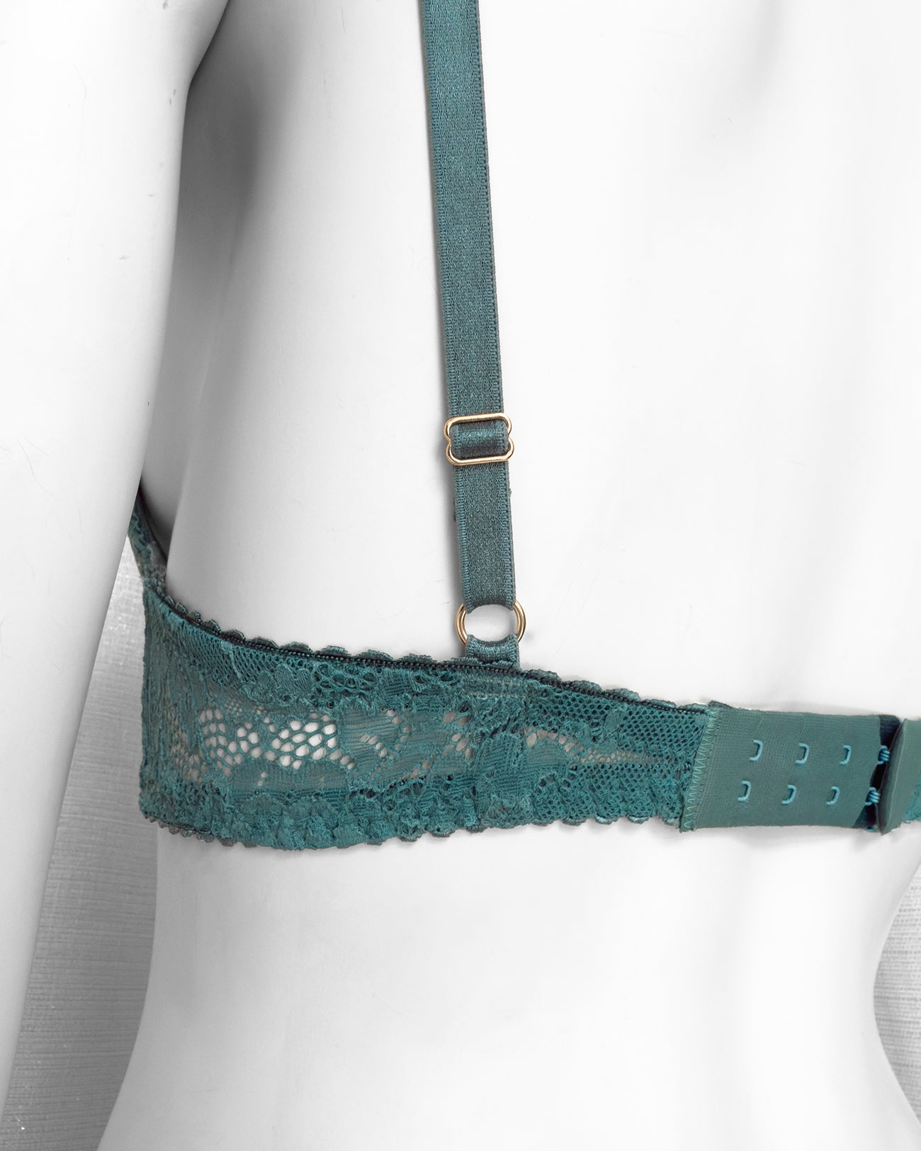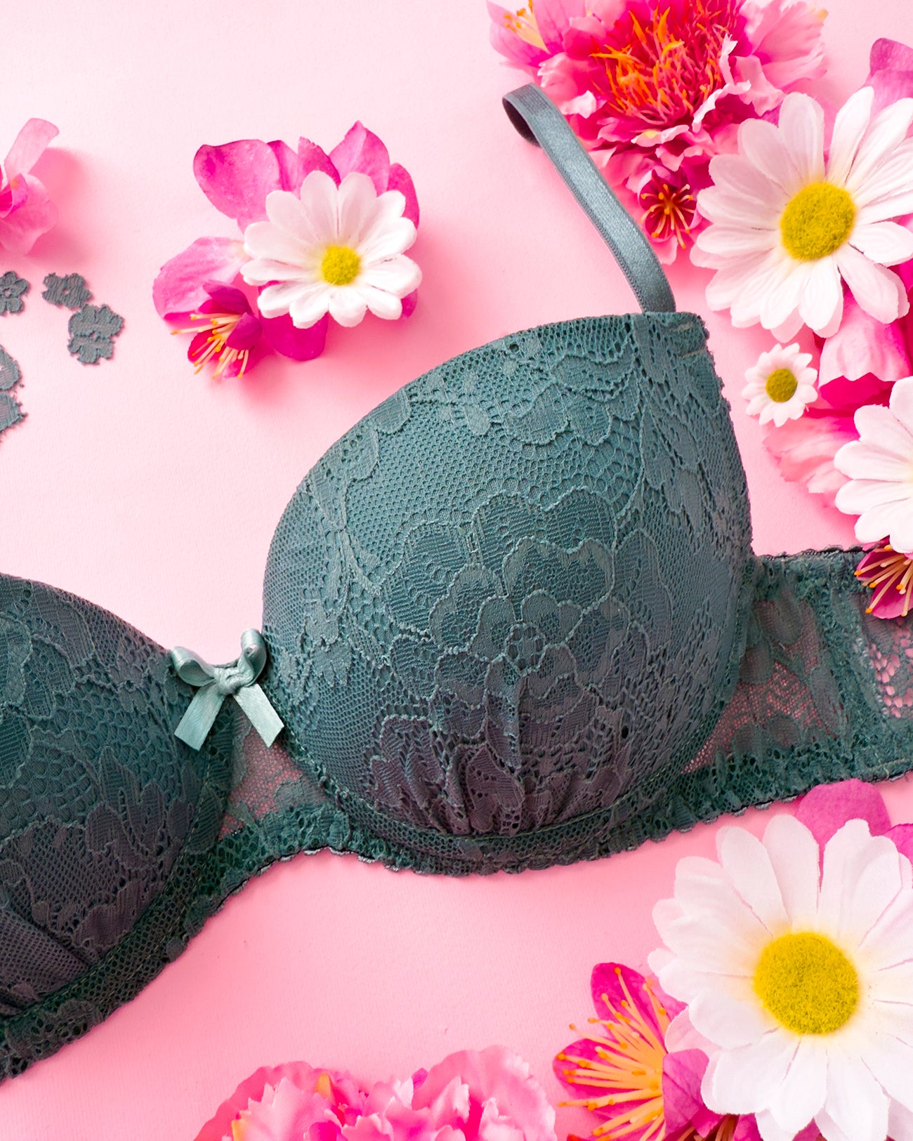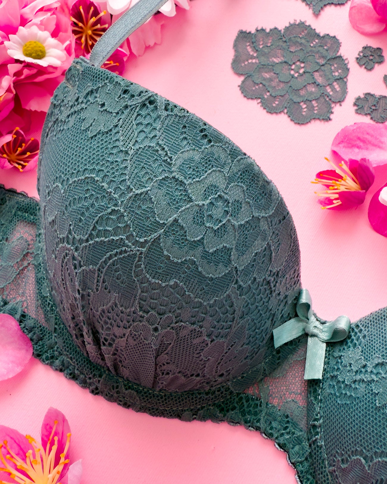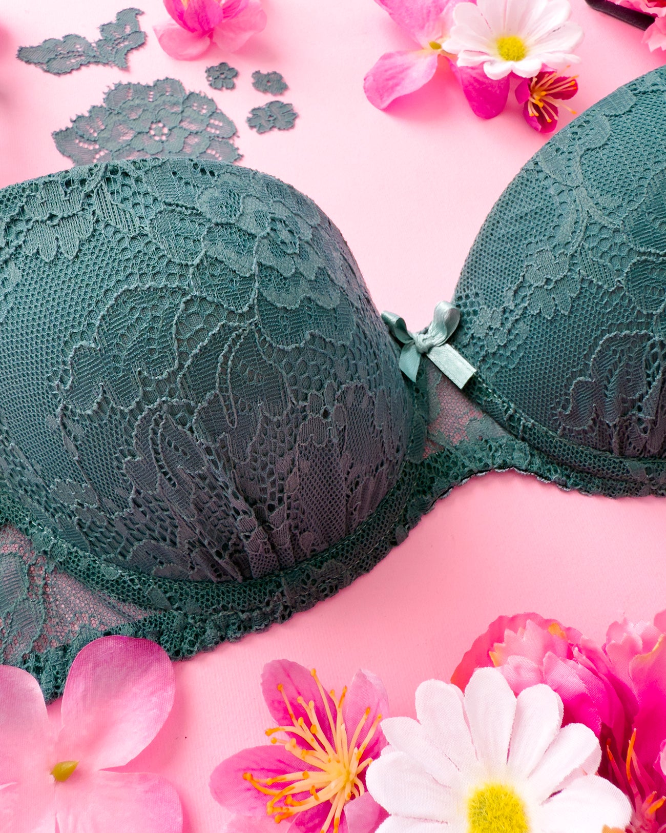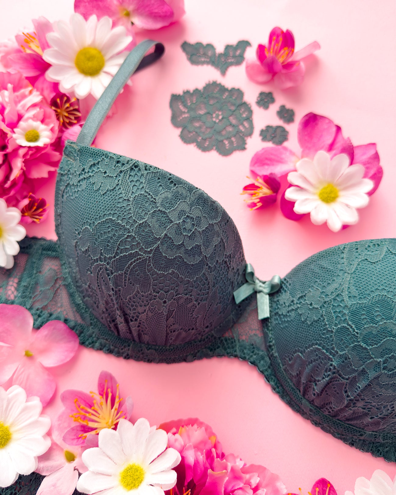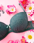 Reggiseno push-up realizzato interamente in pizzo verde salvia con elegante motivo floreale tono su tono. Deliziosa lavorazione a pacchetto della coppa che evita qualsiasi taglio ed esalta il disegno. Pizzo prezioso con dettagli in rilievo. Fiocco centrale in raso tono su tono.