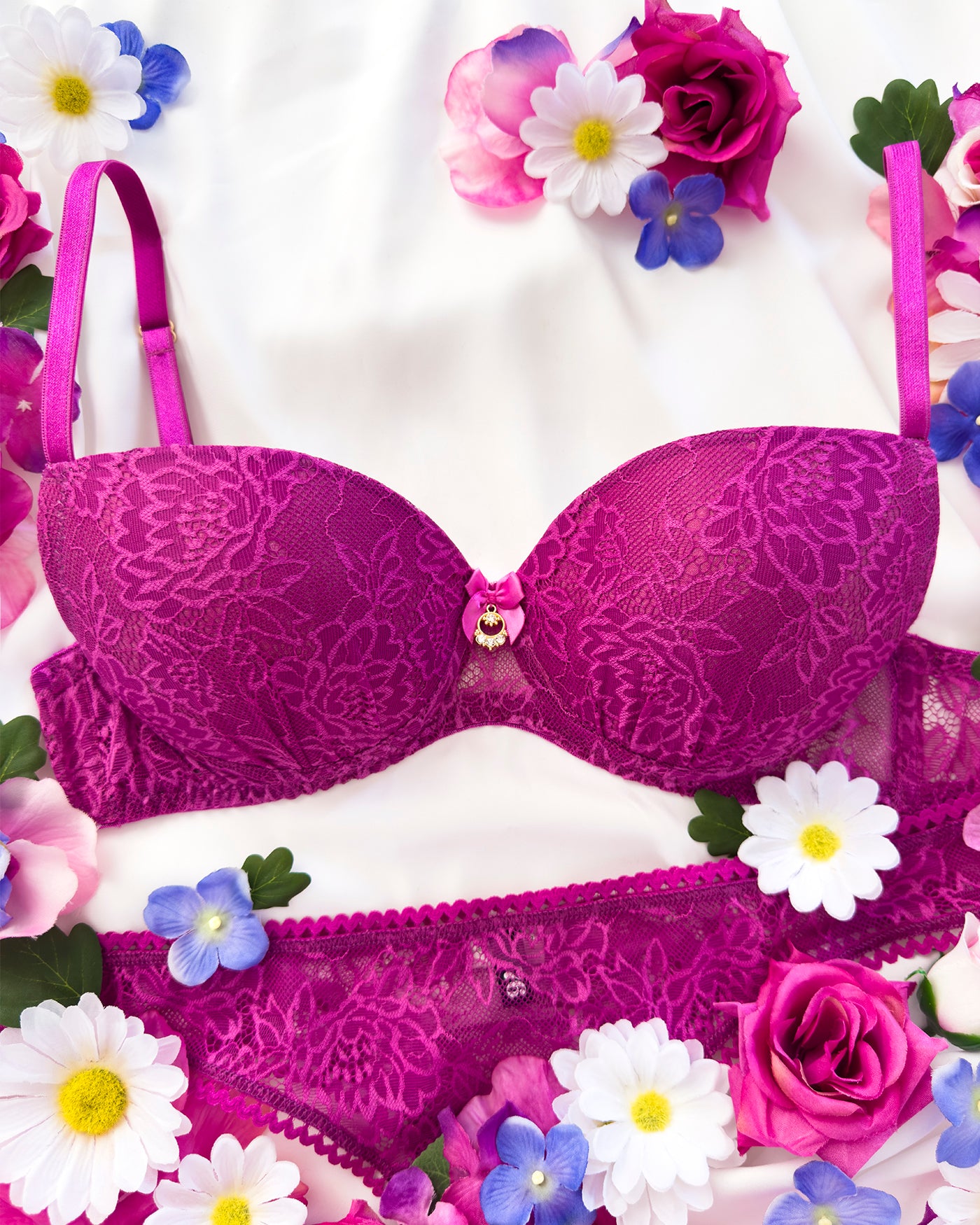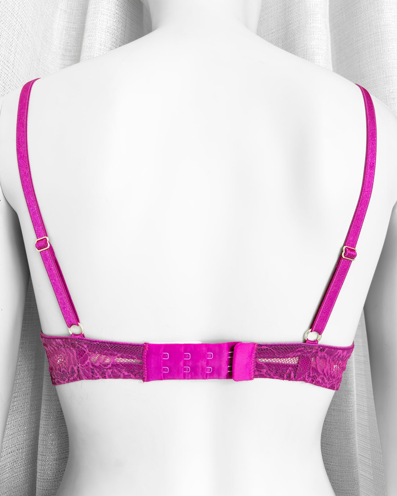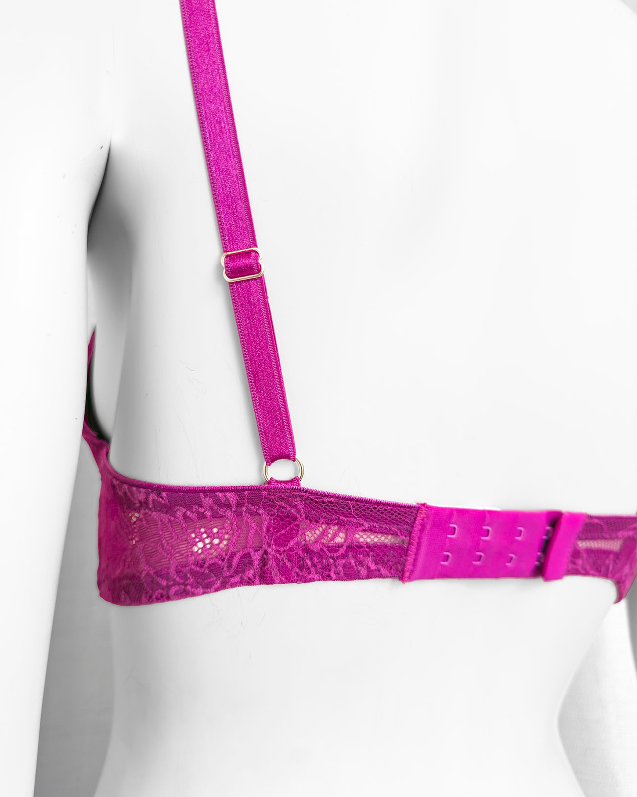 Super pizzo magenta: un colore speciale per un pizzo inedito che regala un originale effetto bicromatico per esaltare il disegno floreale. Il tocco in più? Un fiocco gioiello INCANTEVOLE!