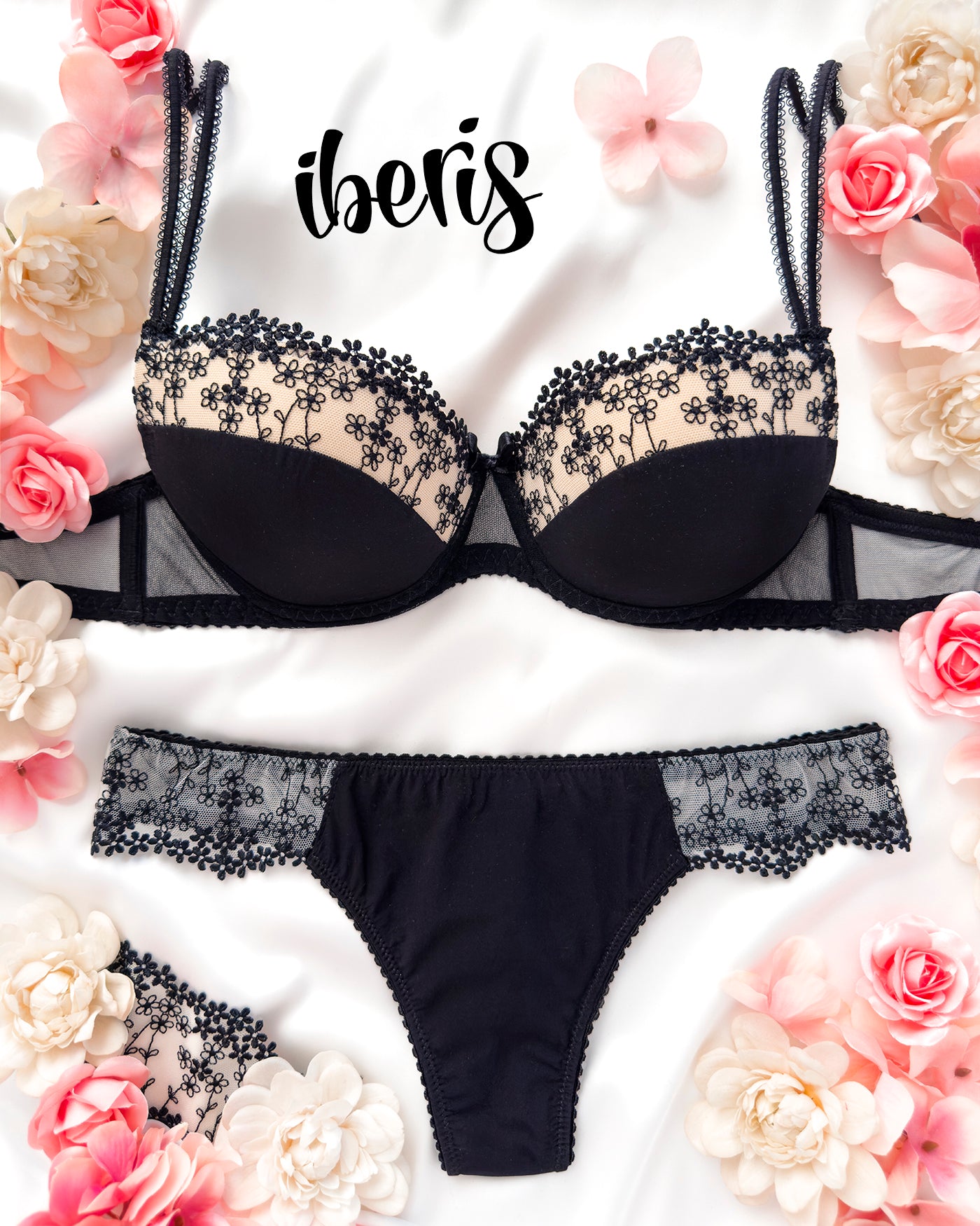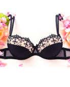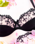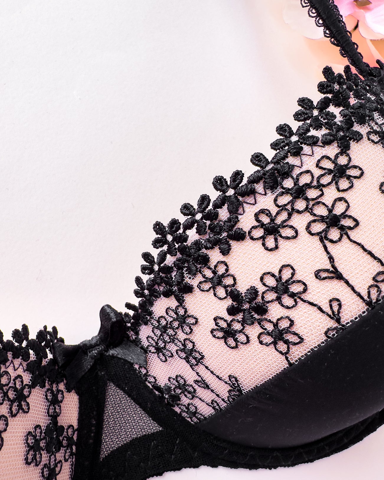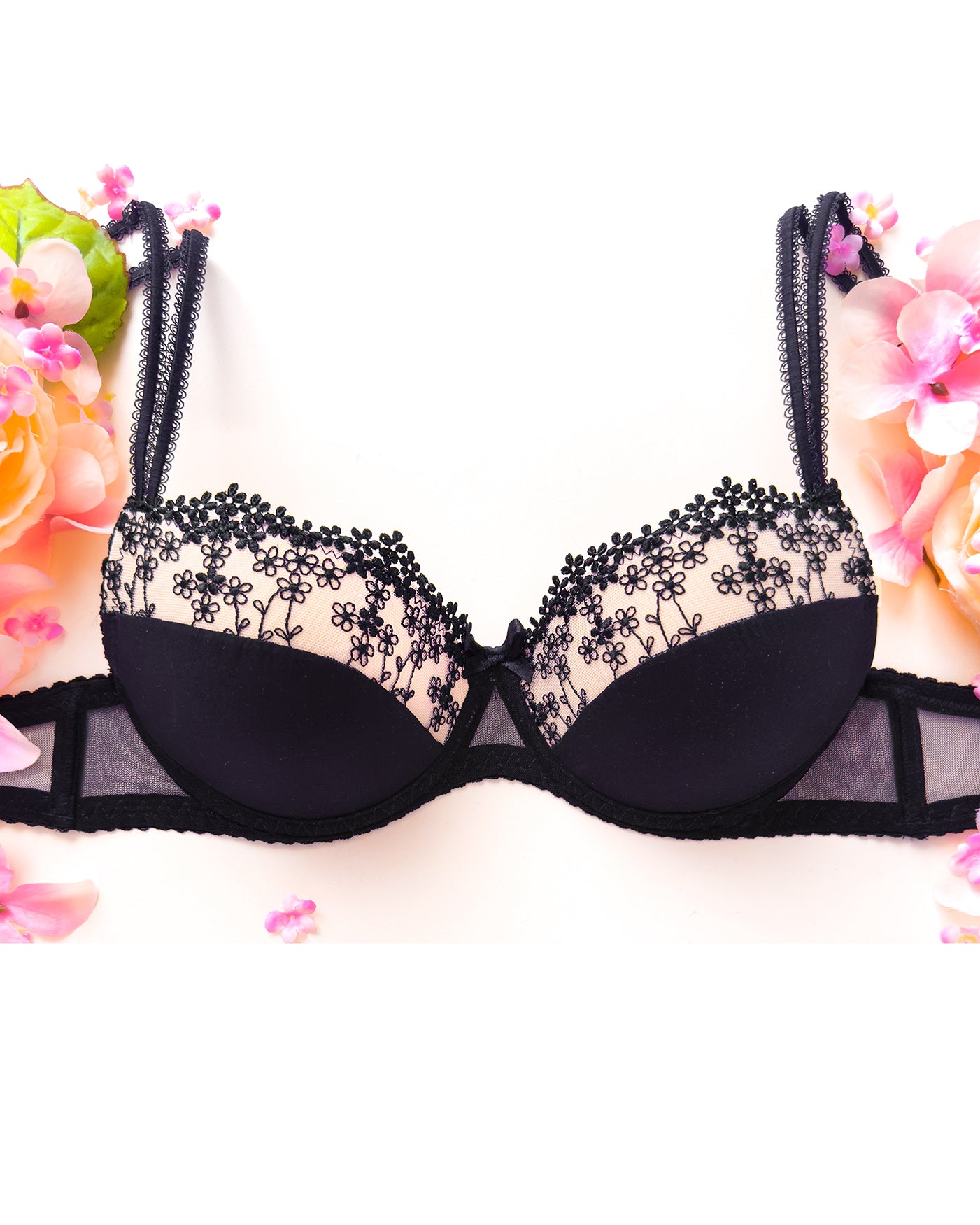 Reggiseno push-up con ferretto realizzato in soffice tessuto nero opaco elasticizzato e con smerlo ricamato. Deliziosi fiorellini neri ricamati su tulle decorano lo scollo. Fiocco centrale in raso nero.