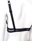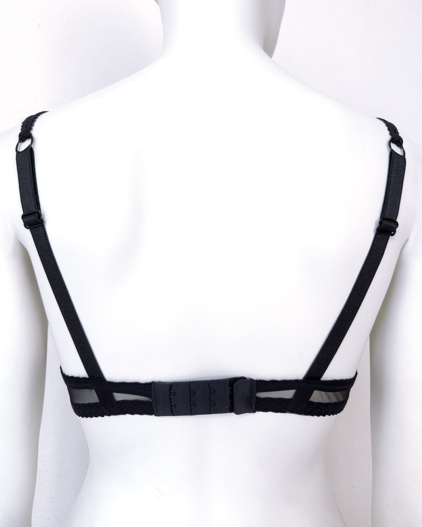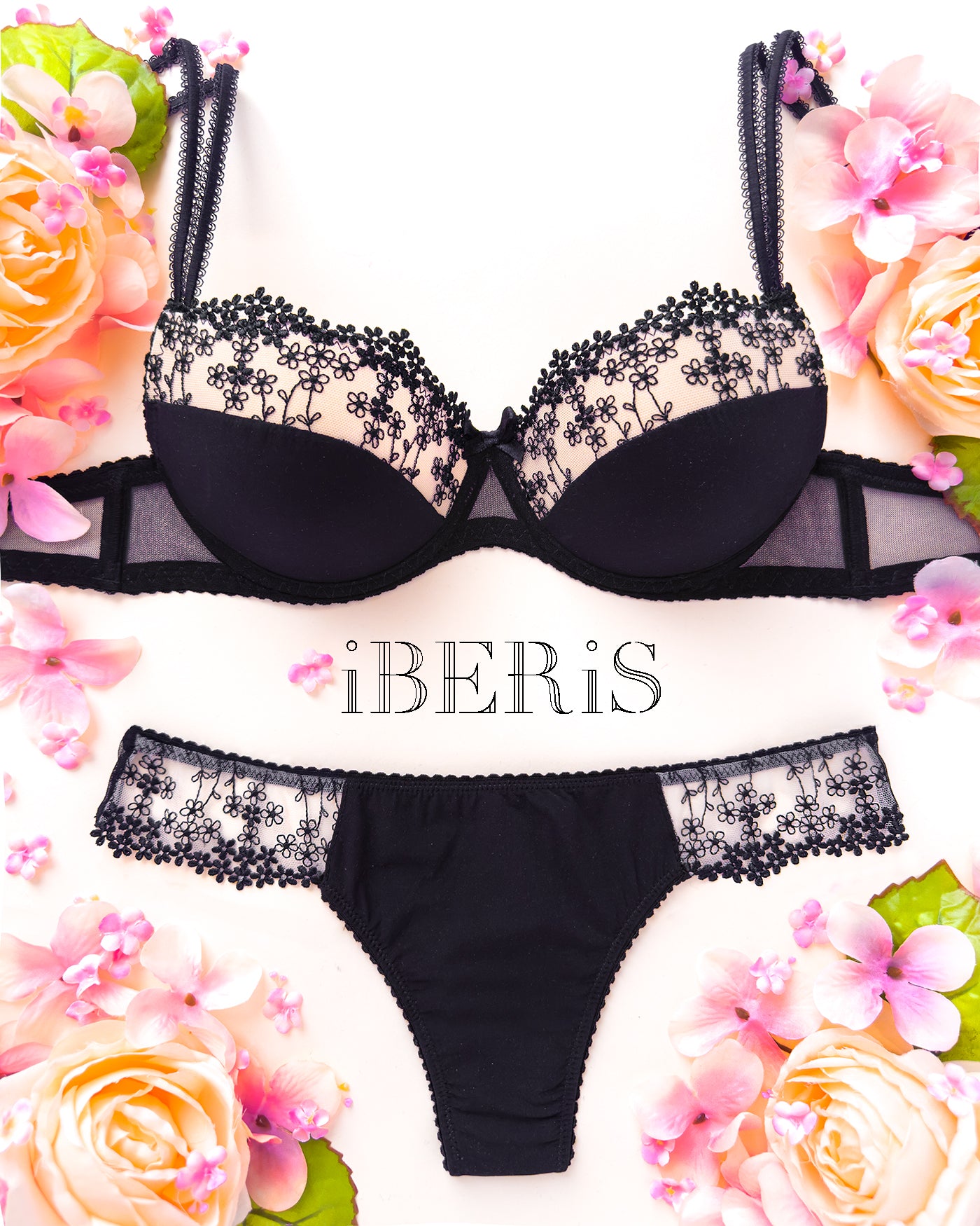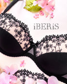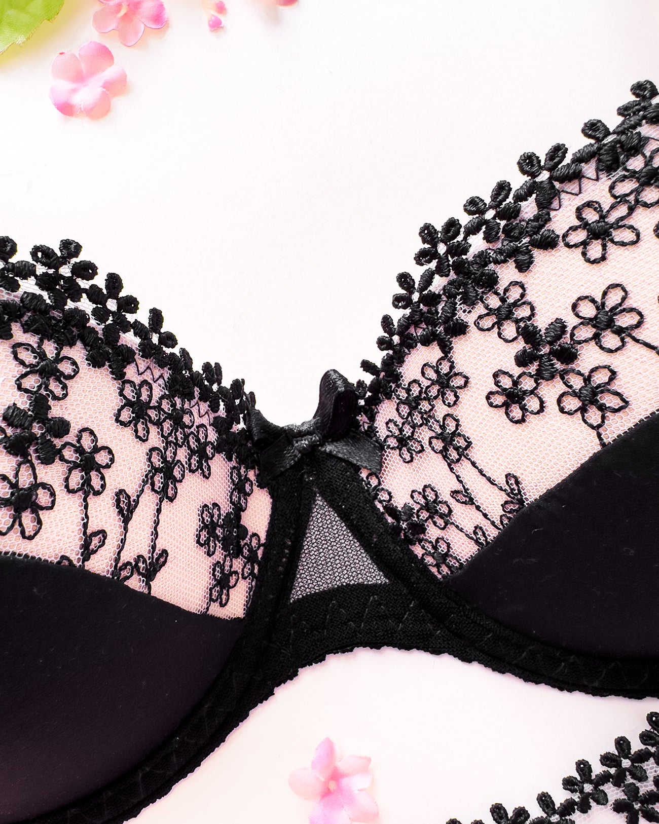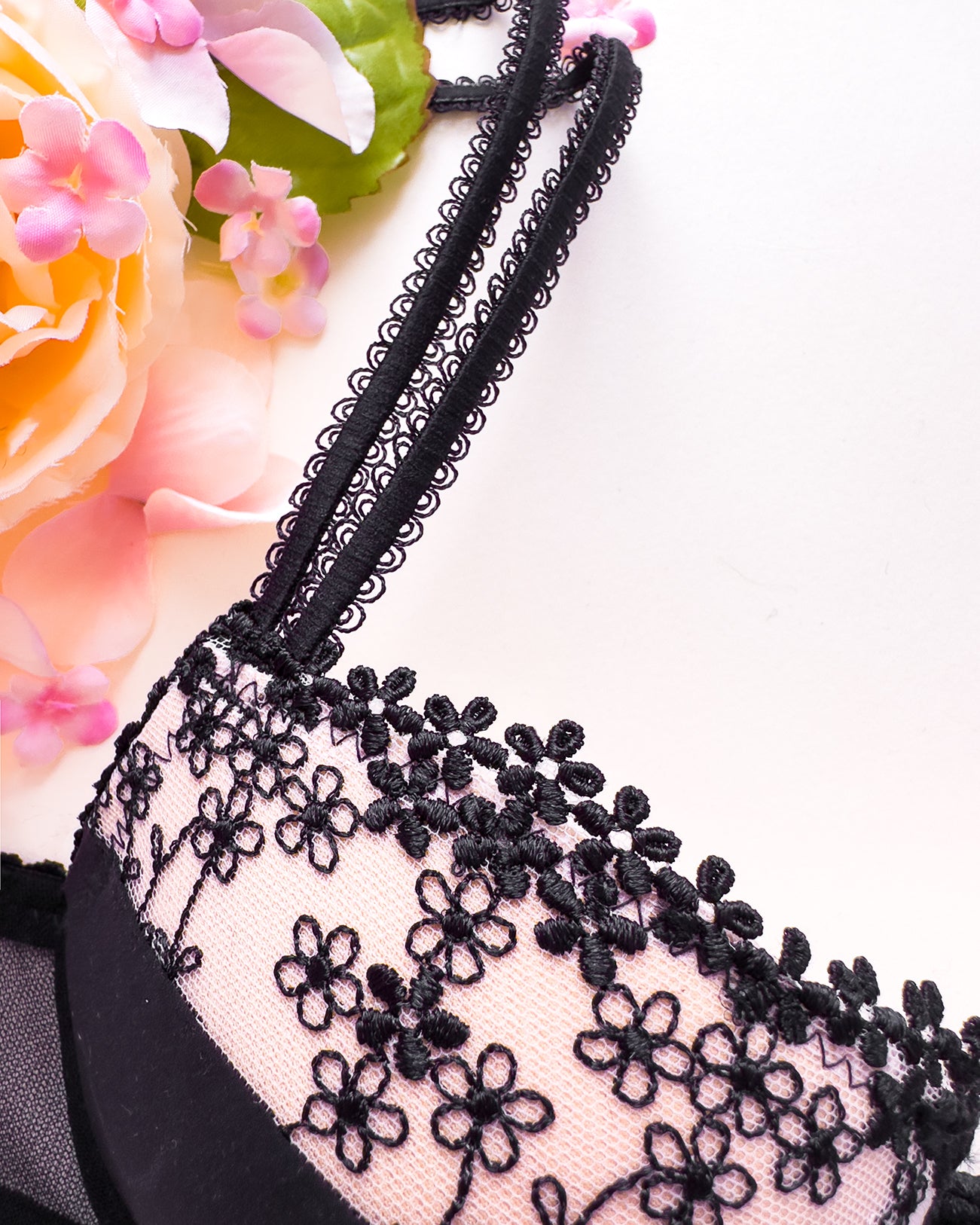 Reggiseno push-up con ferretto realizzato in soffice tessuto nero opaco elasticizzato e con smerlo ricamato. Deliziosi fiorellini neri ricamati su tulle decorano lo scollo. Fiocco centrale in raso nero.
