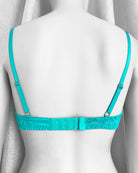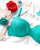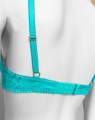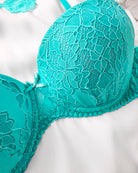 Meraviglioso pizzo color tiffany con inserti retati e disegno floreale cordonato dall'effetto tridimensionale. Onde di morbidezza, sensualità e colore: sei pronta a lasciarti accarezzare?