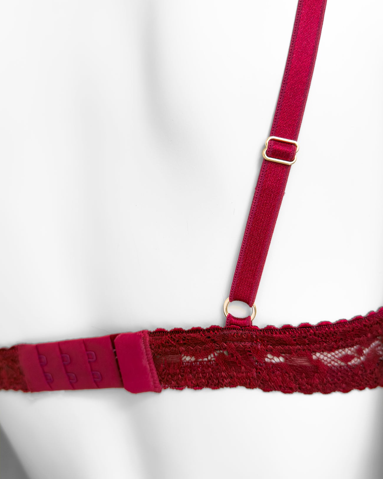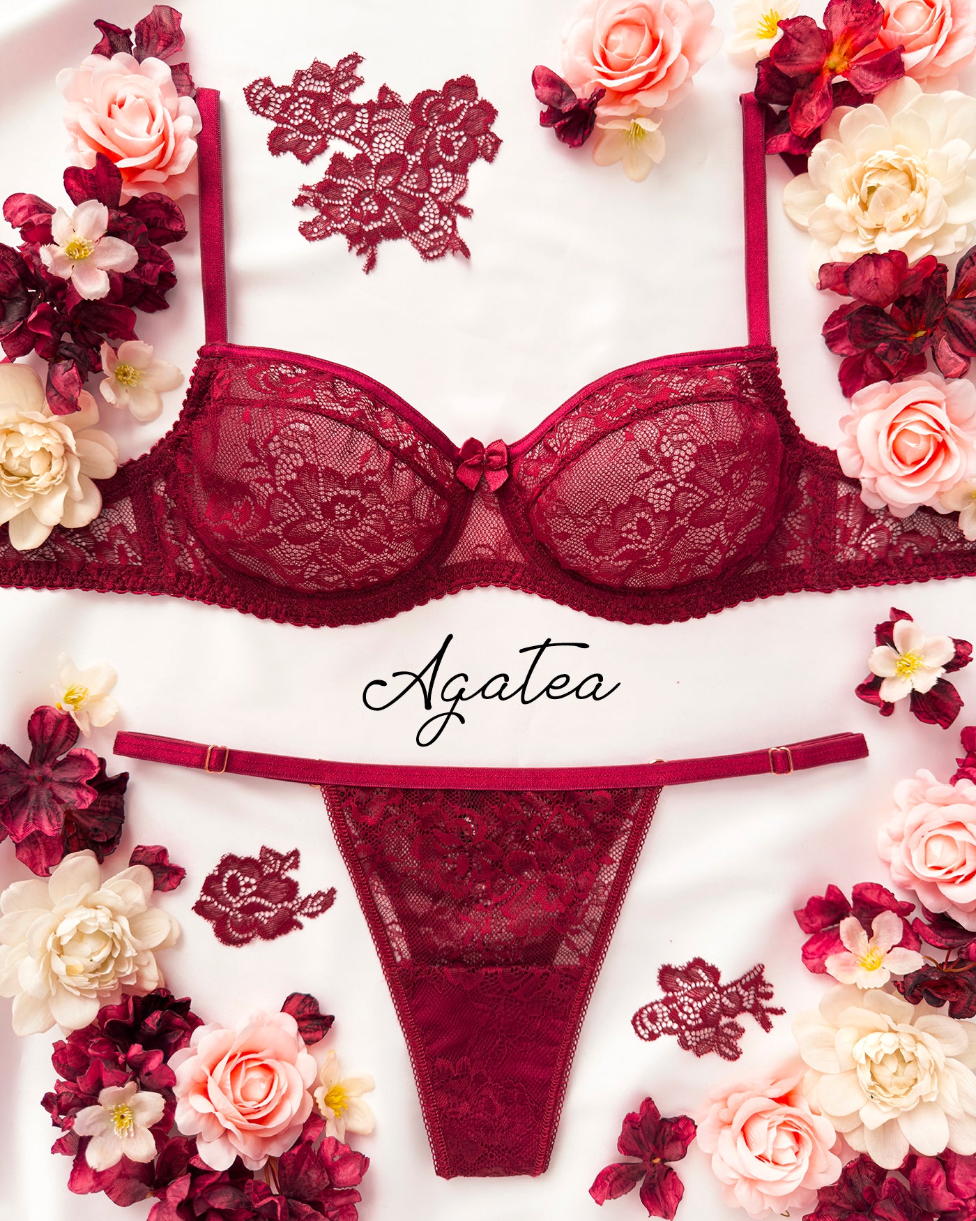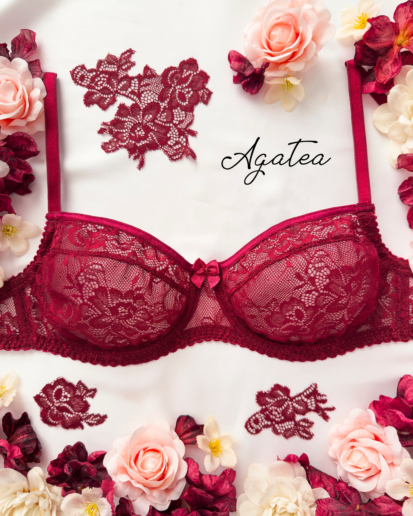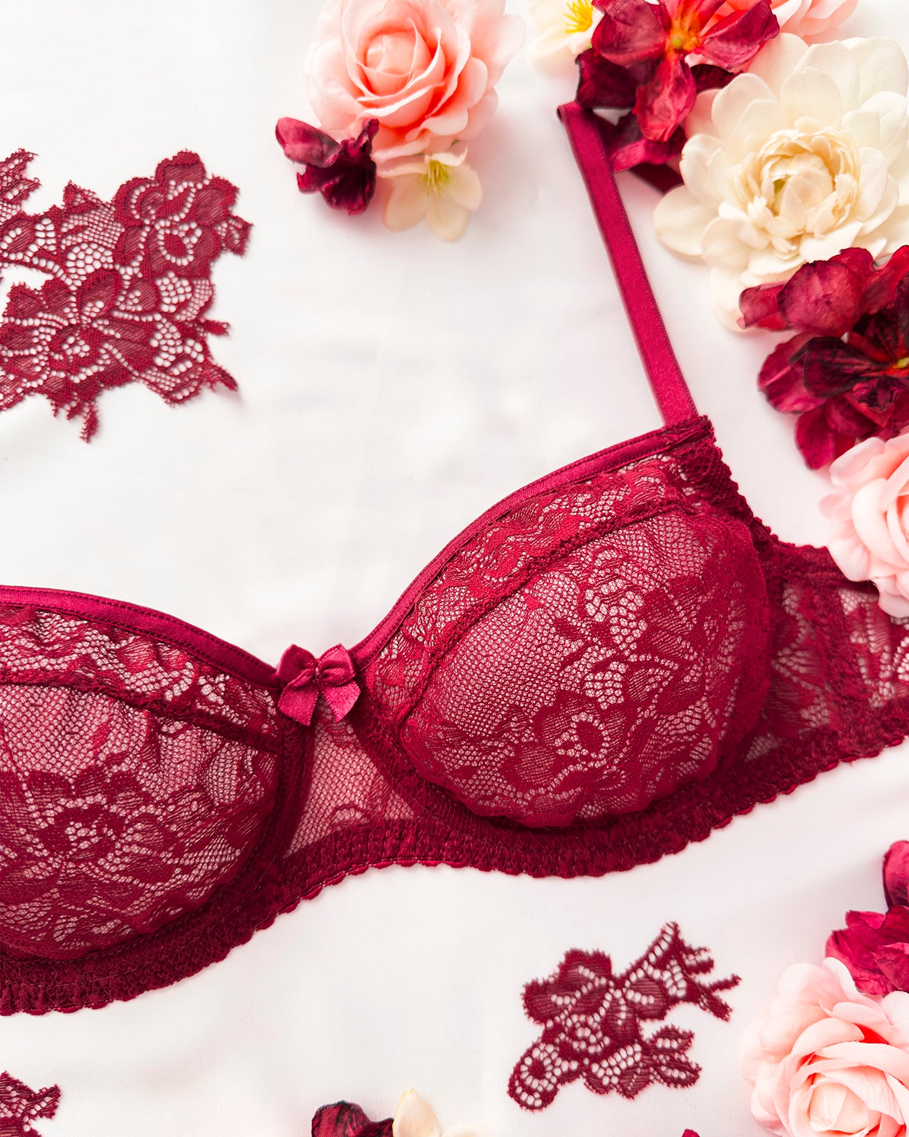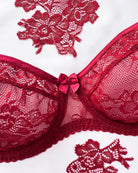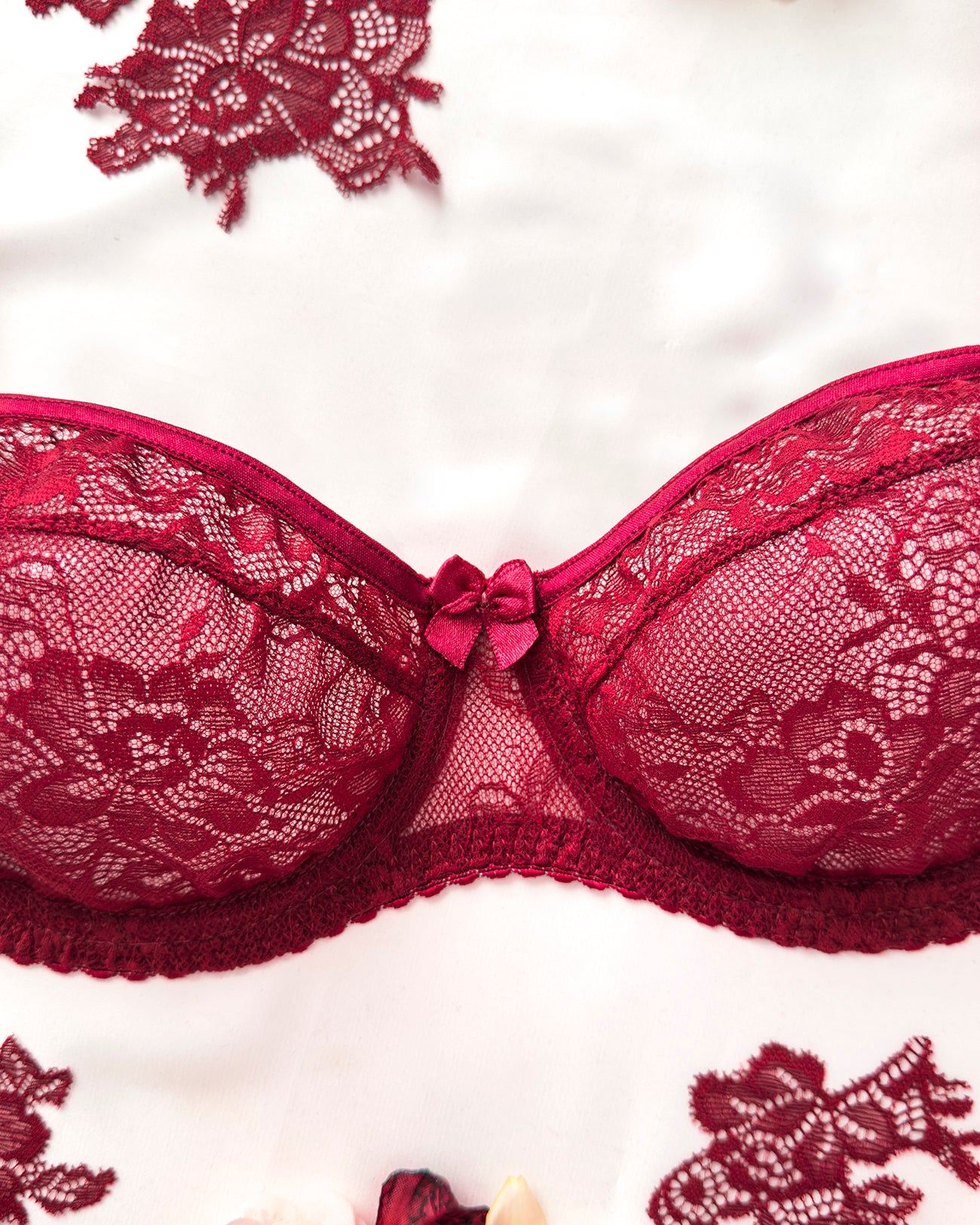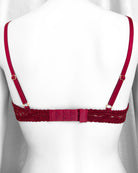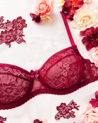 Reggiseno sfoderato con ferretto interamente in pizzo bordeaux con elegante motivo floreale tono su tono. Bordo coppa con dettaglio lucido tono su tono. Ferretto e stecchette laterali. Pizzo prezioso con dettagli in rilievo. Fiocco centrale in raso bordeaux.