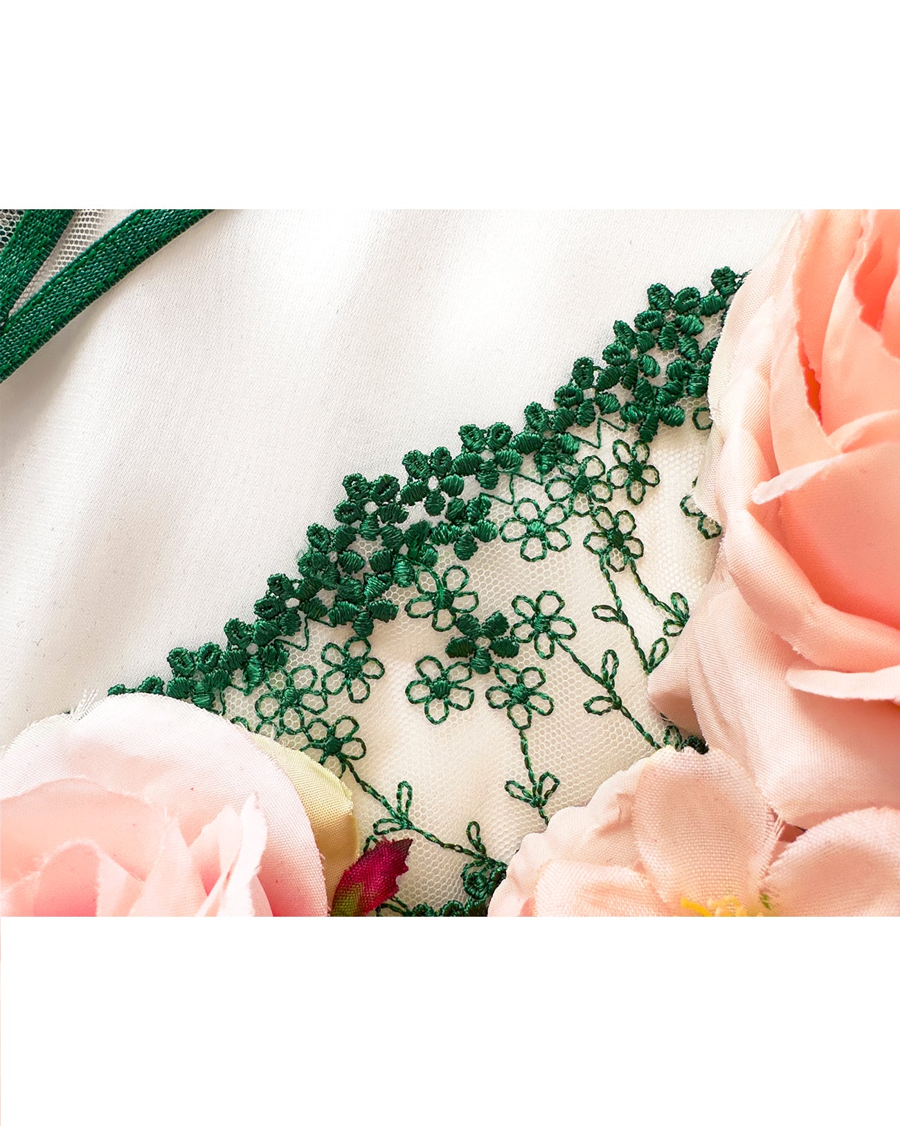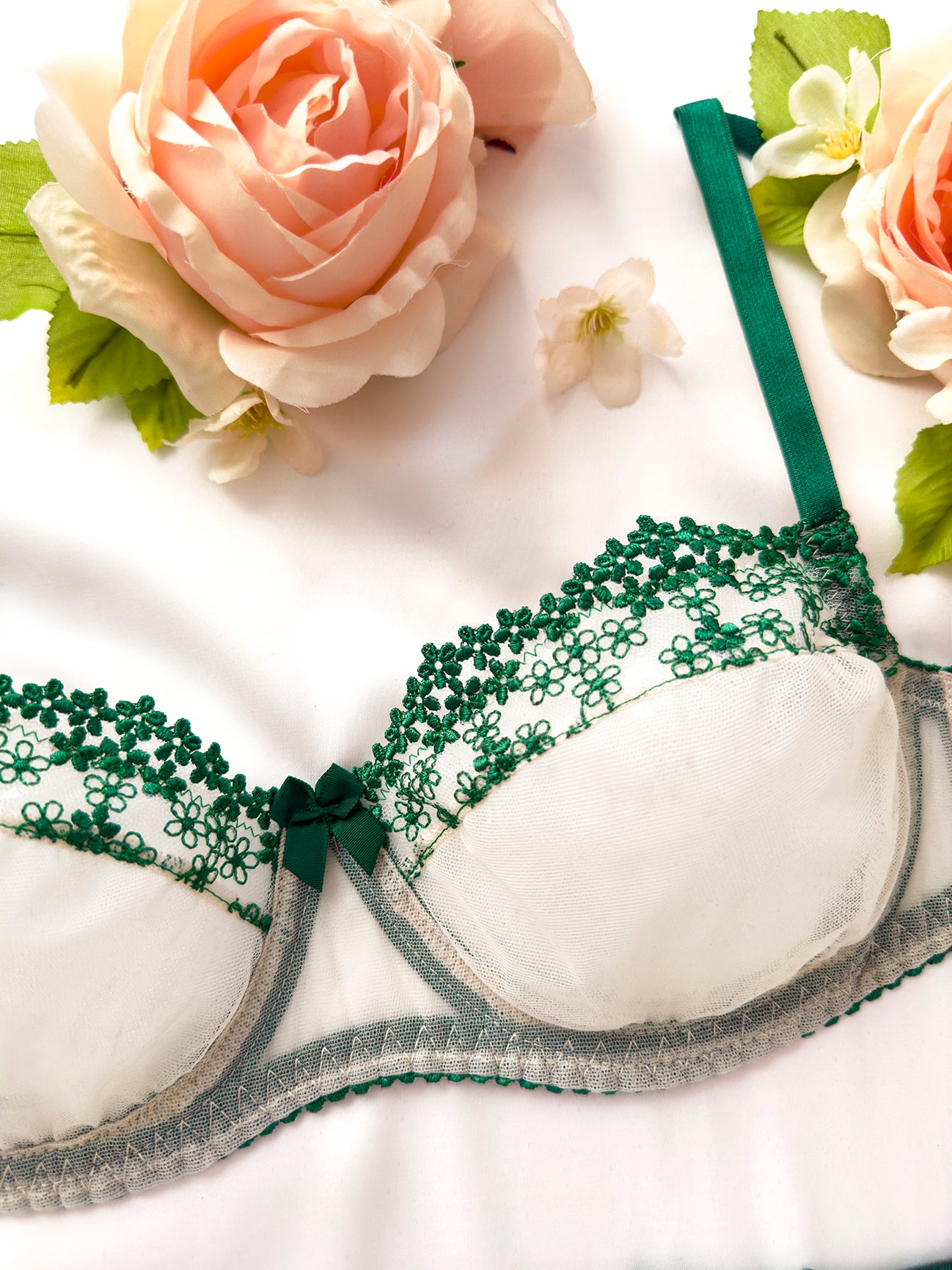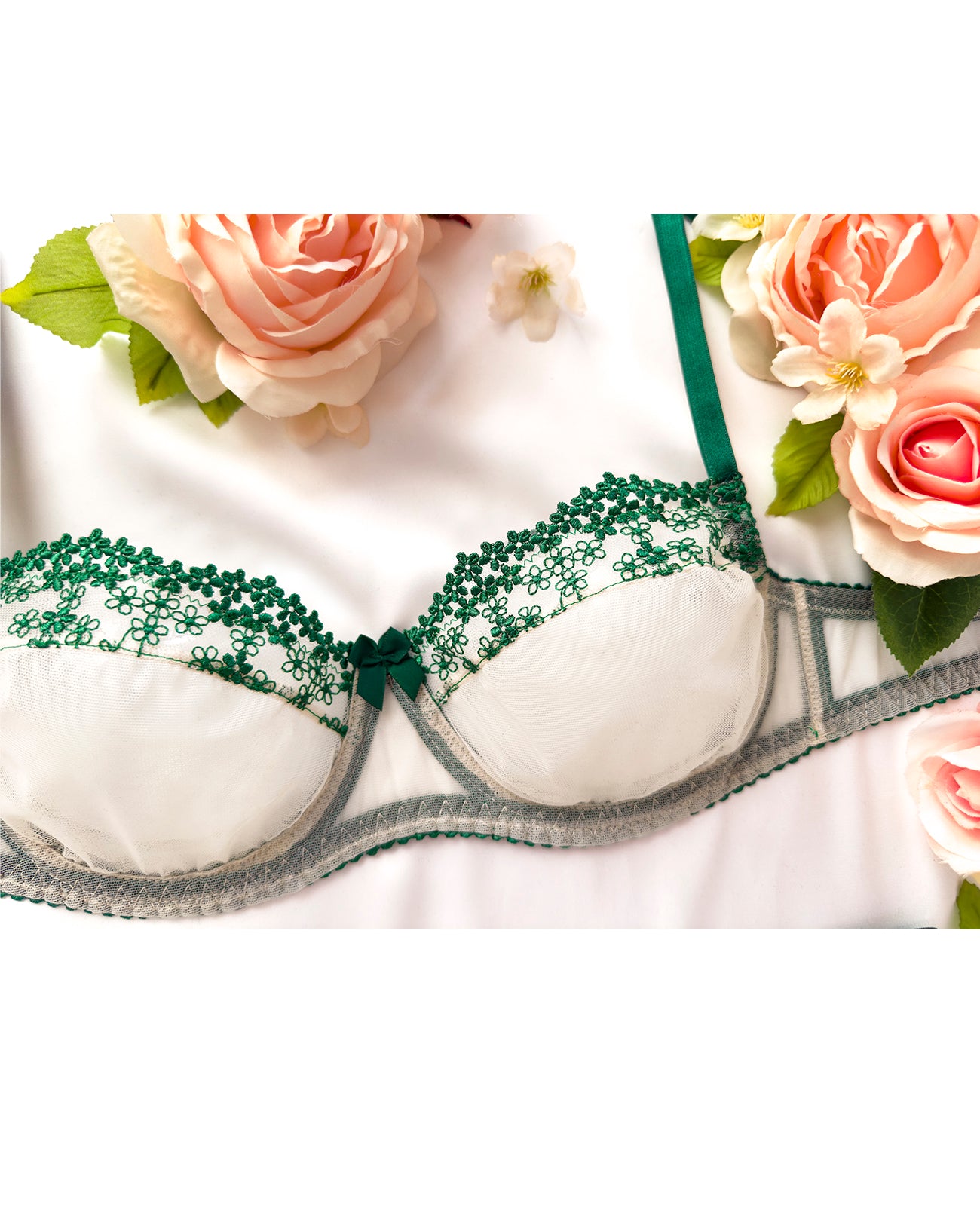 Reggiseno sfoderato con ferretto. Realizzato in morbidissimo tulle nude e con smerlo ricamato. Deliziosi fiorellini verde smeraldo ricamati su tulle decorano lo scollo. Ferretto e stecchette laterali.