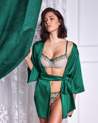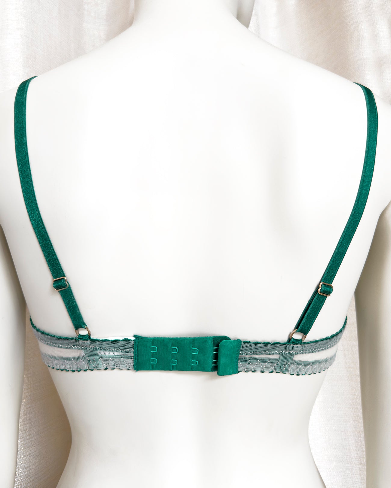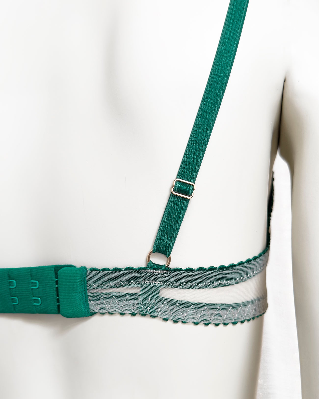 La coppa è doppiata con tulle rigido per garantire una perfetta tenuta. Profili lucidi verde smeraldo per un sensualissimo effetto contouring. Spalline lucide regolabili. Gancio regolatore a quattro posizioni per garantire la perfetta vestibilità. Adatto anche ai seni più importanti.
