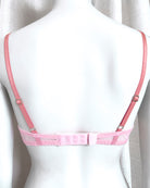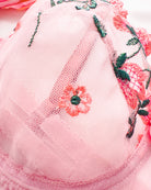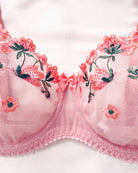 Reggiseno sfoderato con ferretto e stecchette laterali. Realizzato in elegantissimo tulle ricamato a fiori rosa ciliegio, rosa pesca ed un ramage di foglie. Fusti laterali in tulle elasticizzato in nuance di colore.