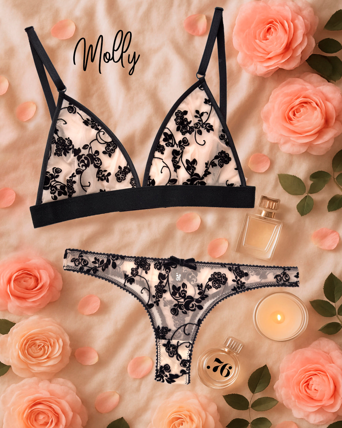 Morbidissimo tulle color pelle e tanti fiorellini vellutati neri. Un effetto SENSUALISSIMO senza rinunciare ad una comodità assoluta.