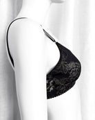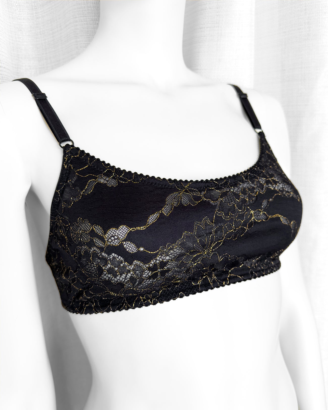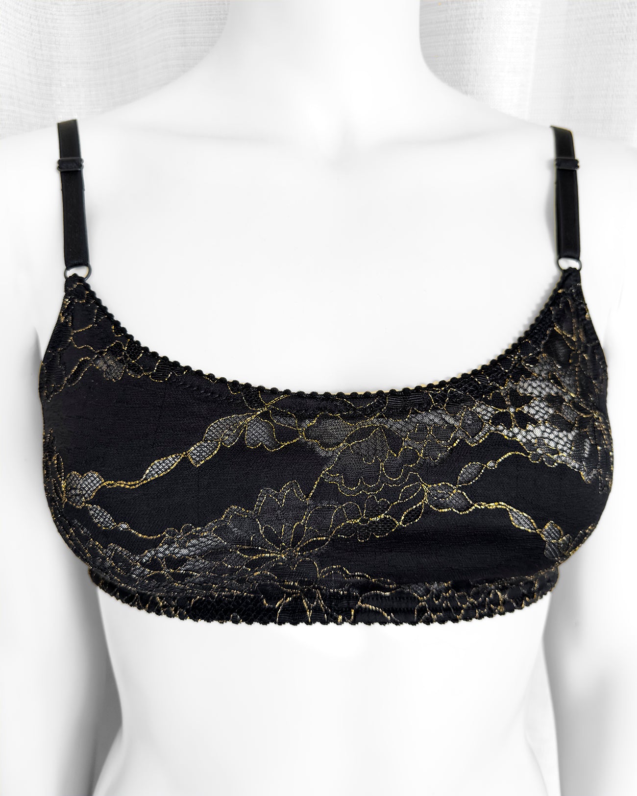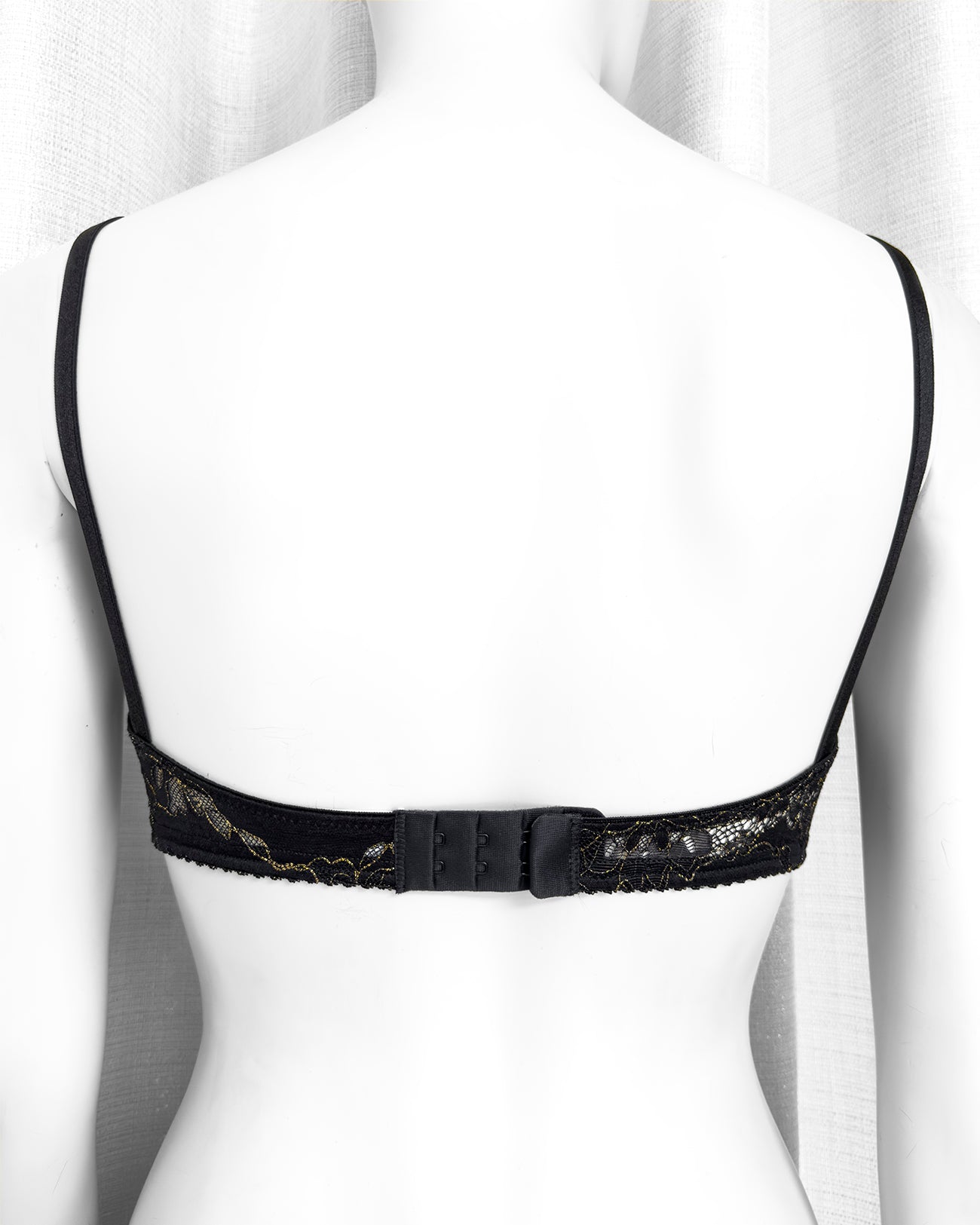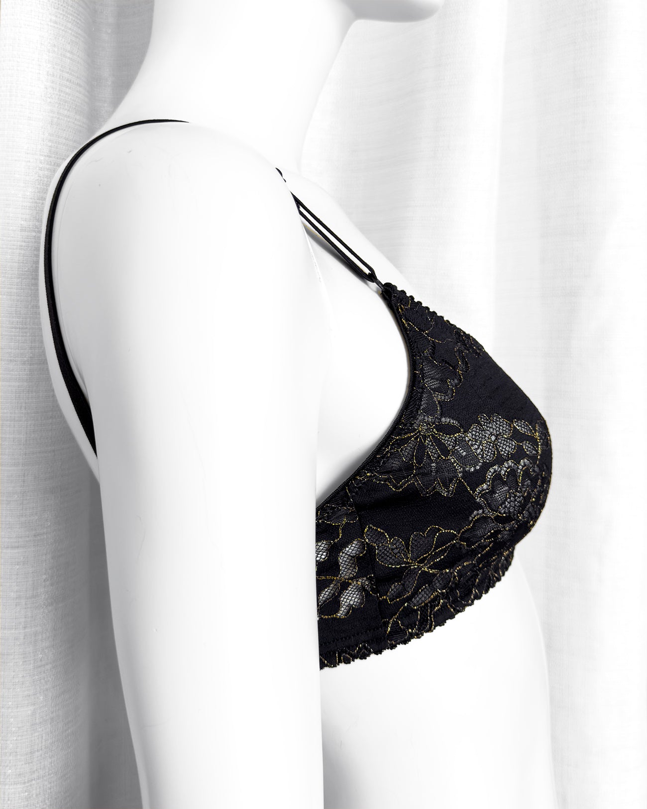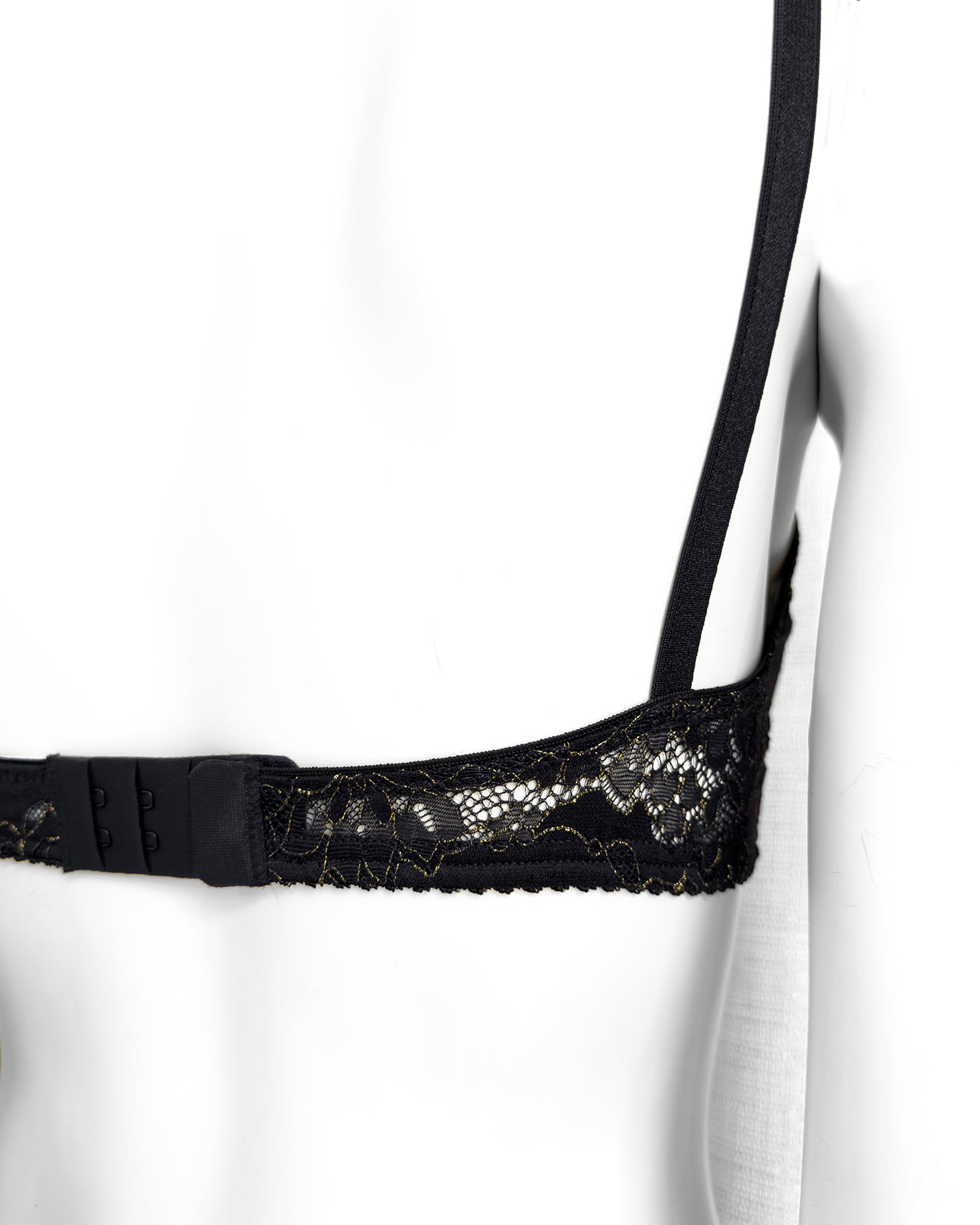 Realizzata in meraviglioso pizzo nero con disegno floreale, inserti in lurex oro e gioco di trasparenze.  Anellini e regolatori in metallo nichel free neri: mai dimenticare l’importanza degli accessori!