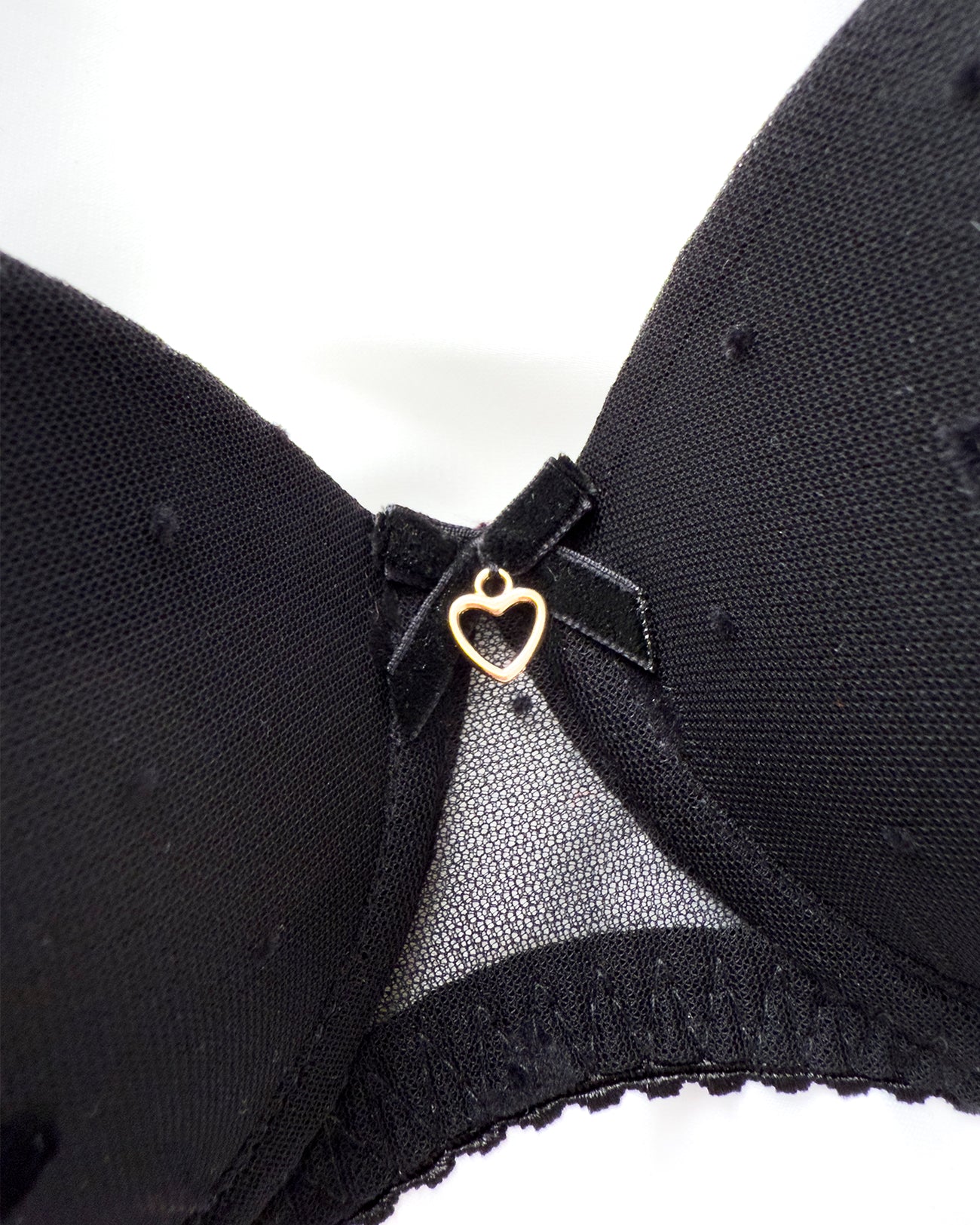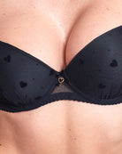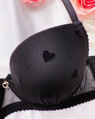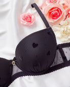 Reggiseno push-up realizzato interamente in morbidissimo tulle a base nera con cuoricini e pois in velluto a rilievo. Fiocchetto centrale in velluto, pendaglio a cuore in metallo oro (rigorosamente nichelfree).
