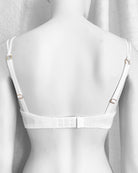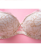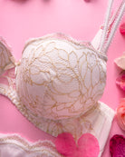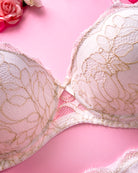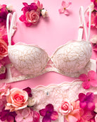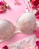 Reggiseno push-up realizzato in pizzo bianco latte con disegno floreale ed inserti in lurex oro. Delizioso smerlo con piccoli cerchi dorati. Fiocco centrale in raso in nuance. Fusti laterali in morbidissima microfibra bianco latte.
