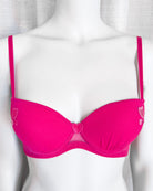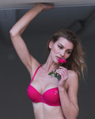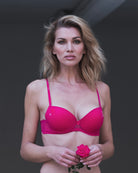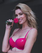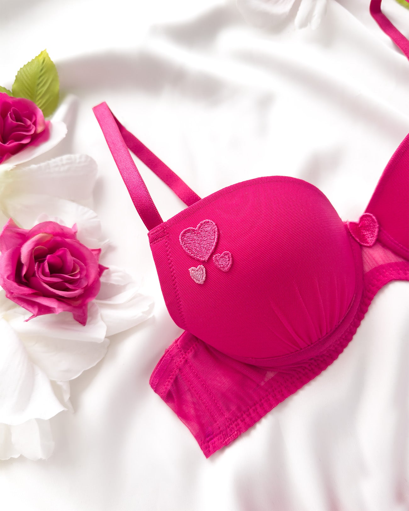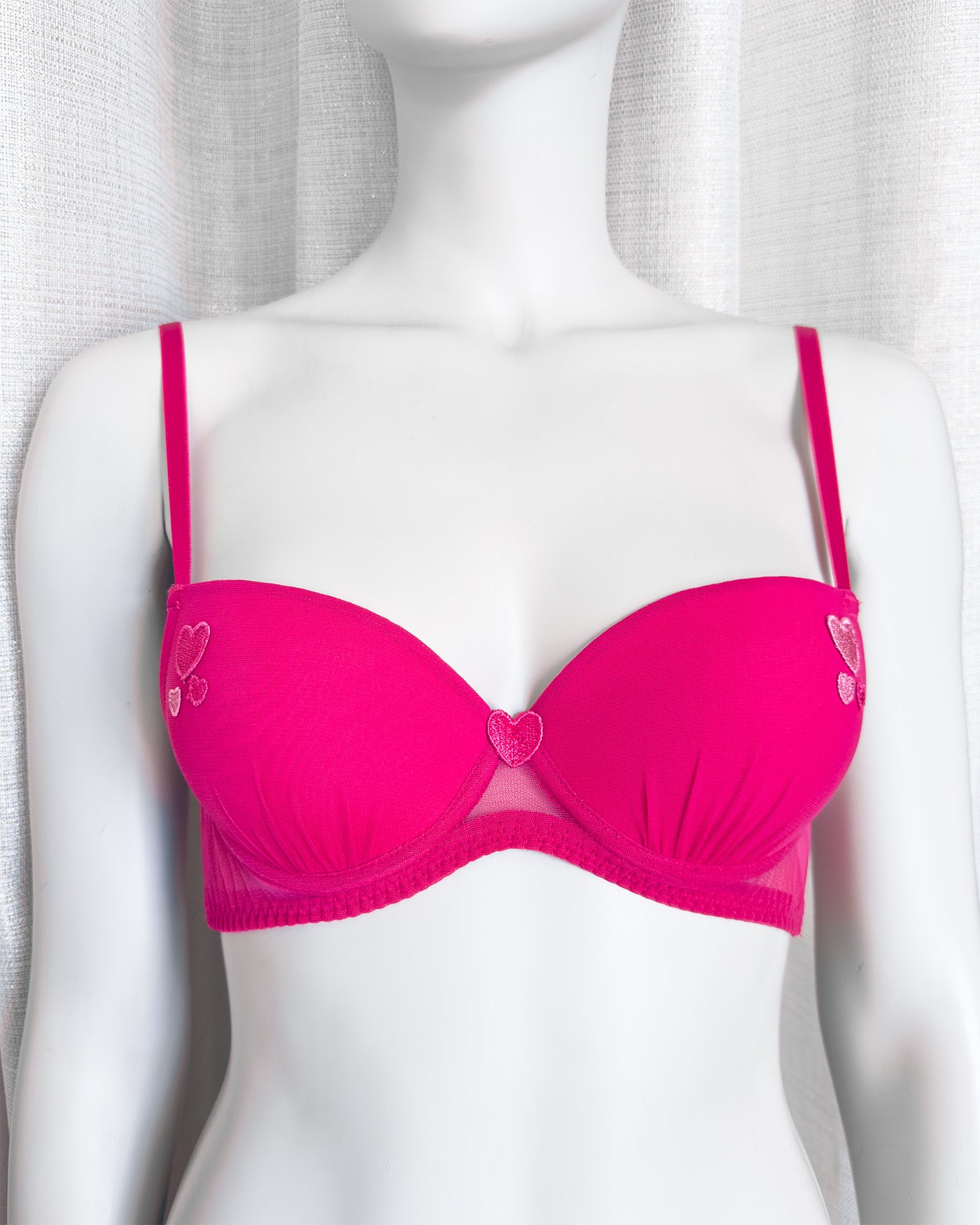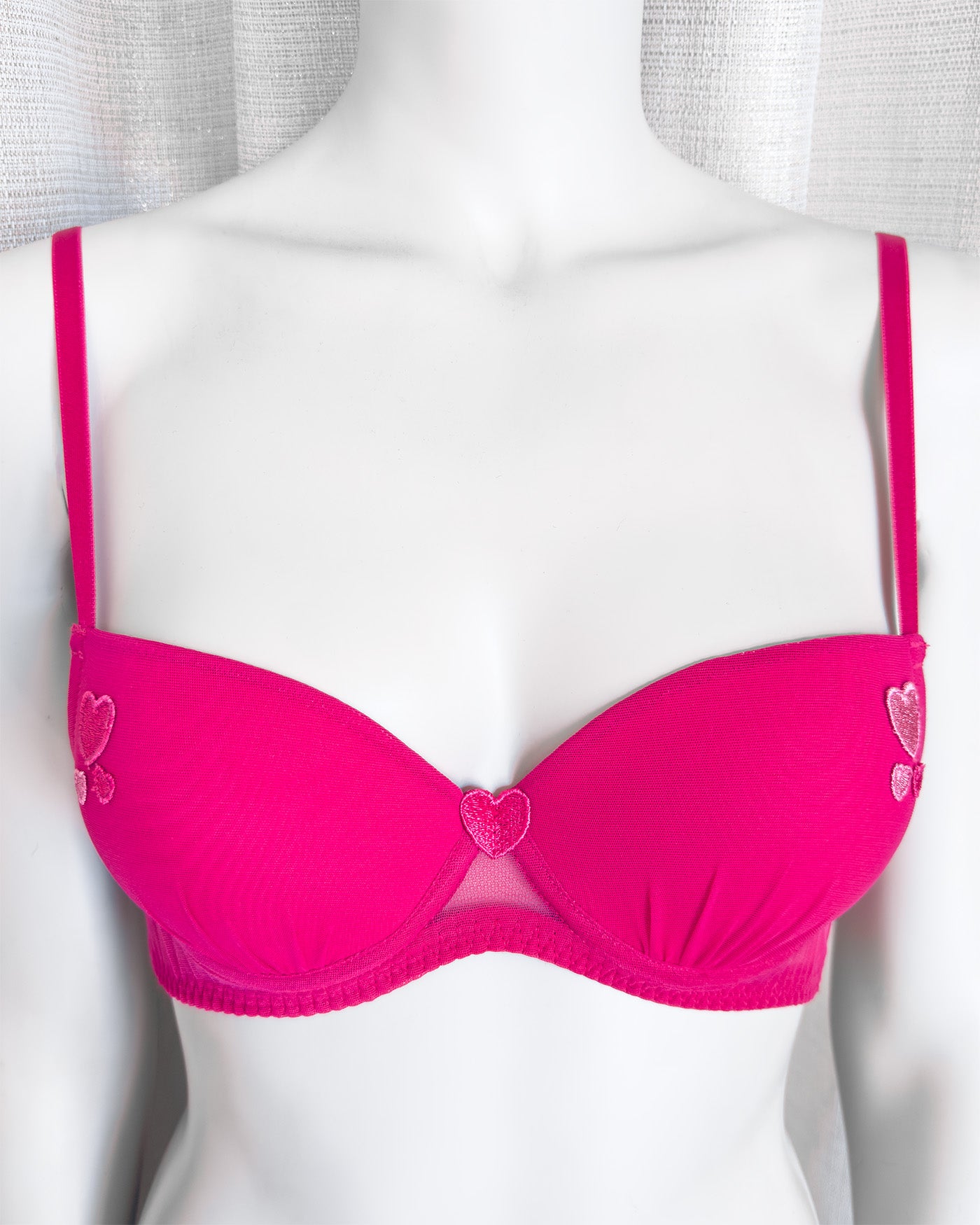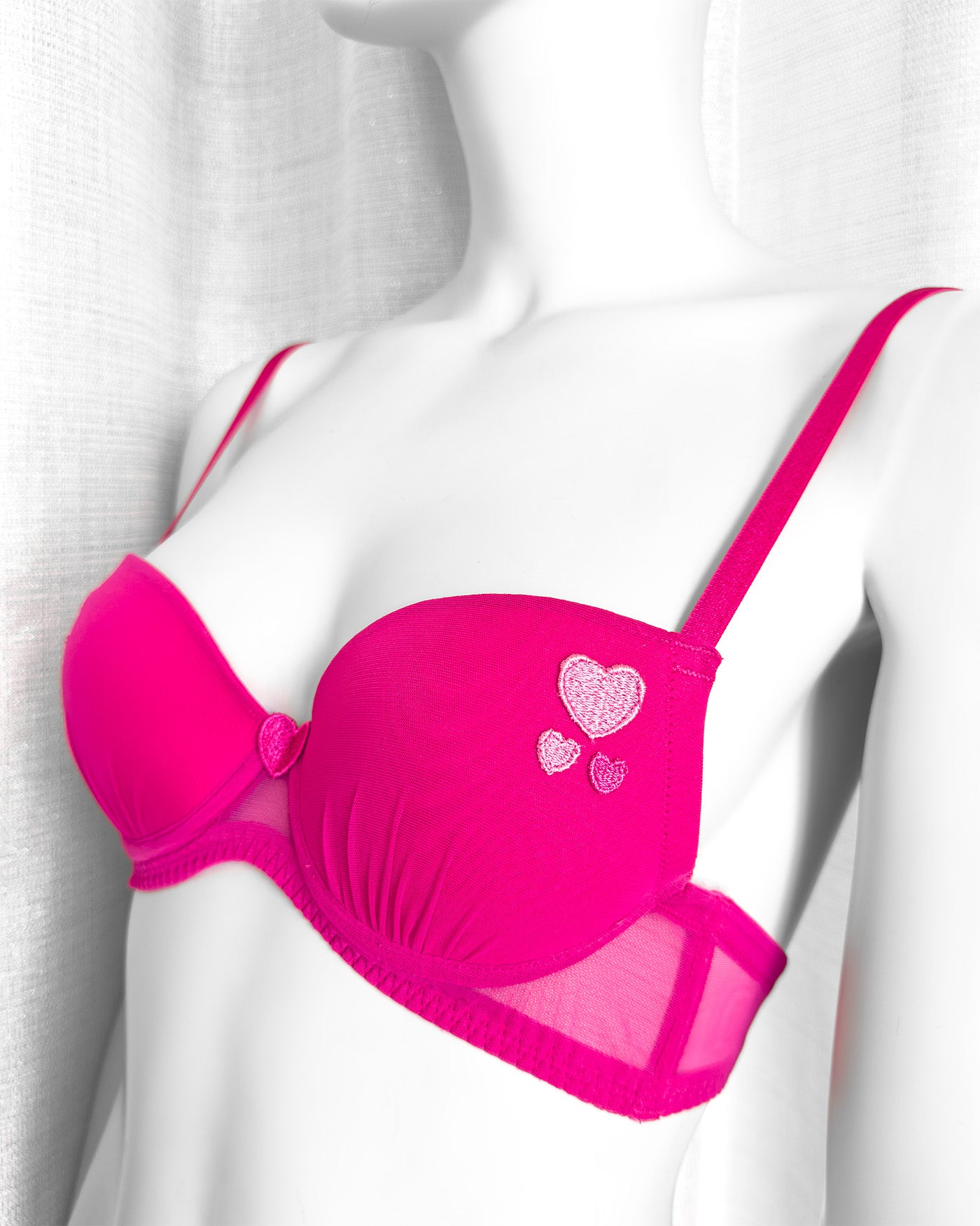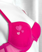 Reggiseno push-up realizzato interamente in morbidissimo tulle hot pink. Cuoricini ricamati in sfumatura di colore, di varie grandezze.