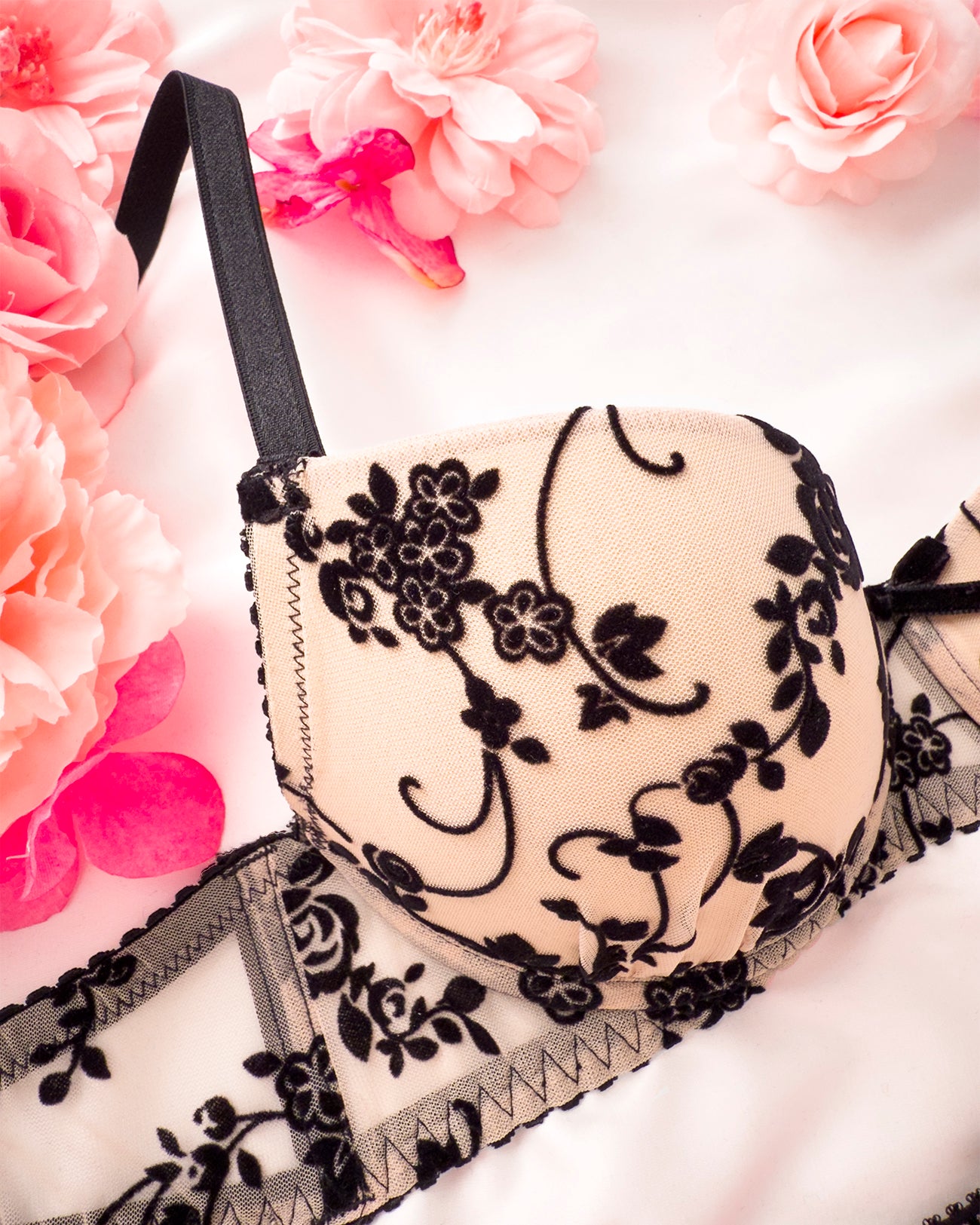 Reggiseno push-up realizzato interamente in morbidissimo tulle a base color pelle con fiorellini in velluto nero a rilievo. Fiocchetto centrale in velluto nero.