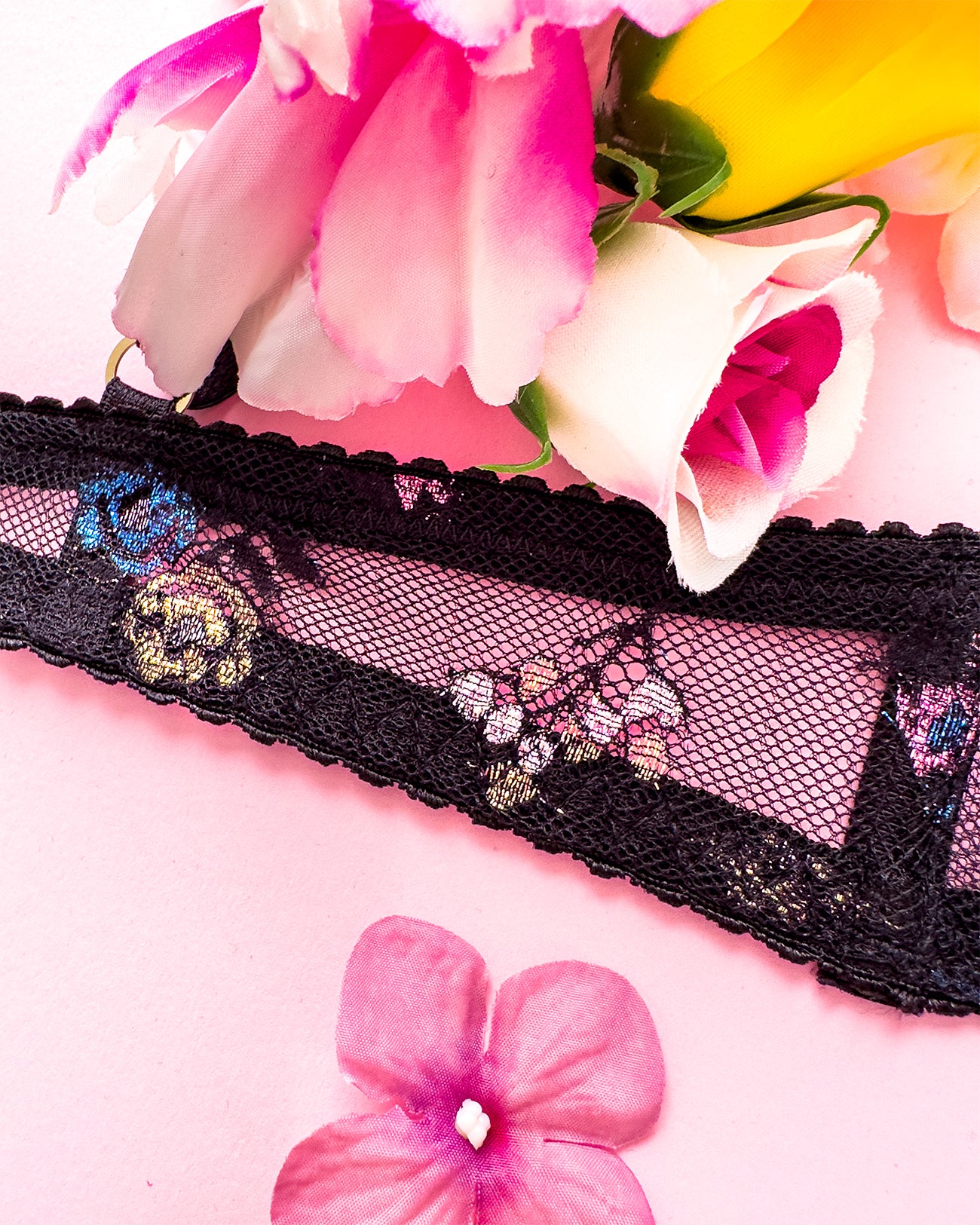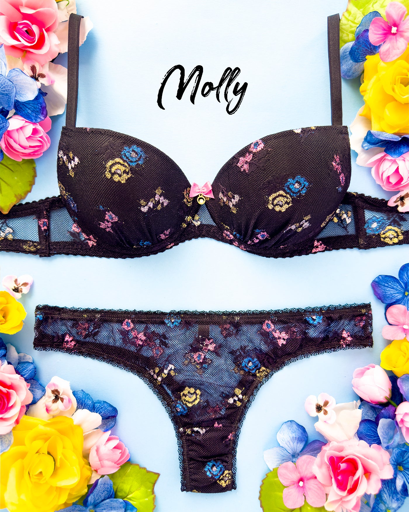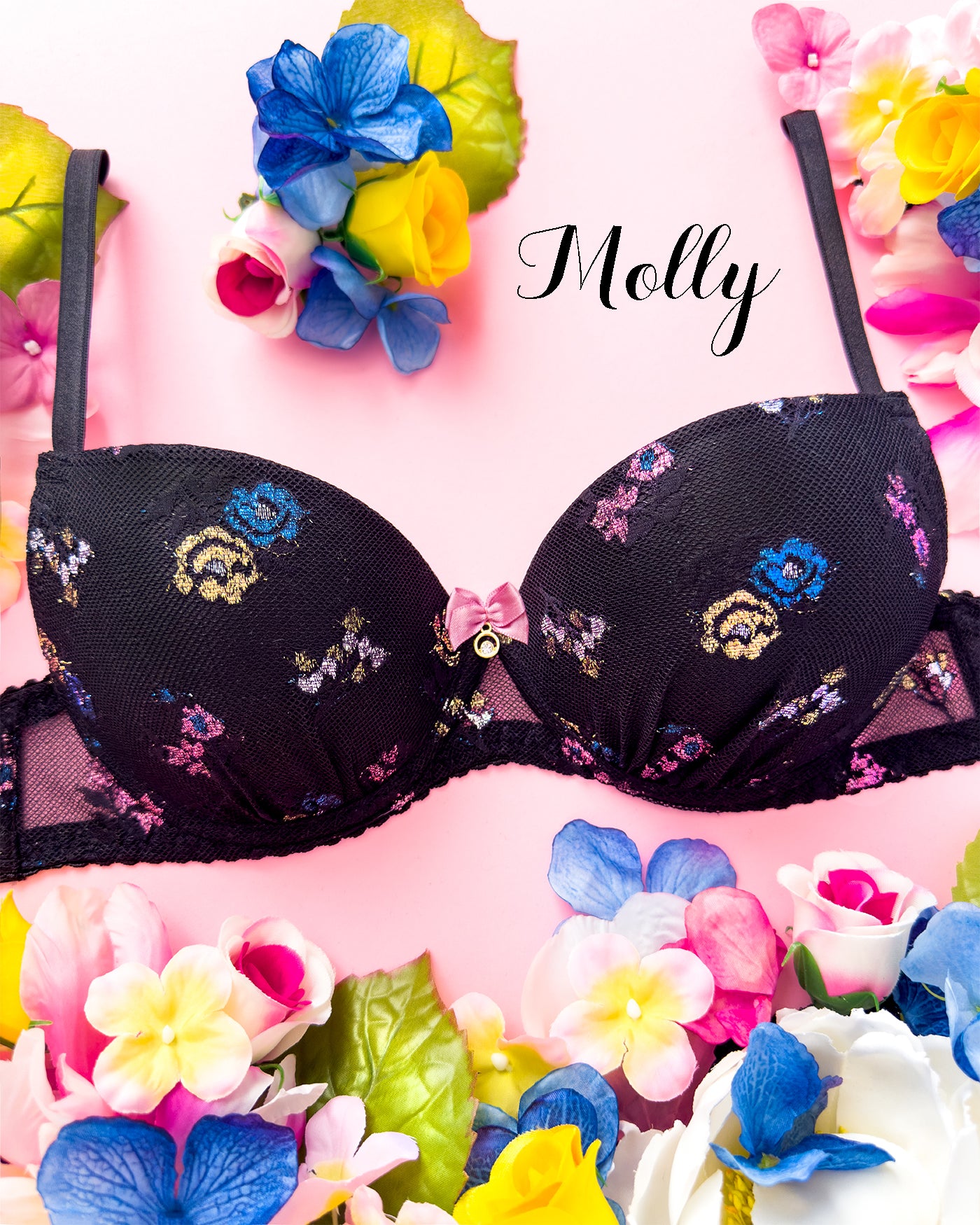 Benvenuta Molly Shine: pizzo con base nera impreziosito da fiori colorati con morbidissimo filato lurex. Una vera chicca il fiocco con dettagli in oro e cristalli.