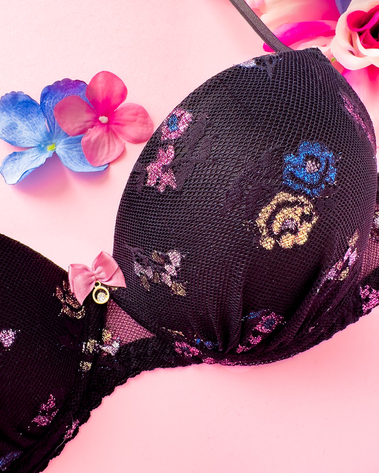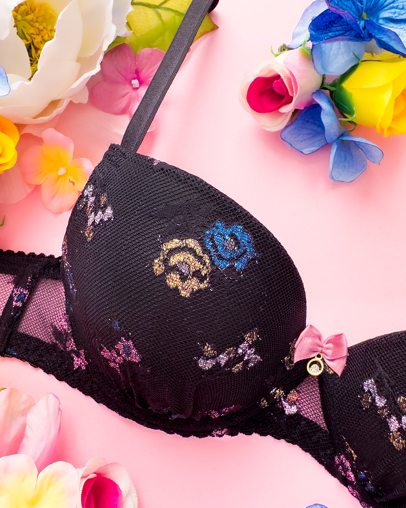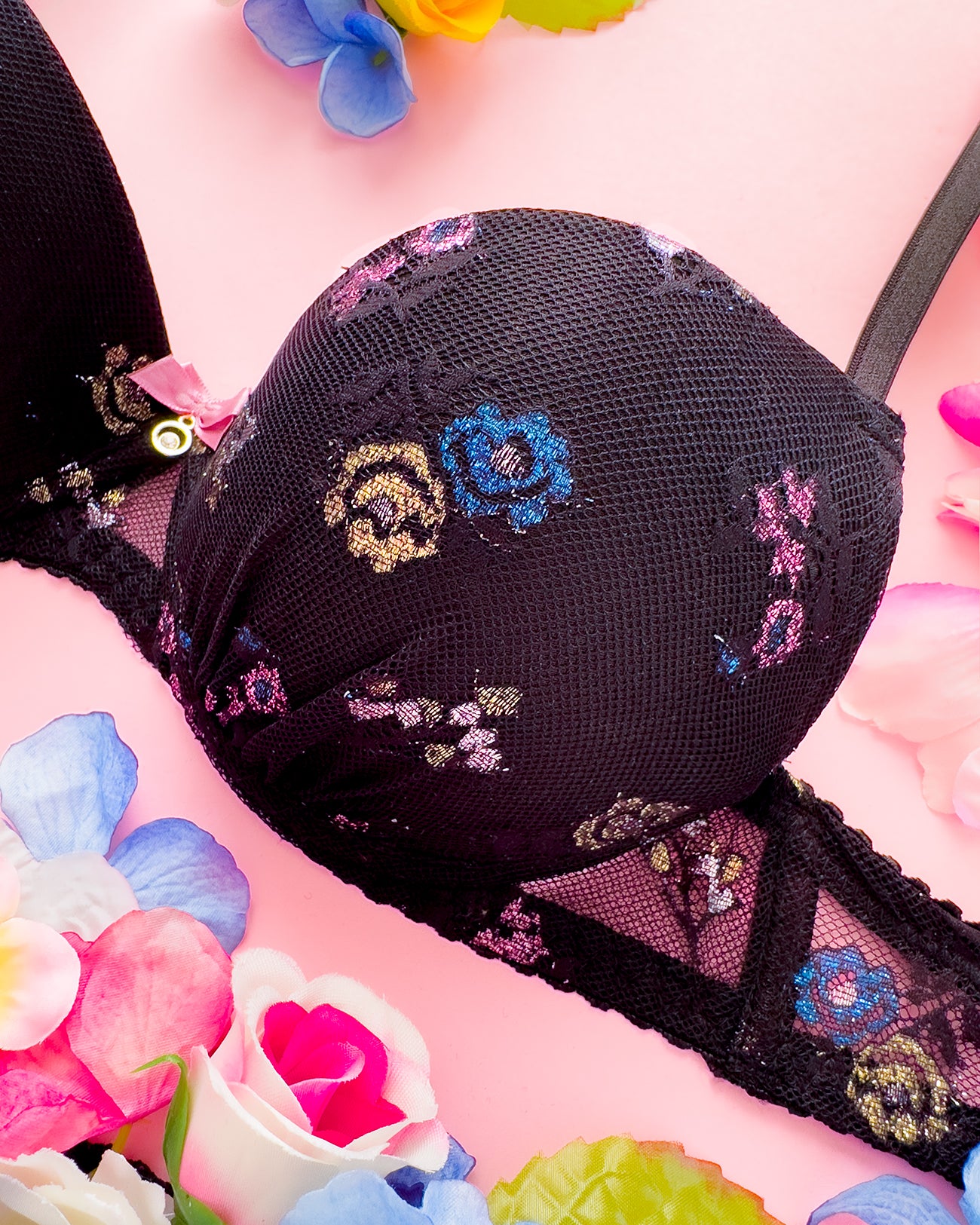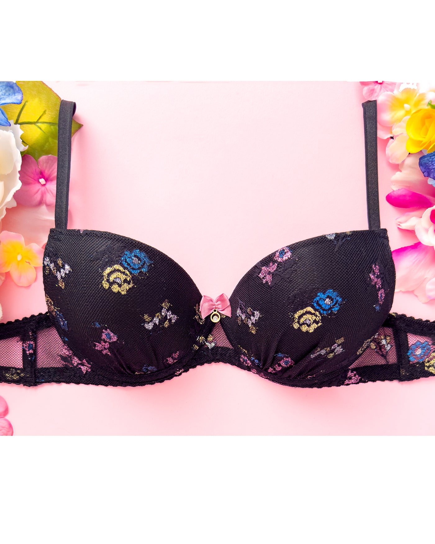 Reggiseno push-up realizzato interamente in pizzo a base nera con dettagli floreali lurex multicolore. Deliziosa lavorazione a pacchetto della coppa che evita qualsiasi taglio ed esalta il disegno. Meraviglioso fiocco centrale con dettagli in oro e cristalli (rigorosamente nichel free).