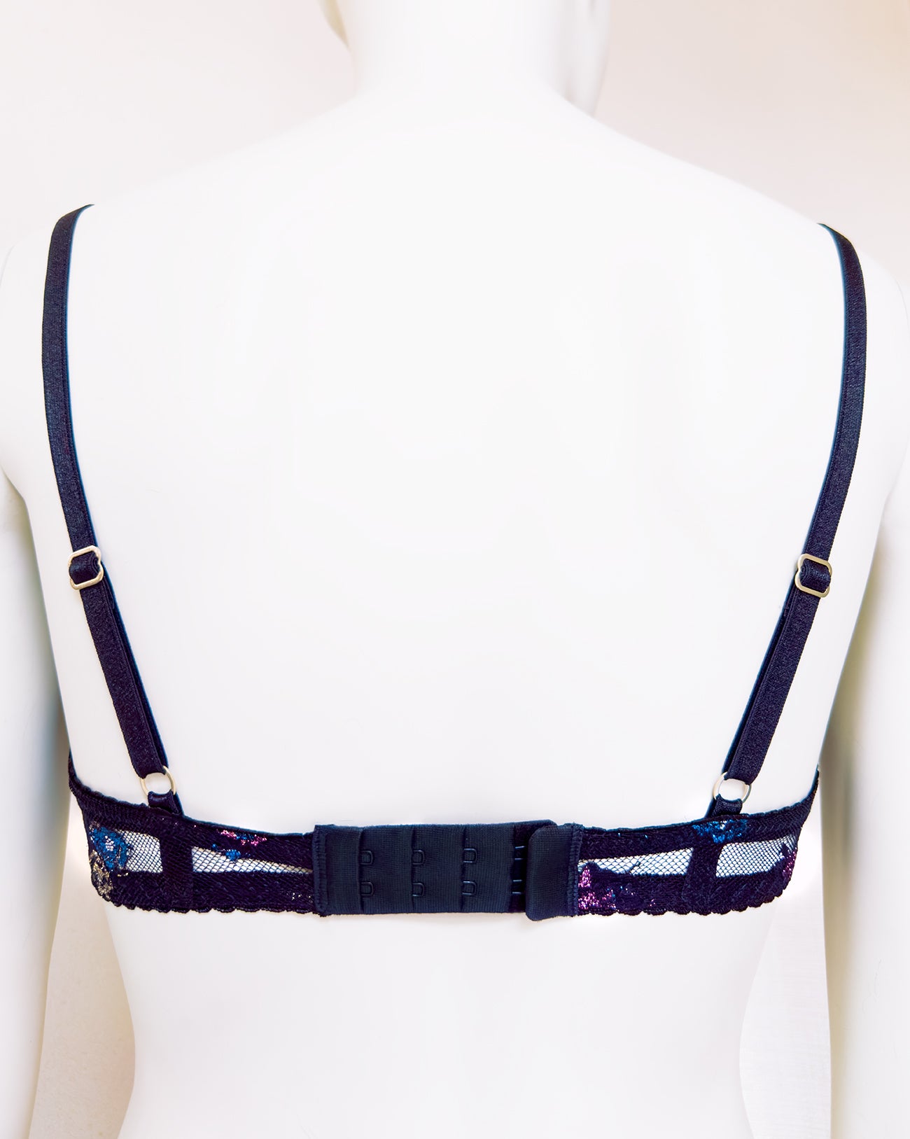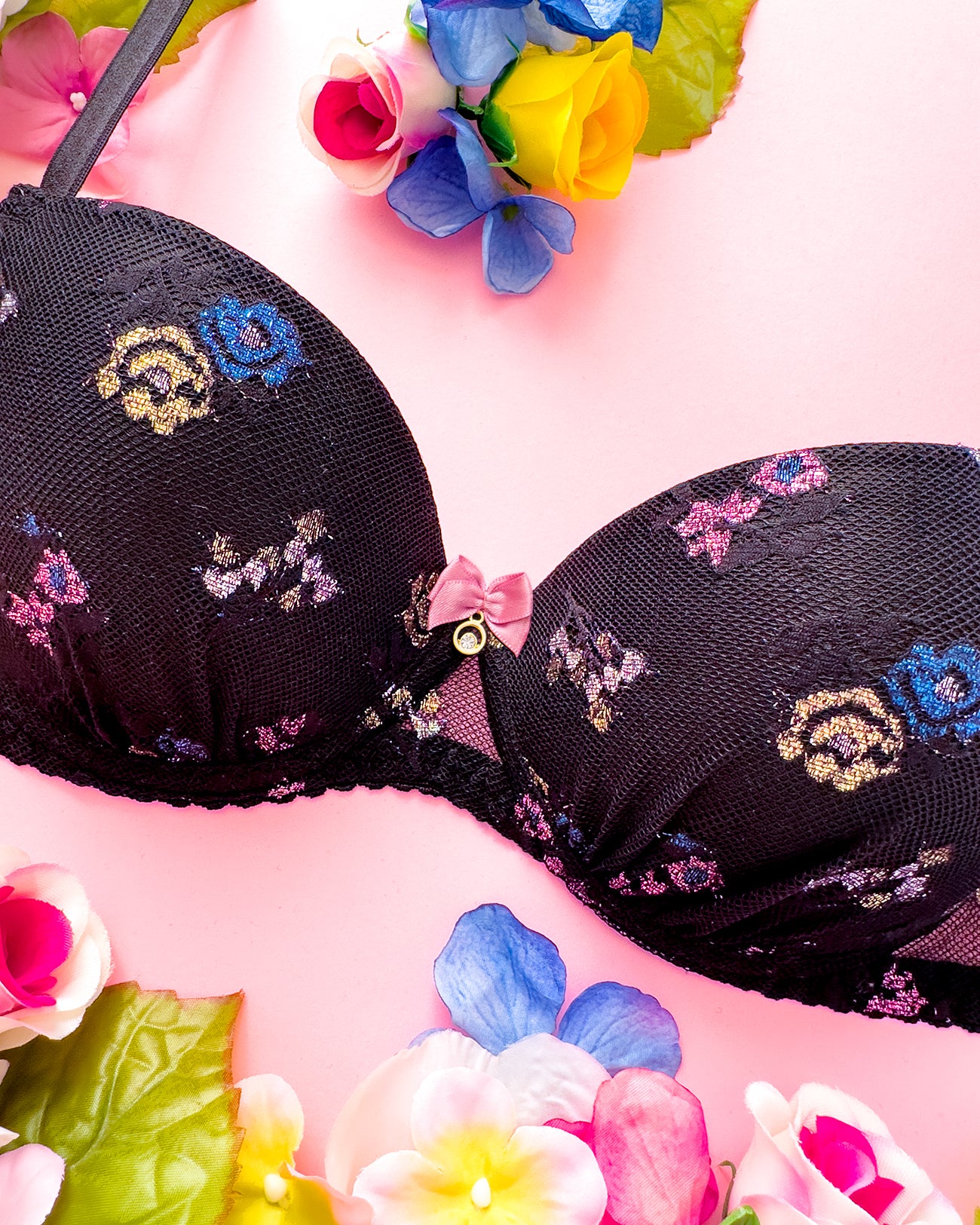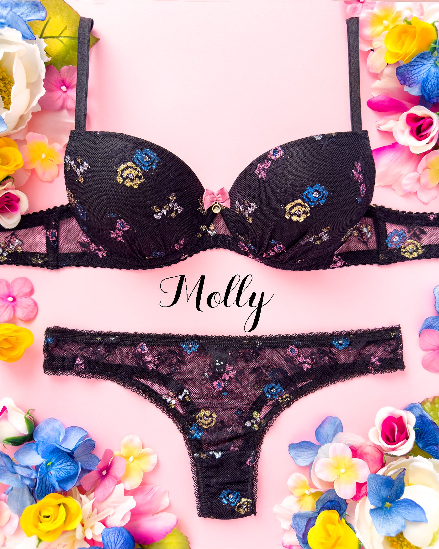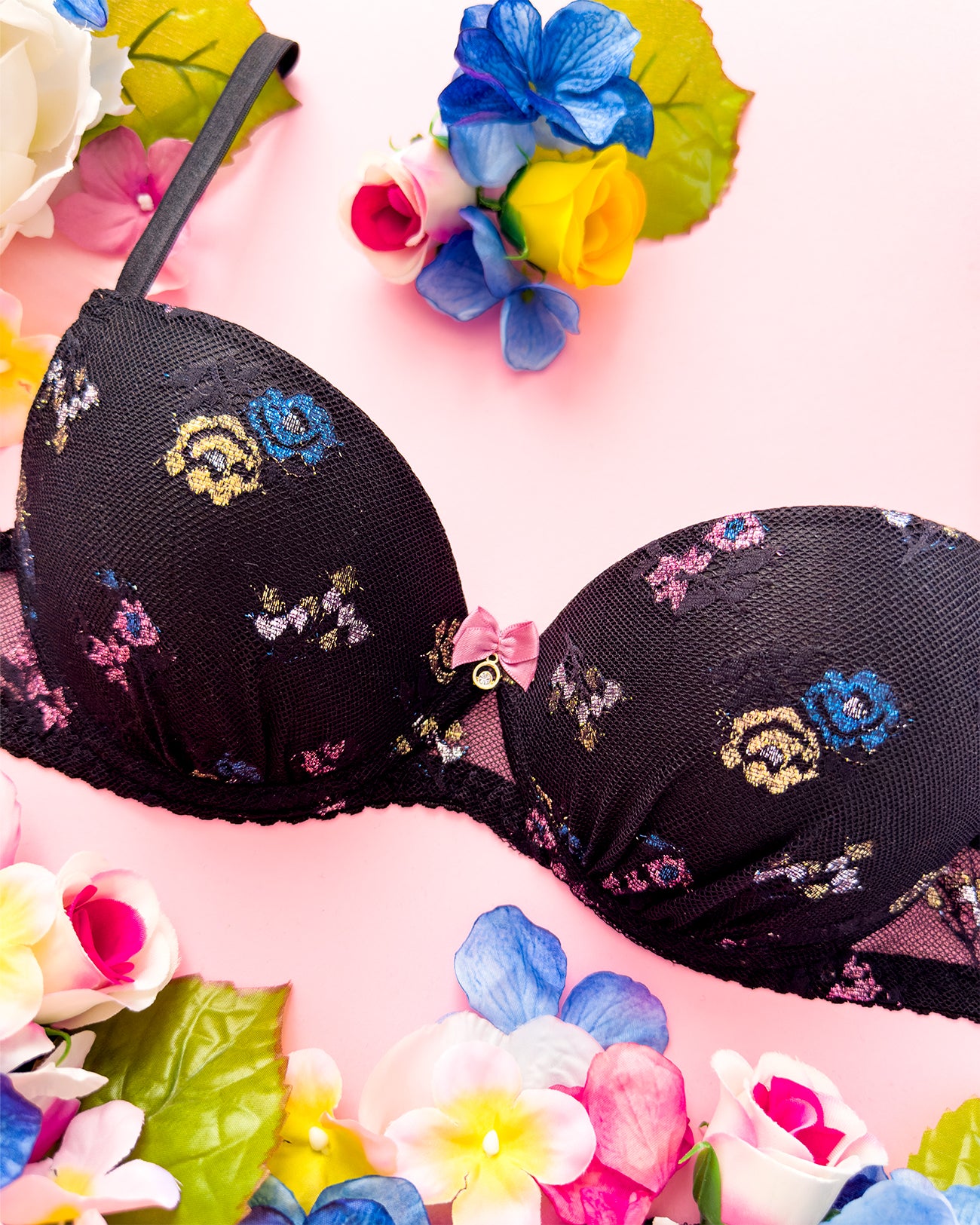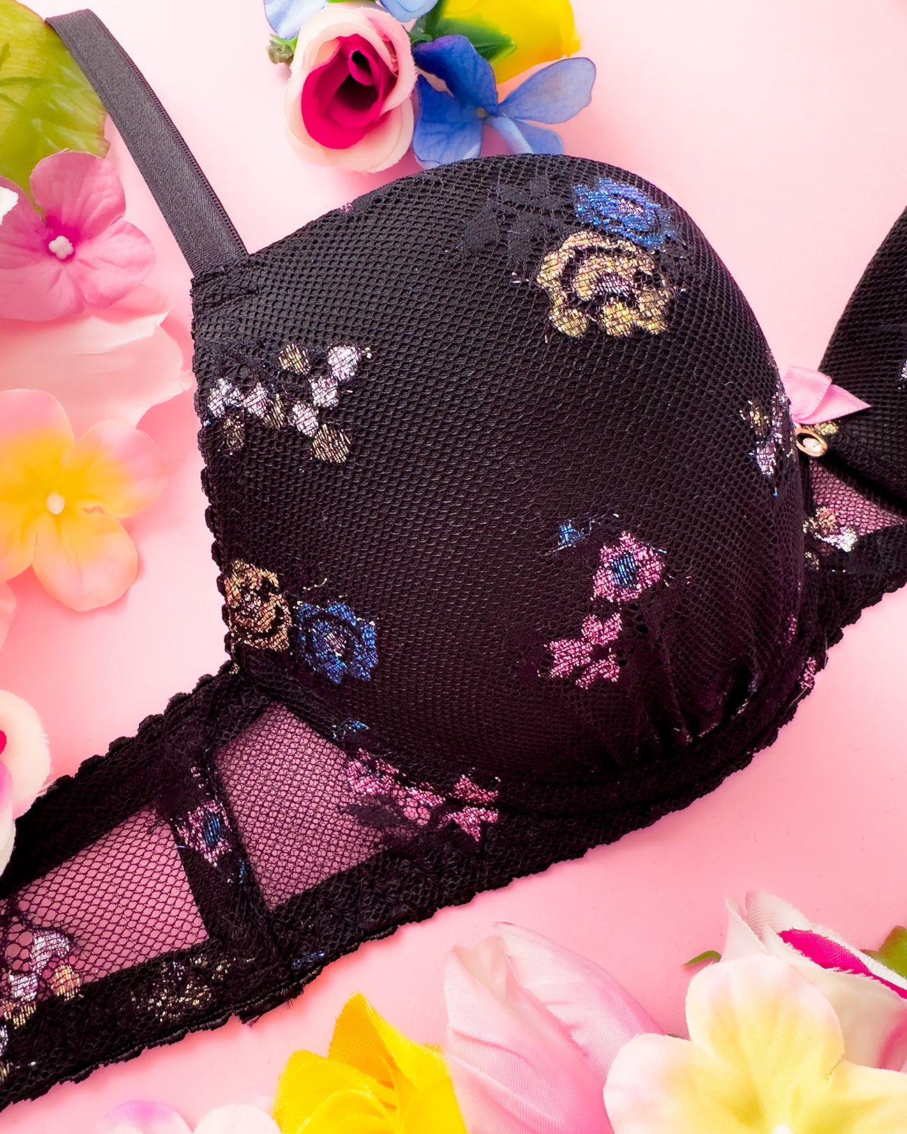 Reggiseno push-up realizzato interamente in pizzo a base nera con dettagli floreali lurex multicolore. Deliziosa lavorazione a pacchetto della coppa che evita qualsiasi taglio ed esalta il disegno. Meraviglioso fiocco centrale con dettagli in oro e cristalli (rigorosamente nichel free).