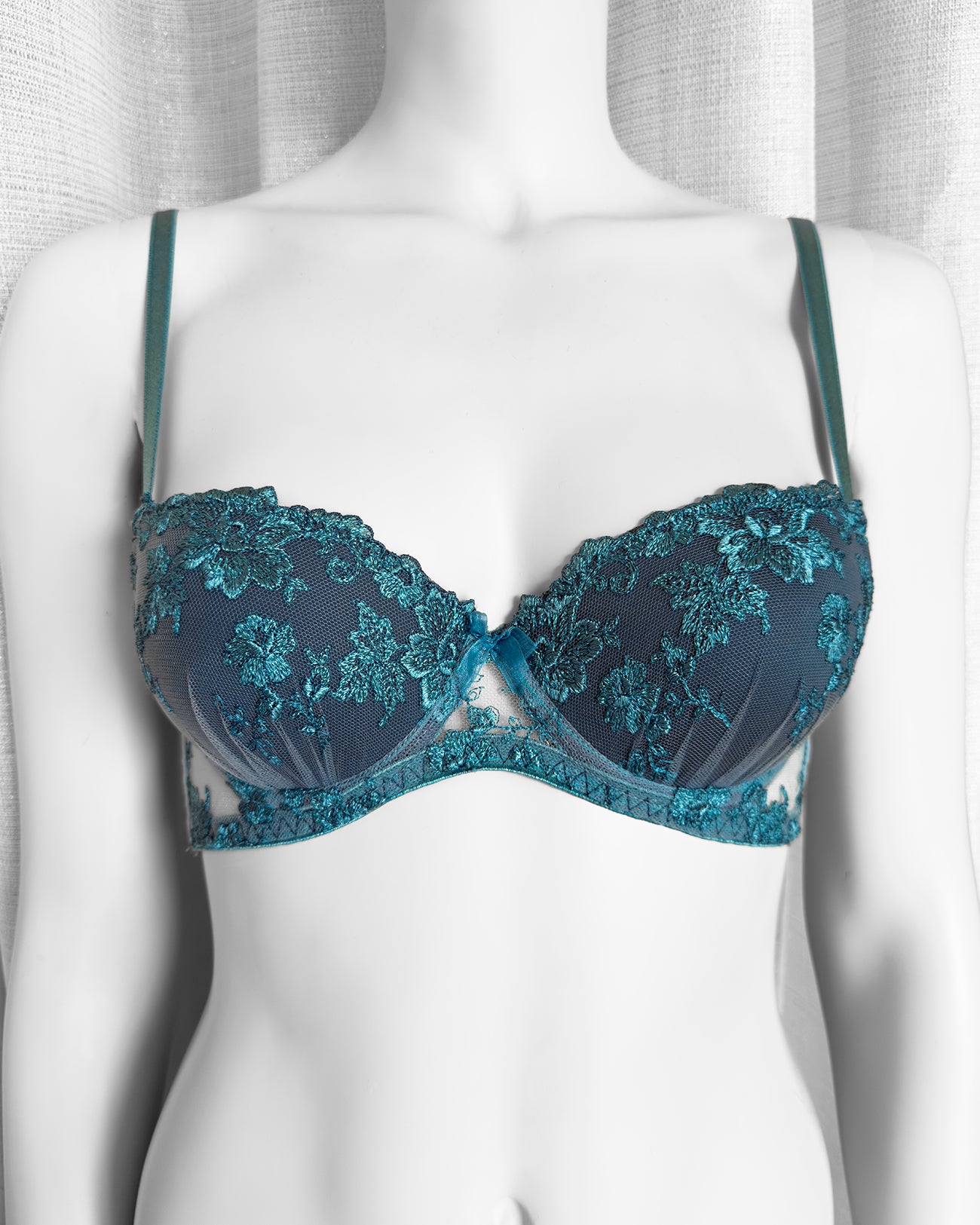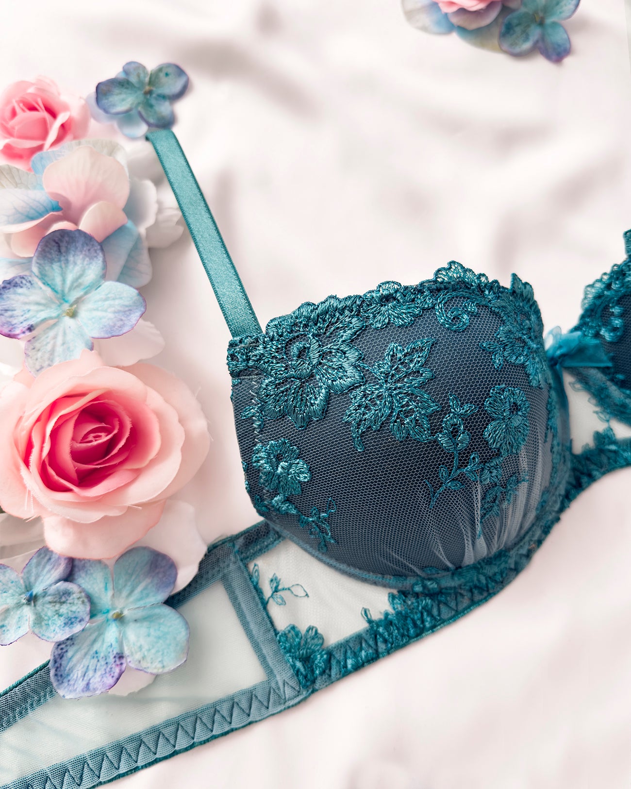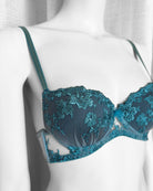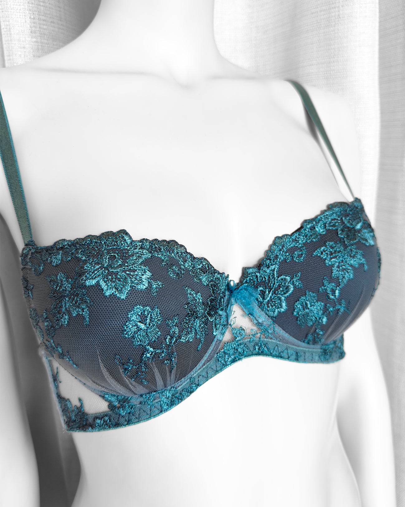 Reggiseno push-up con ferretto e stecchette laterali, realizzato in elegantissimo tulle blu ottanio ricamato con fiori tridimensionali tono su tono. Fiocchetto centrale in organza tono su tono. Deliziosa lavorazione plissè della coppa (realizzata a mano) per godere di tutta la bellezza del ricamo senza alcuna interruzione! Il ricamo è drappeggiato sulla coppa accarezzandola: ogni capo è meraviglioso nella sua unicità! Fusti laterali in tulle elasticizzato in nuance di colore.