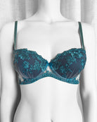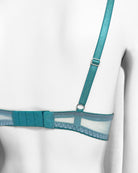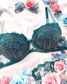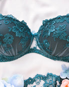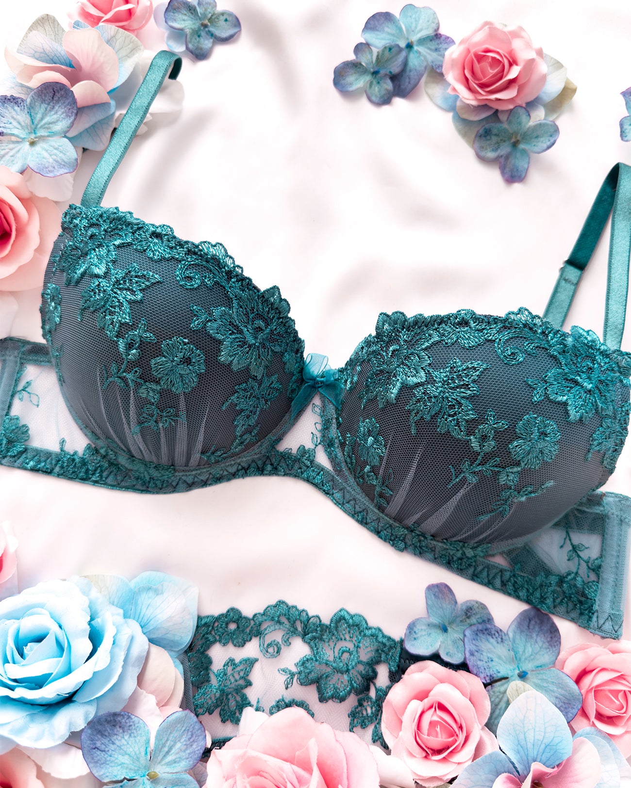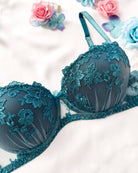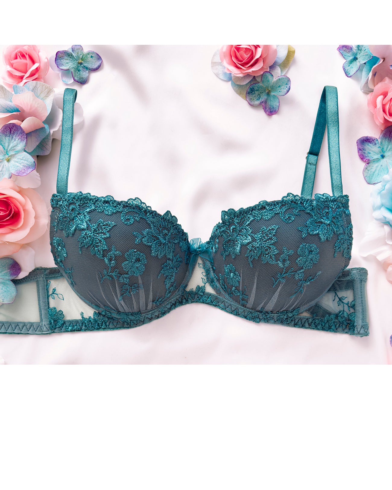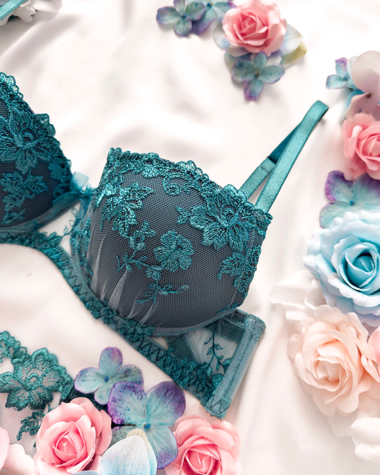 Reggiseno push-up con ferretto e stecchette laterali, realizzato in elegantissimo tulle blu ottanio ricamato con fiori tridimensionali tono su tono. Fiocchetto centrale in organza tono su tono. Deliziosa lavorazione plissè della coppa (realizzata a mano) per godere di tutta la bellezza del ricamo senza alcuna interruzione! Il ricamo è drappeggiato sulla coppa accarezzandola: ogni capo è meraviglioso nella sua unicità! Fusti laterali in tulle elasticizzato in nuance di colore.