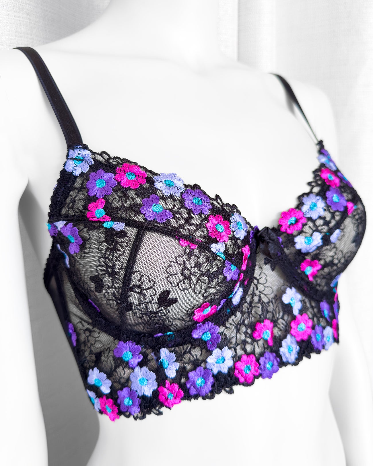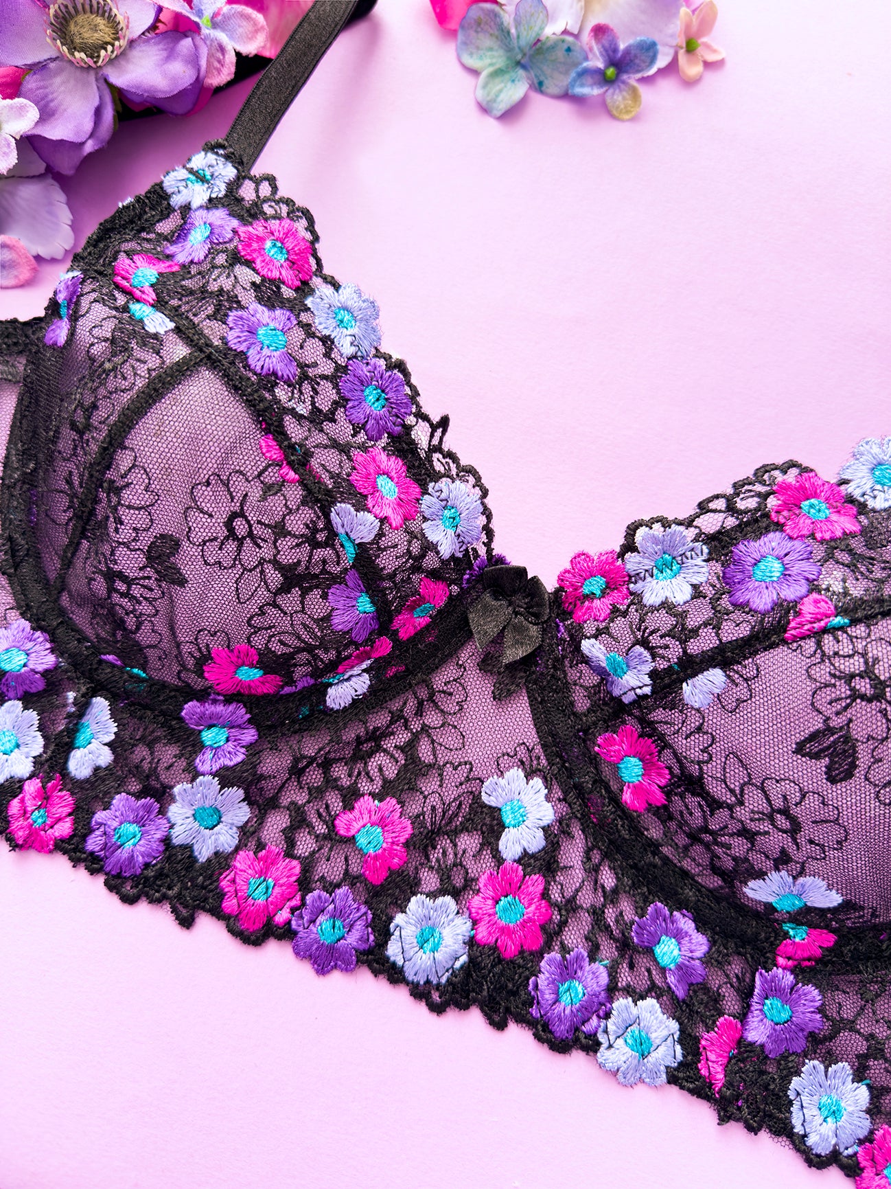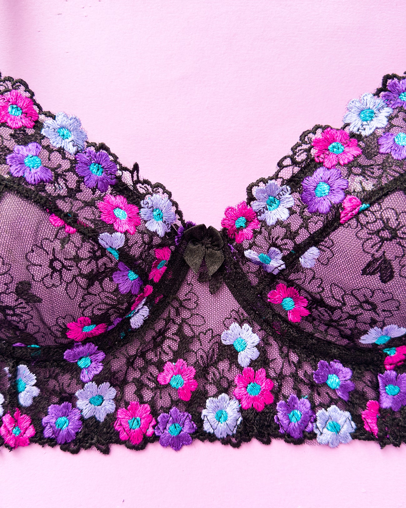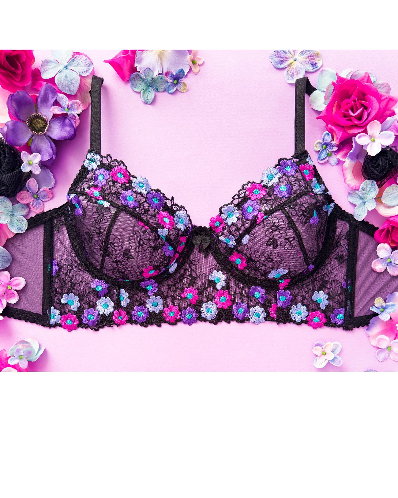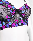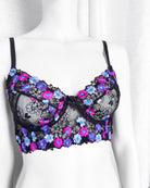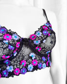Reggiseno sfoderato con ferretto e stecchette laterali. Realizzato in elegantissimo tulle nero ricamato con fiorellini fucsia, indaco e viola con centro in filato lurex a contrasto. Fiocchetto centrale in raso. Fusti laterali in tulle elasticizzato nero.