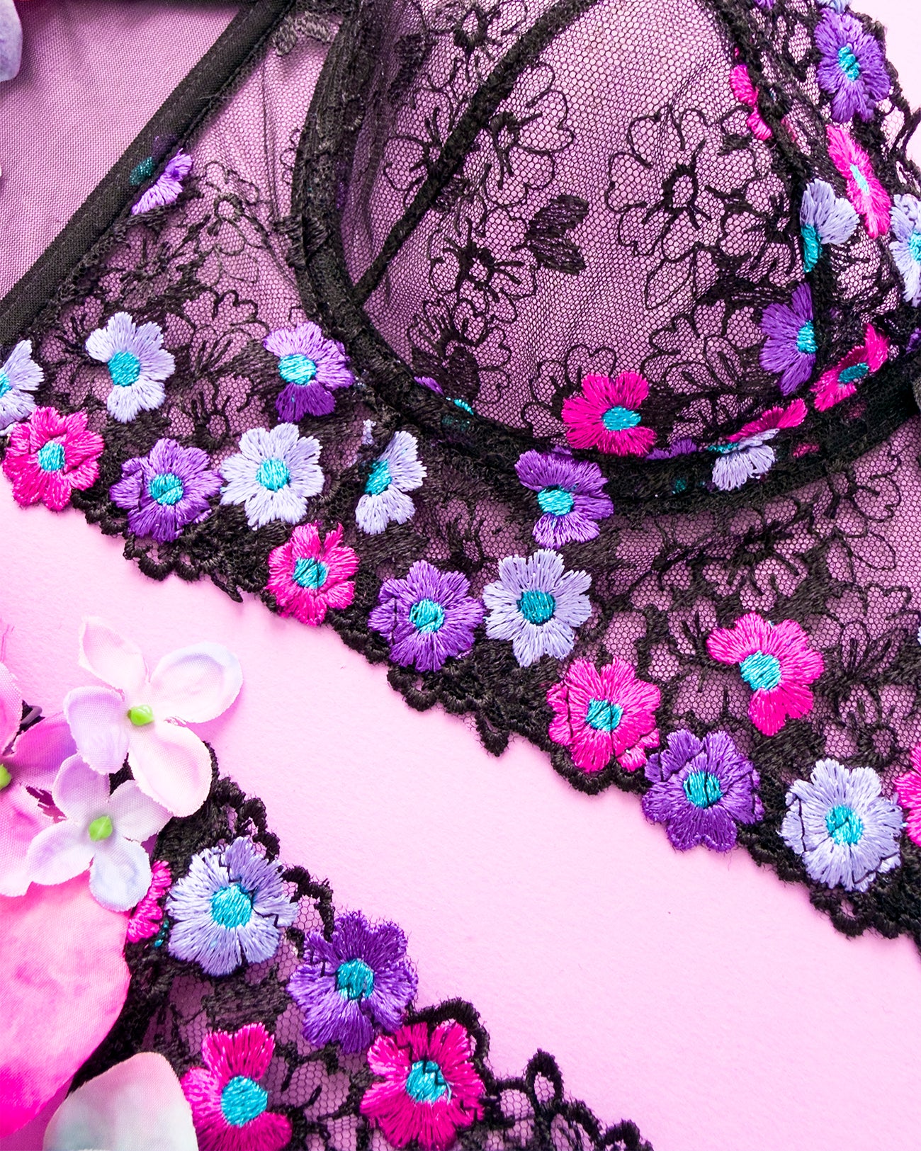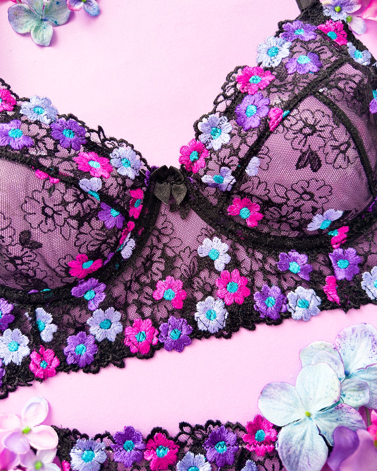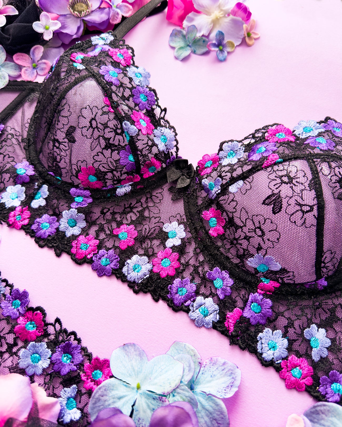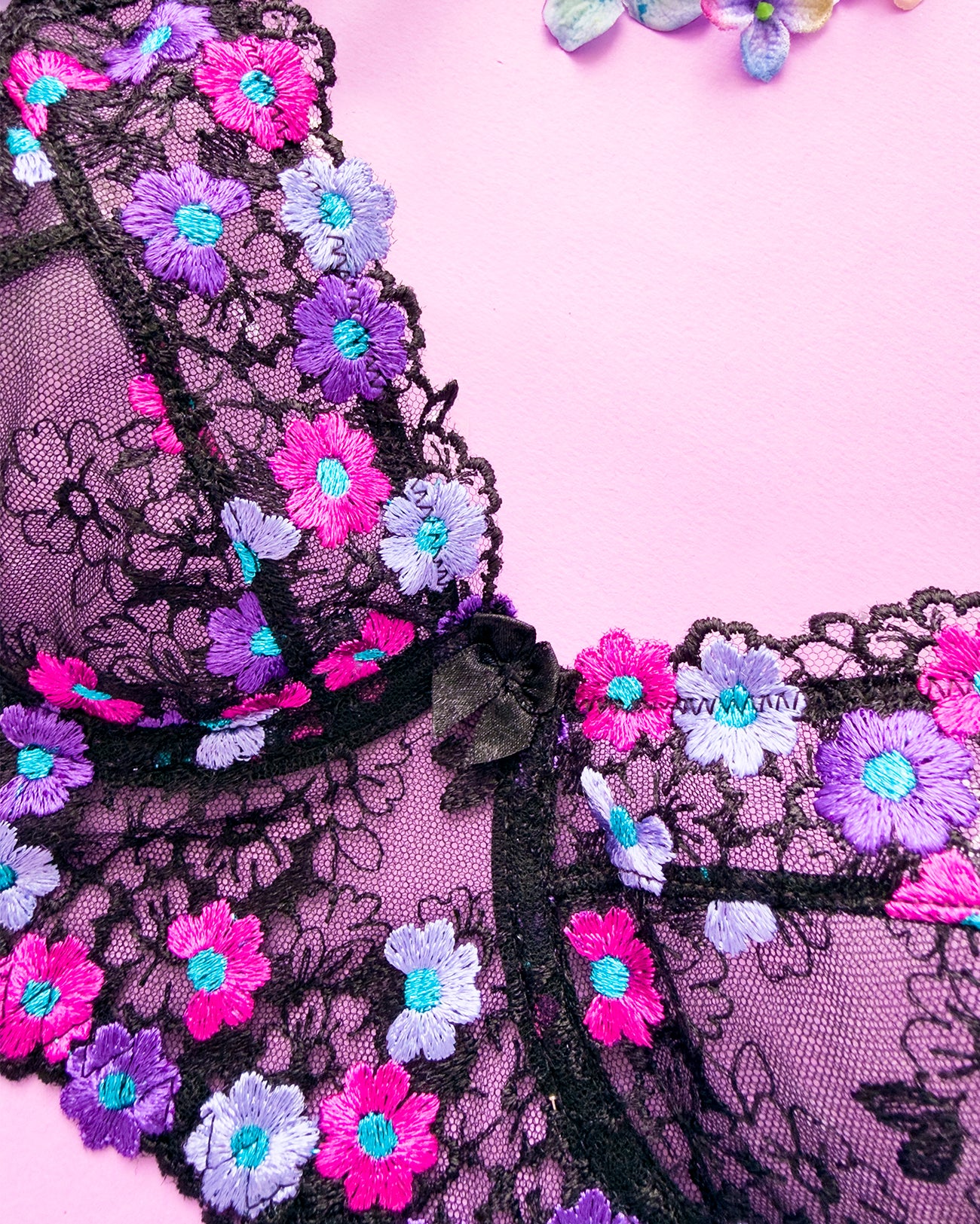 Reggiseno sfoderato con ferretto e stecchette laterali. Realizzato in elegantissimo tulle nero ricamato con fiorellini fucsia, indaco e viola con centro in filato lurex a contrasto. Fiocchetto centrale in raso. Fusti laterali in tulle elasticizzato nero.