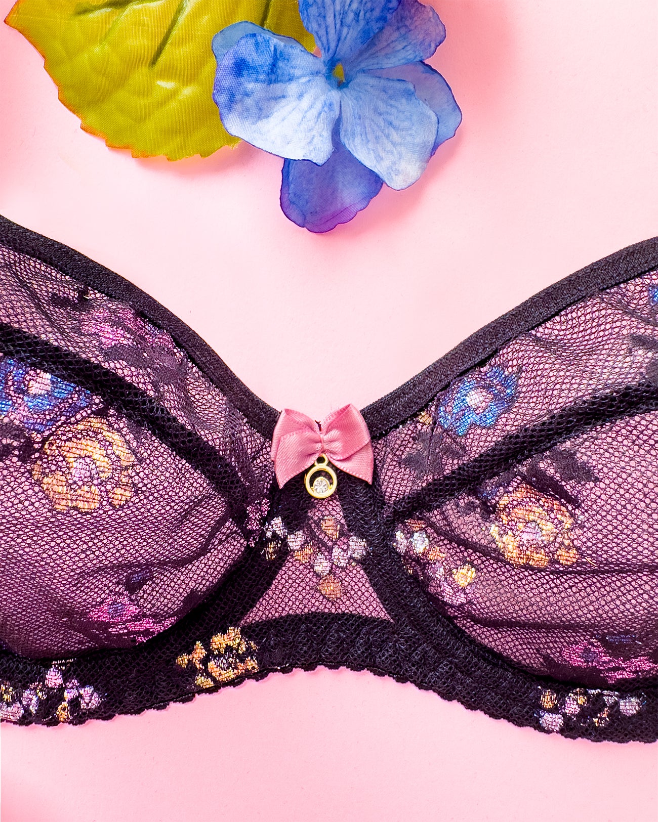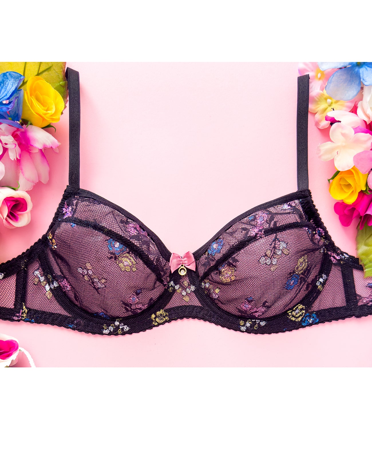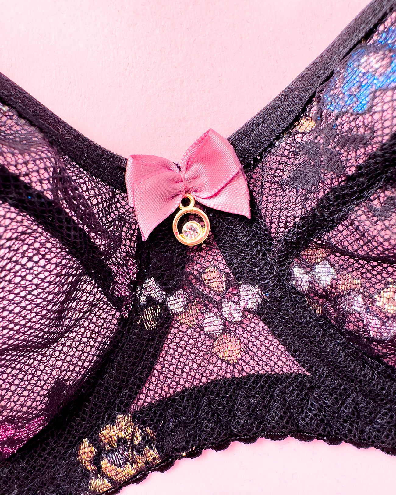 Reggiseno sfoderato con ferretto interamente in pizzo a base nera con dettagli floreali lurex multicolore. Bordo coppa con dettaglio lucido nero. Meraviglioso fiocco centrale con dettagli in oro e cristalli (rigorosamente nichel free).