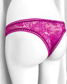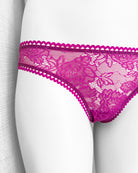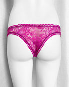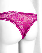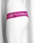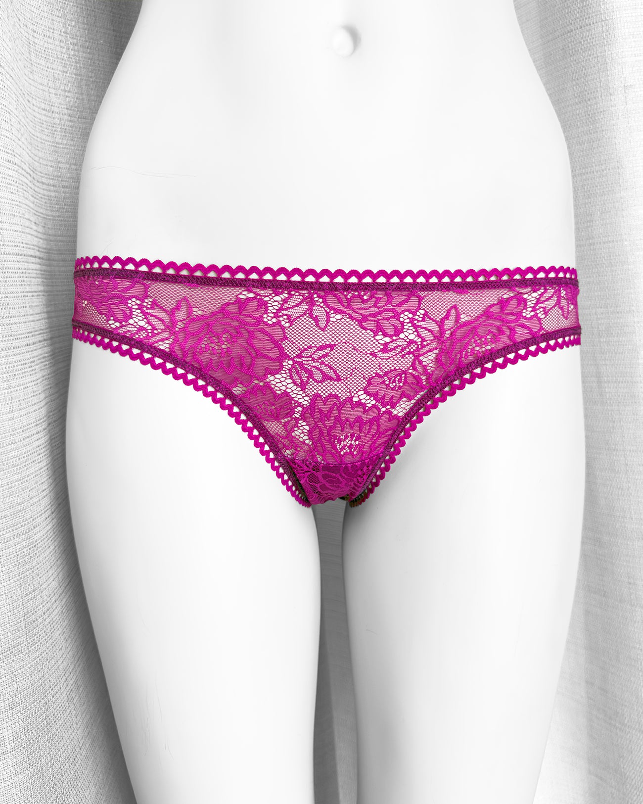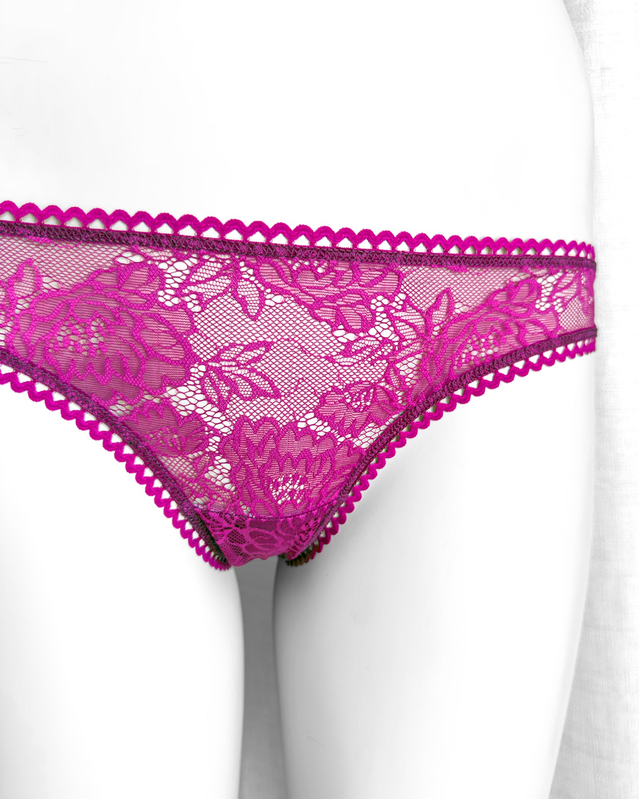 Brasiliana a vita regolare in pizzo magenta dal fondo retato con maxi fiori profilati che regalano un delizioso effetto bicromatico. Delizioso elastico ad onde. Pattina interna in 100% cotone.