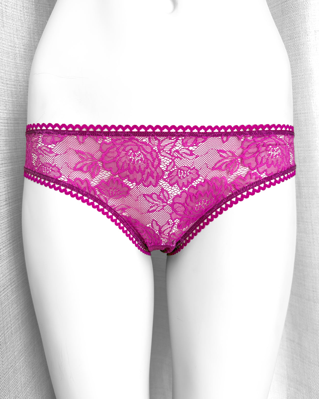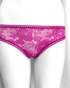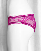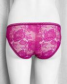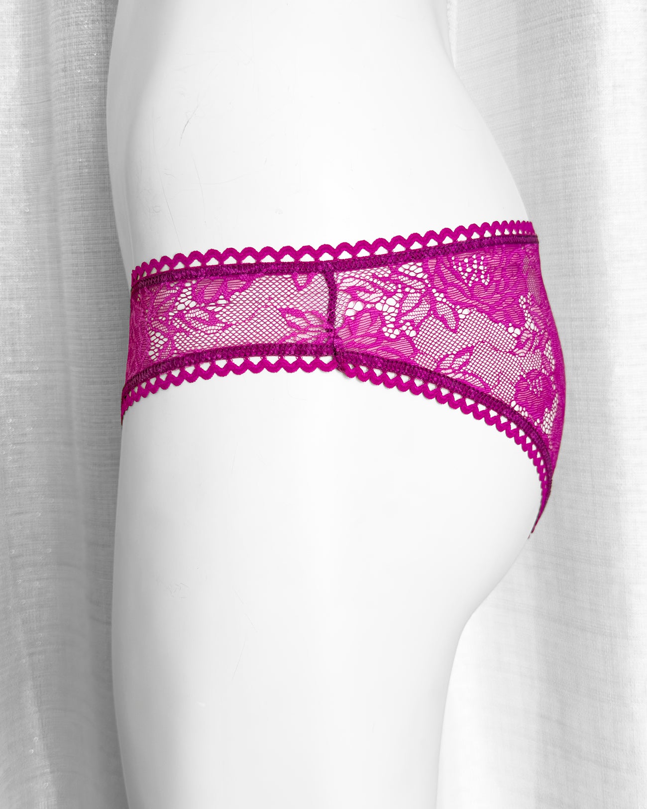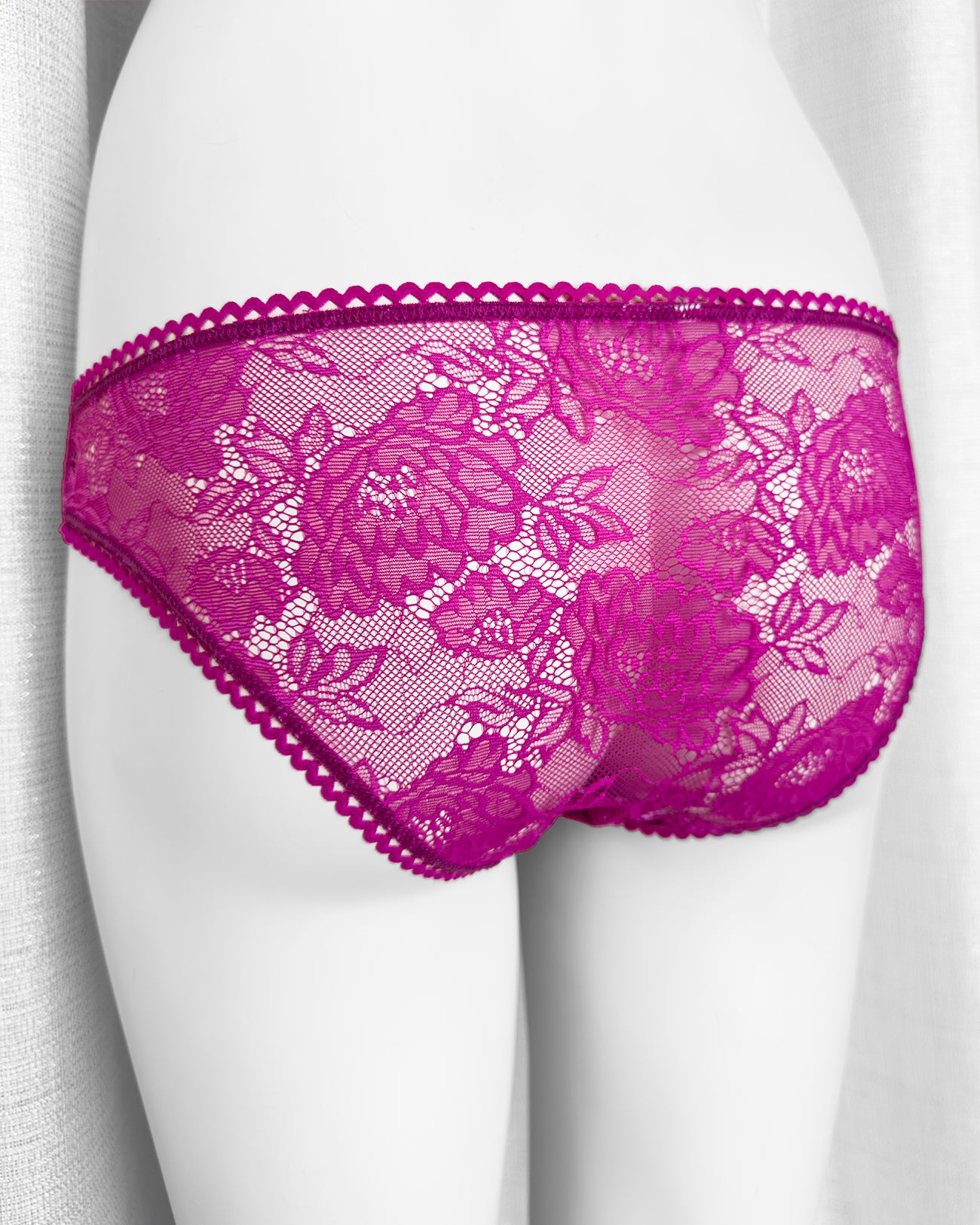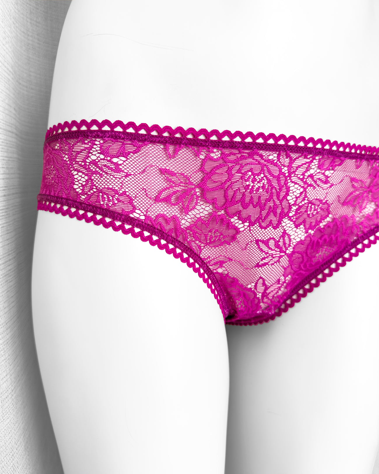Slip a vita regolare in pizzo magenta dal fondo retato con maxi fiori profilati che regalano un delizioso effetto bicromatico. Delizioso elastico ad onde. Pattina interna in 100% cotone.