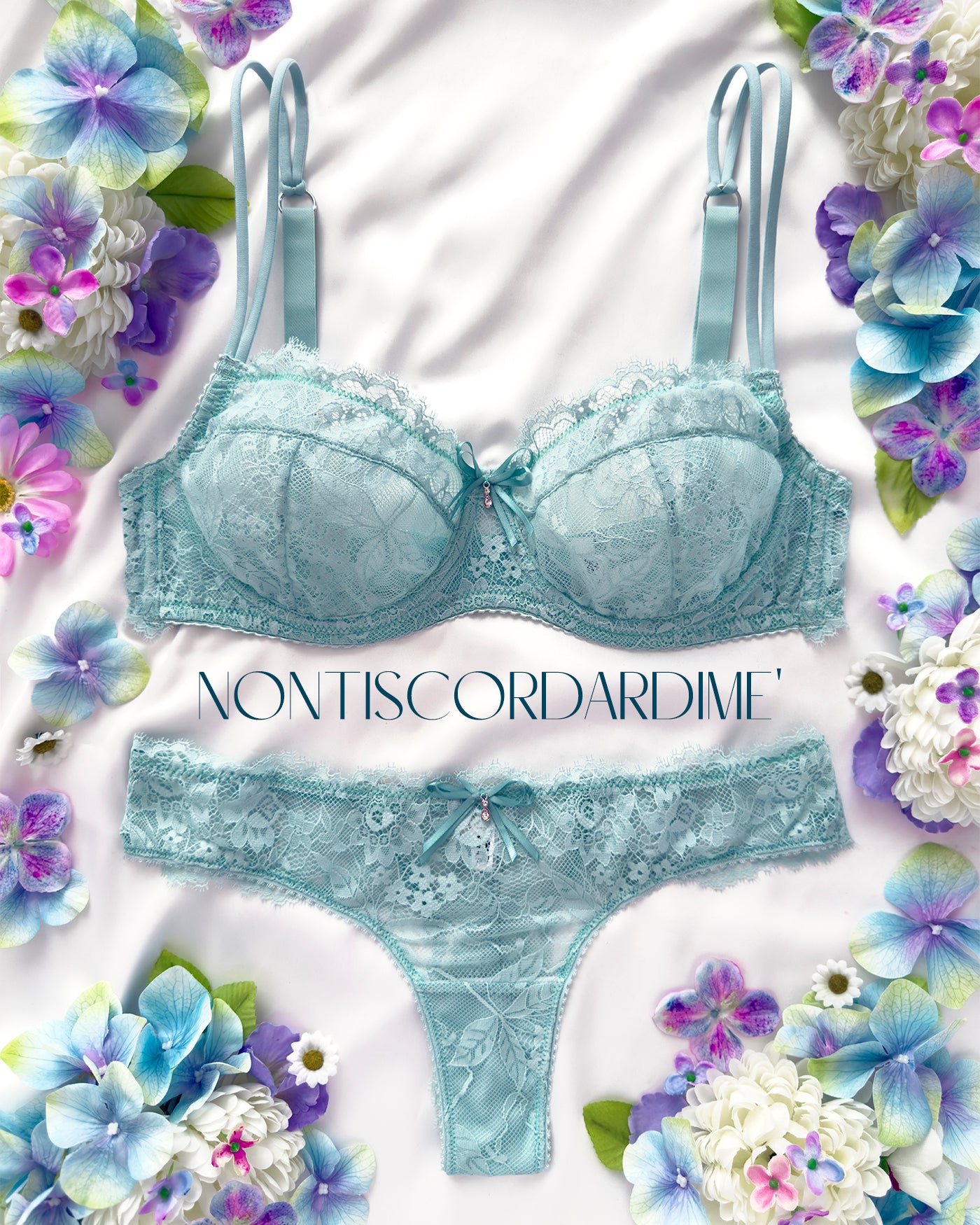 Un soffio leggero, una carezza sulla pelle impossibile da dimenticare: il pizzo acquamarina di Nontiscordardimè è pronto a fare breccia nel tuo cuore!