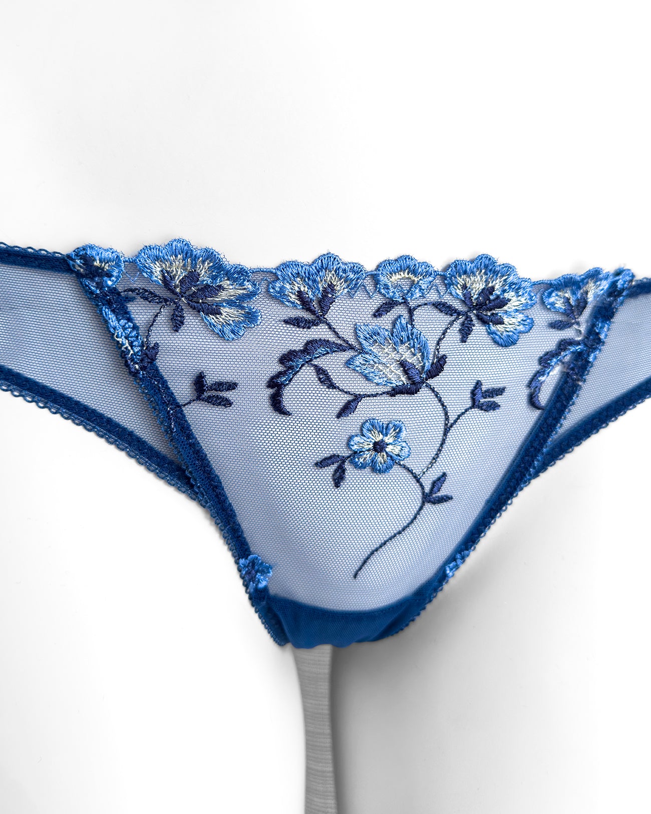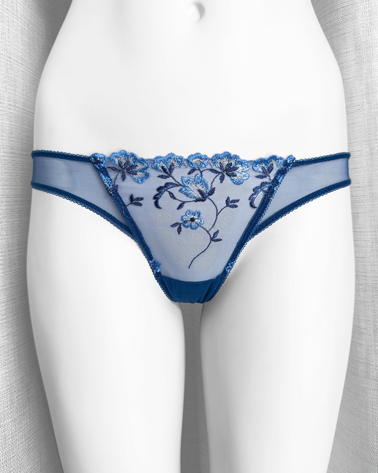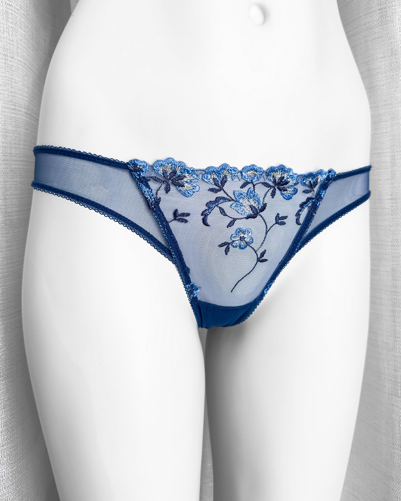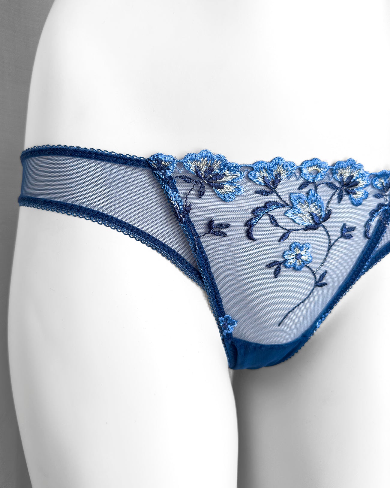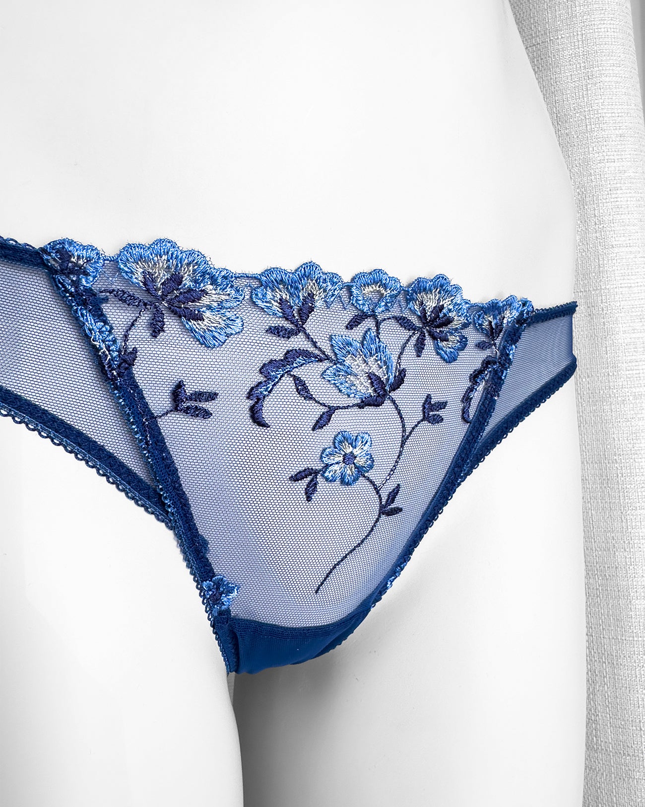 Brasiliana a vita standard. Parte frontale realizzata in elegantissimo tulle ricamato con fiori blu e azzurri. Il resto del capo è realizzato interamente in tulle elasticizzato in nuance: sensuale trasparenza e comodità assicurate! Elastico a cerchietti.