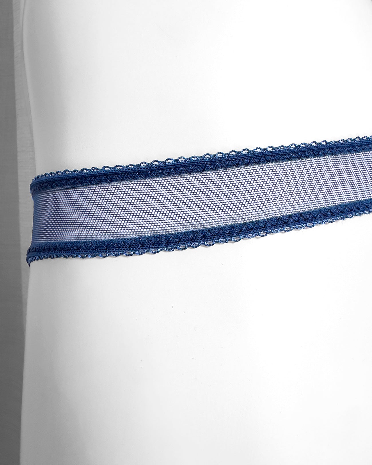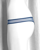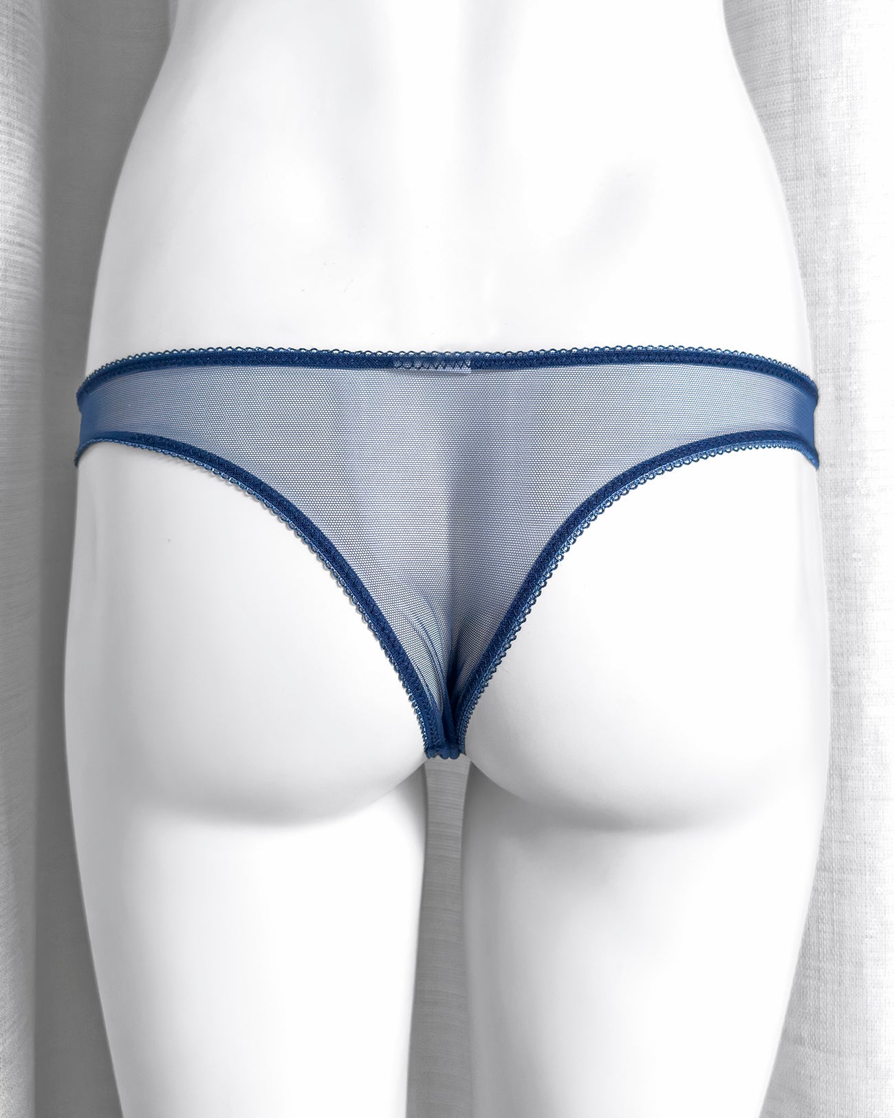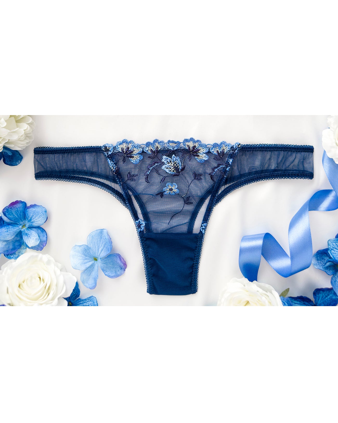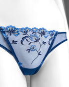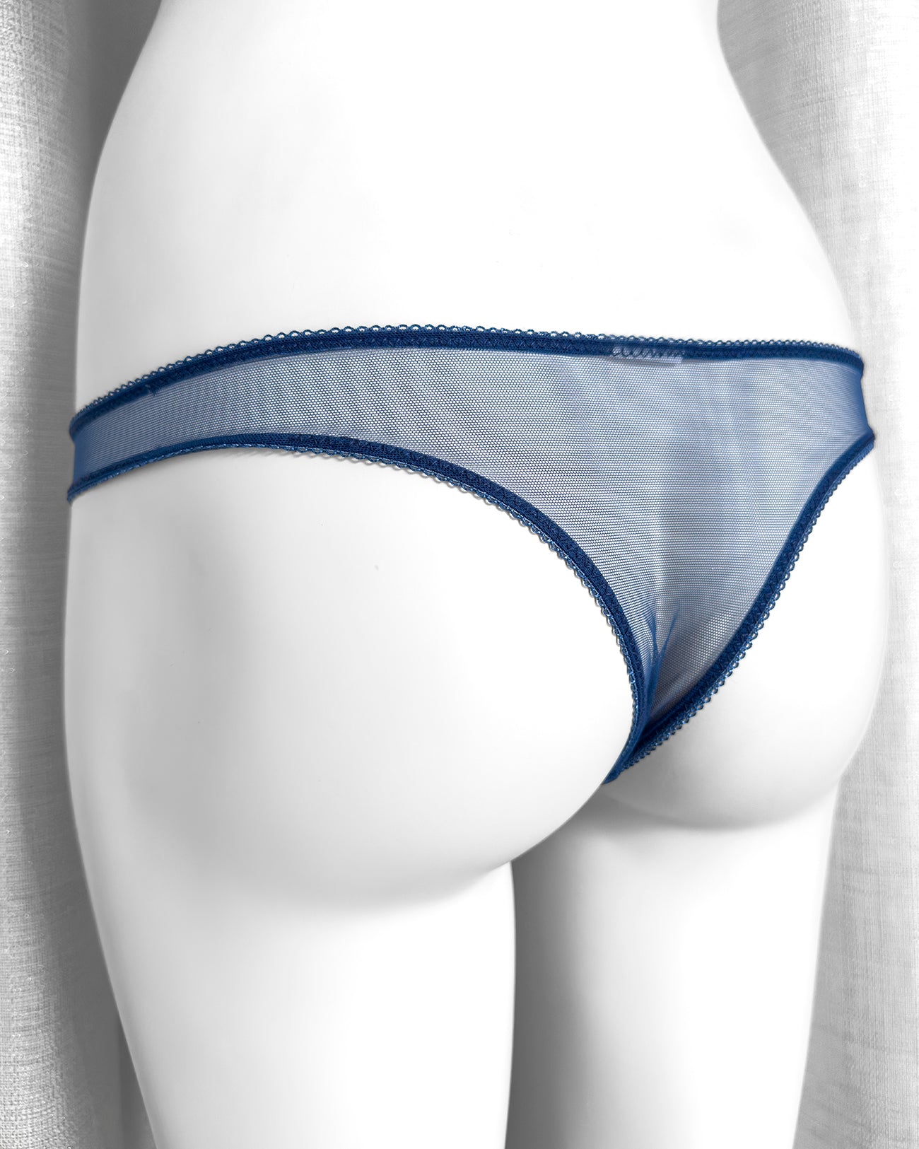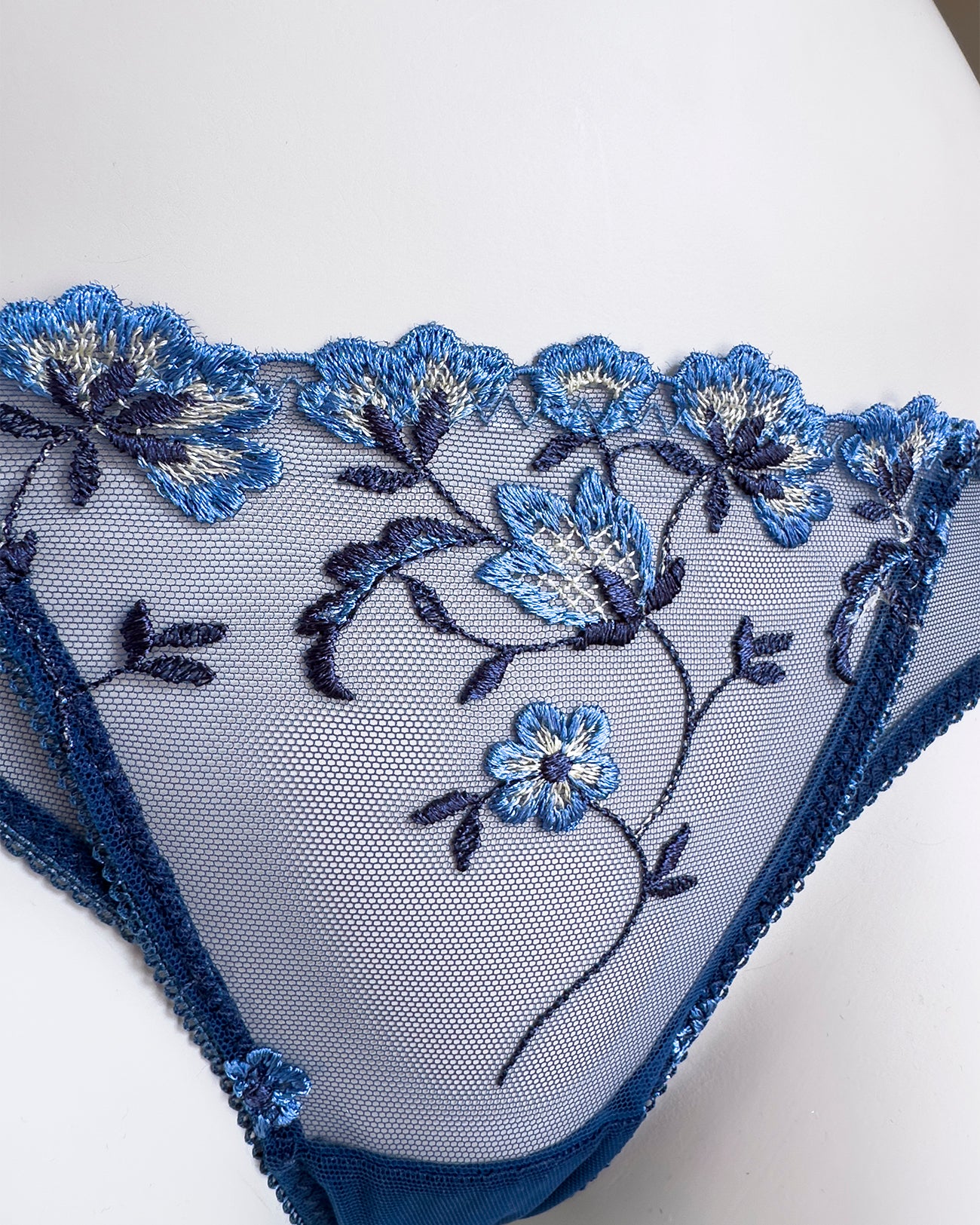 Brasiliana a vita standard. Parte frontale realizzata in elegantissimo tulle ricamato con fiori blu e azzurri. Il resto del capo è realizzato interamente in tulle elasticizzato in nuance: sensuale trasparenza e comodità assicurate! Elastico a cerchietti.