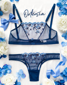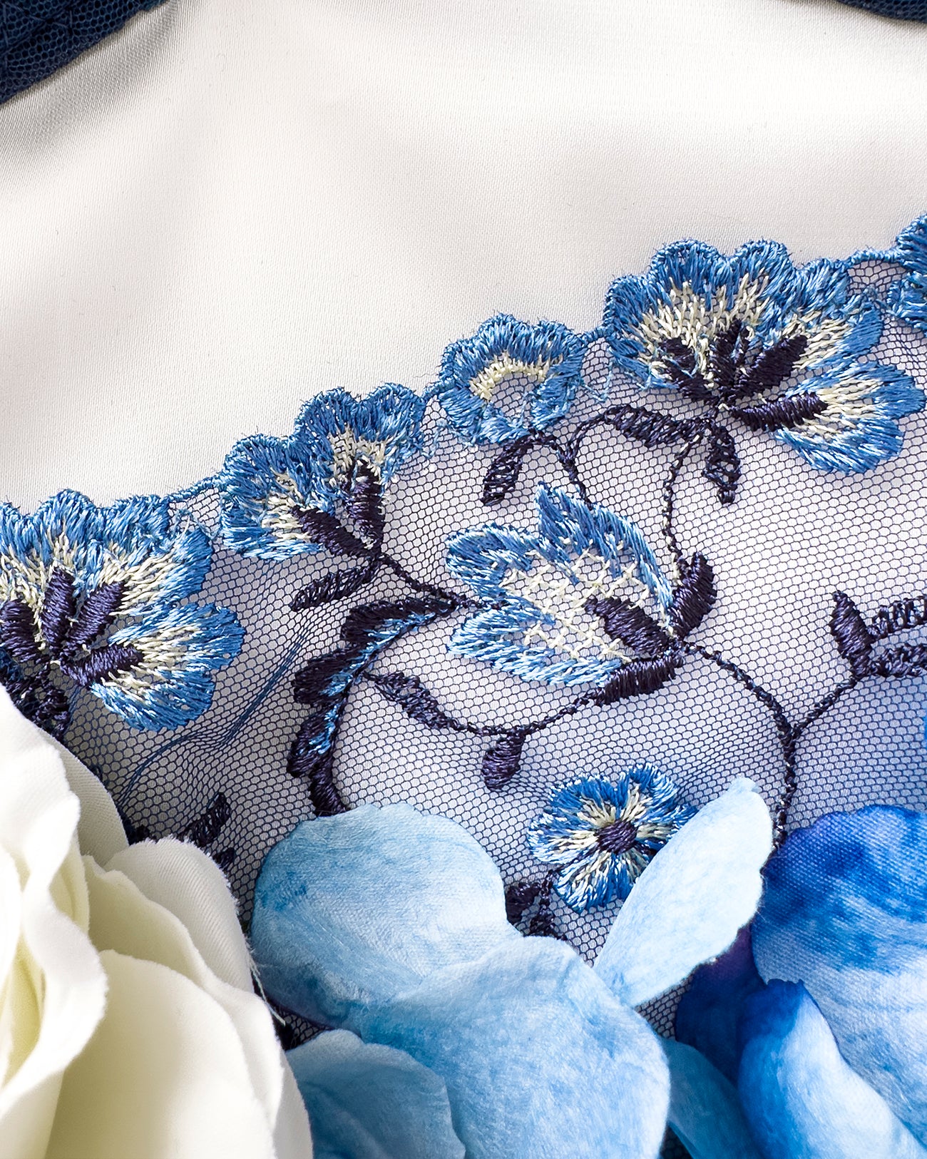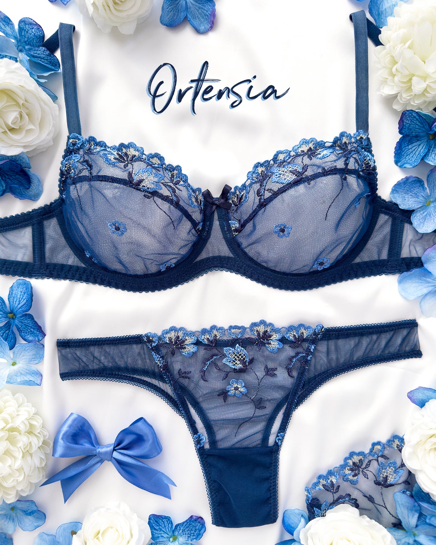 Incantevoli fiori azzurri e blu ricamati su tulle morbidissimo blu notte. Ricamo rigorosamente 100% made in Italy. Una linea da collezione!
