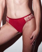 soffice tessuto rosso elasticizzato. Inserti laterali in tulle ricamati con deliziosi fiorellini rossi.