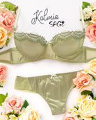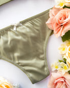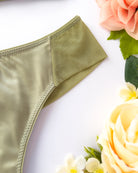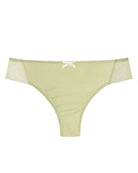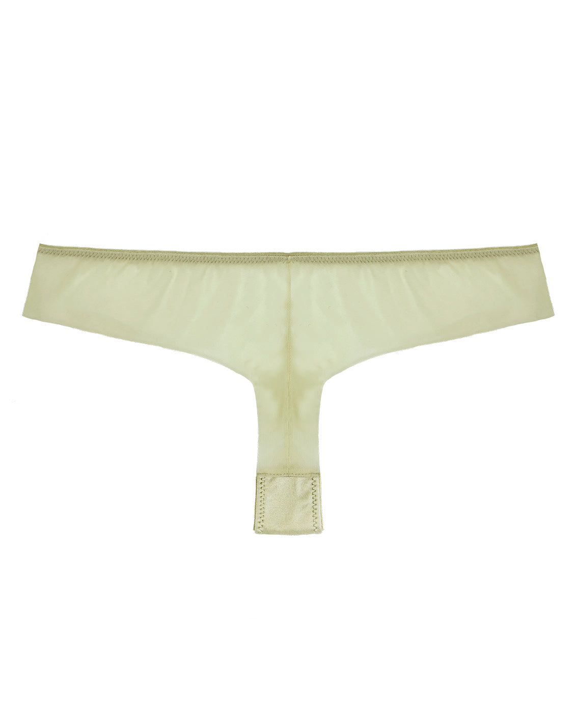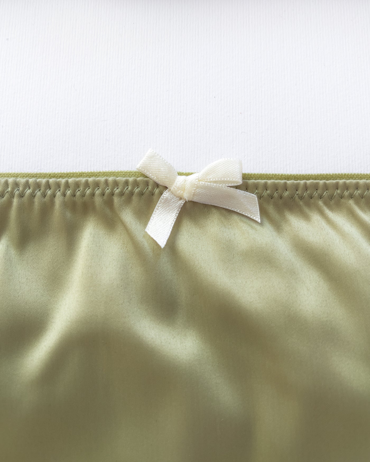 Brasiliana a vita regolare in raso verde salvia elasticizzato (super comodo!). Fiocchetto centrale in raso avorio che riprende perfettamente il ricamo Kalmia Sage presente sul reggiseno push-up coordinato (in vendita separatamente).