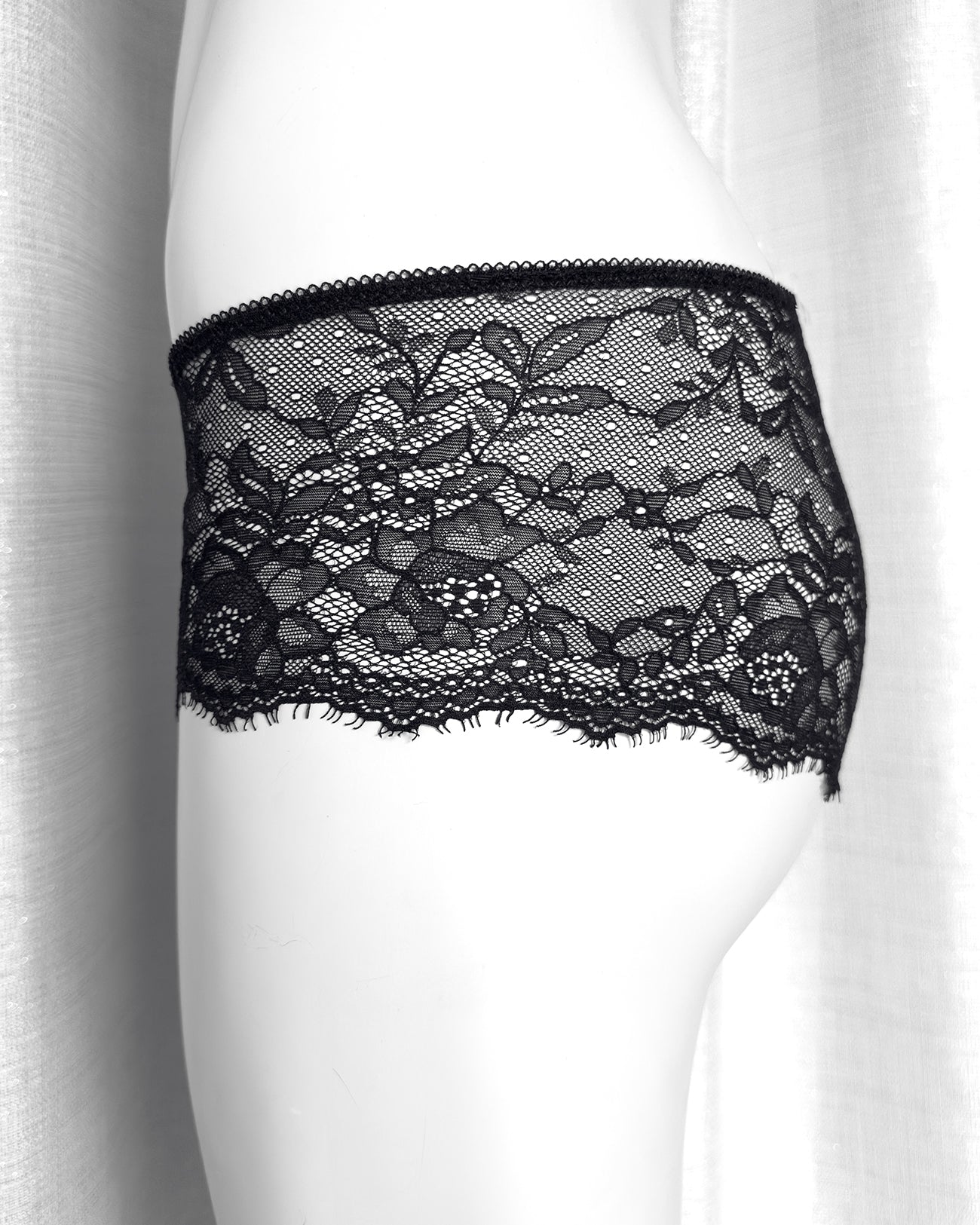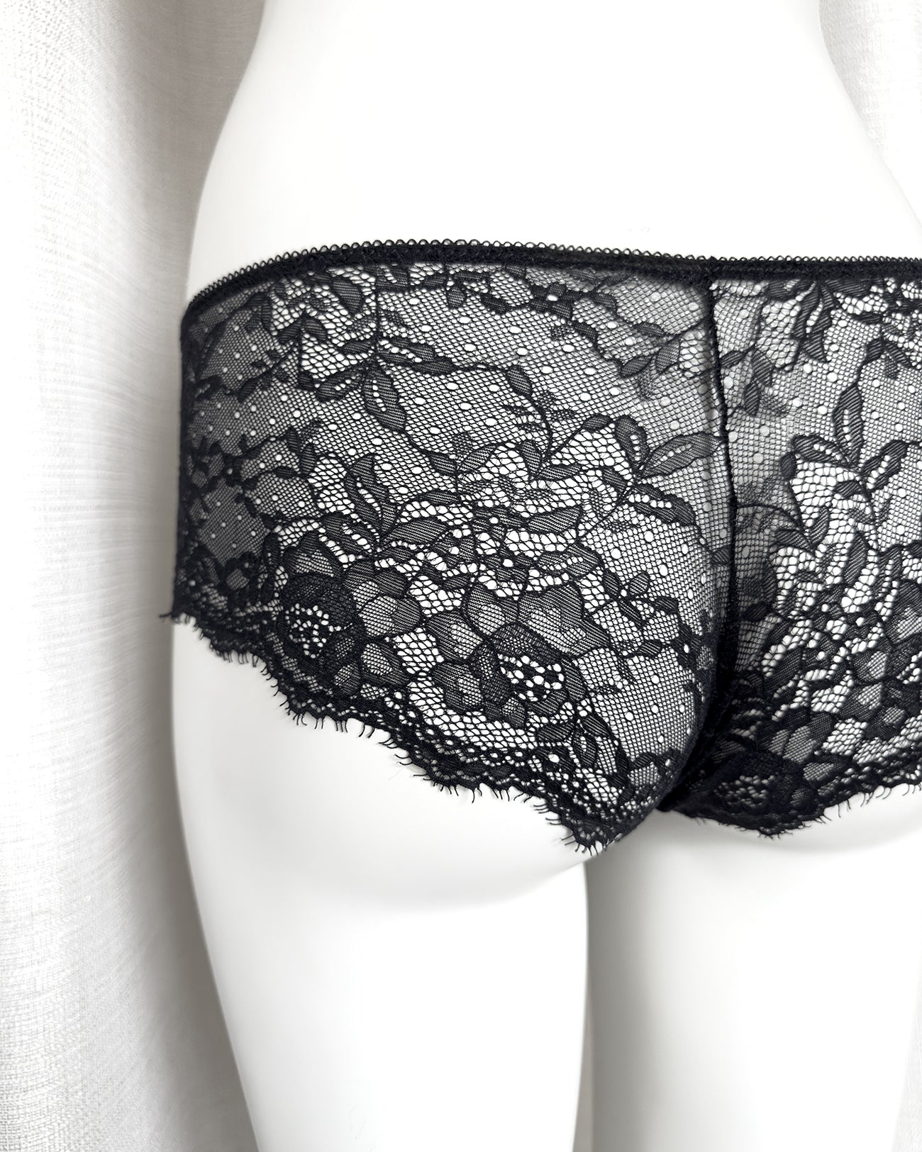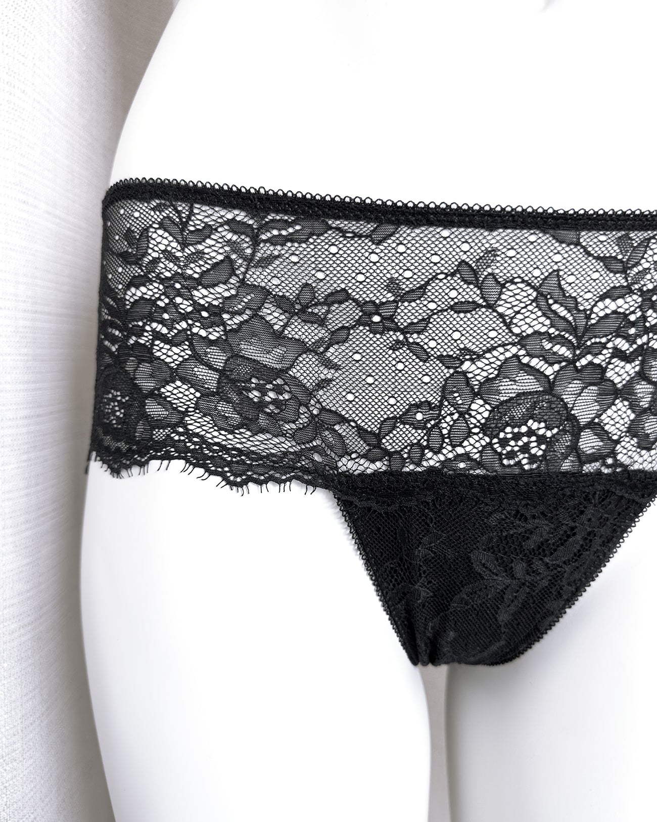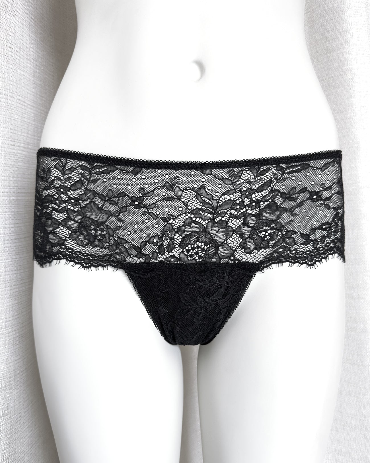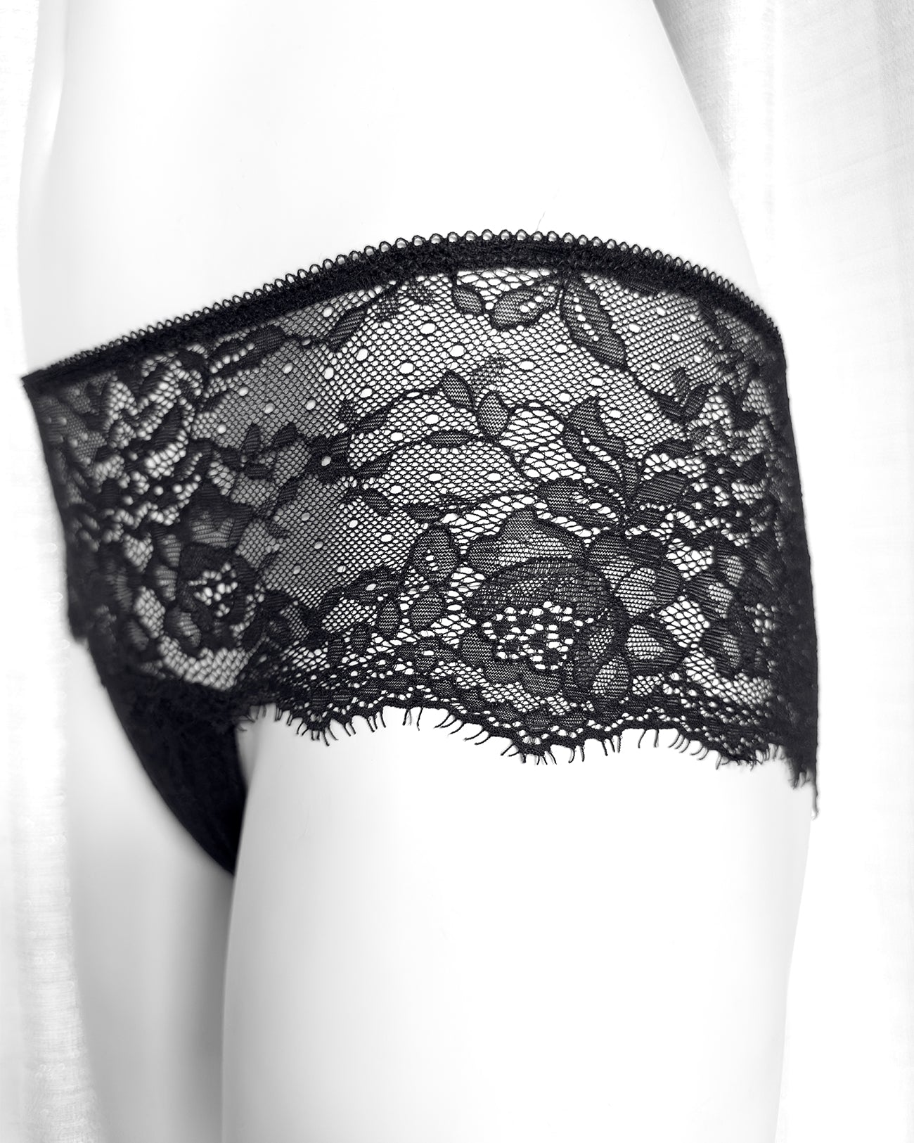 Culotte a vita regolare totalmente realizzata in magnifico pizzo nero cigliato. Pattina interna in 100% cotone biologico. Il retro non segna grazie alla particolare lavorazione e ti godi tutta la bellezza del pizzo!