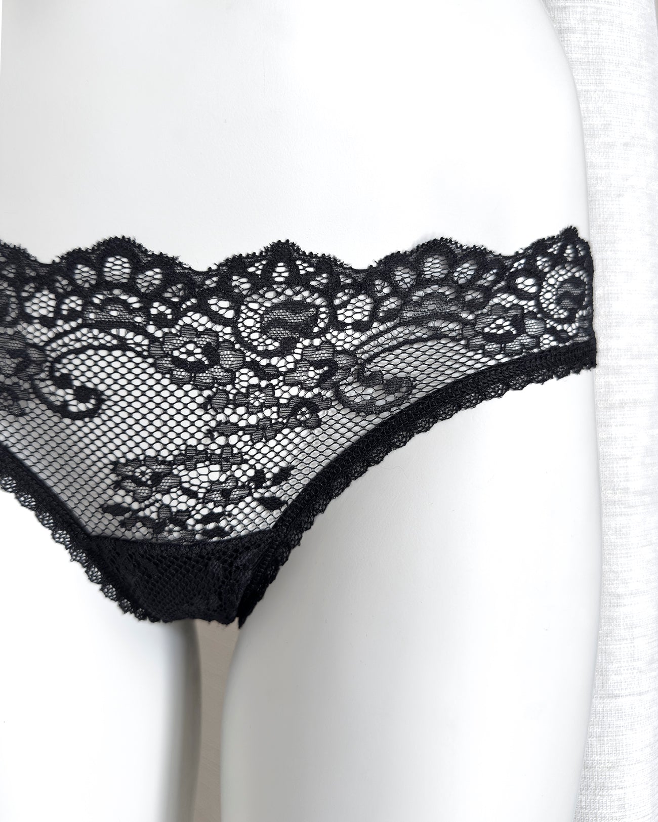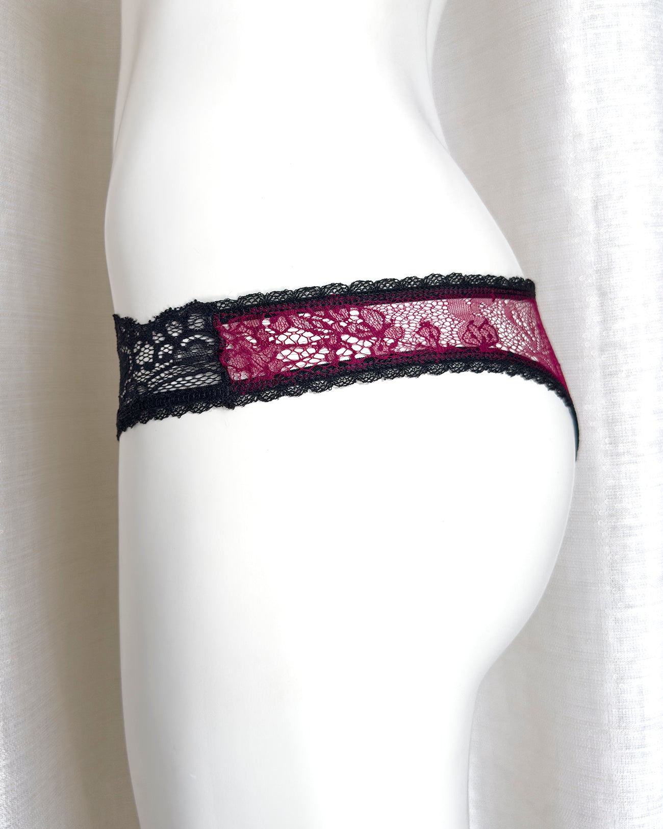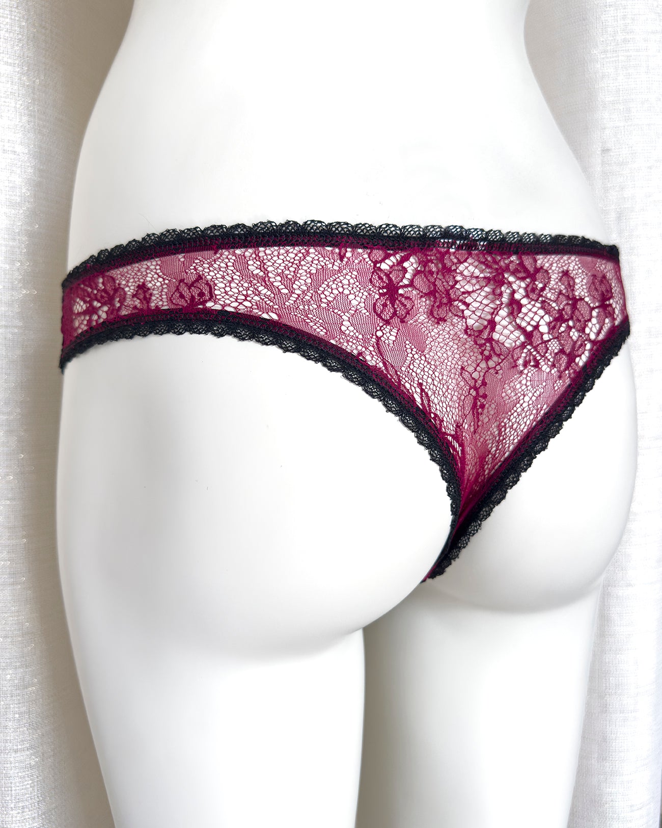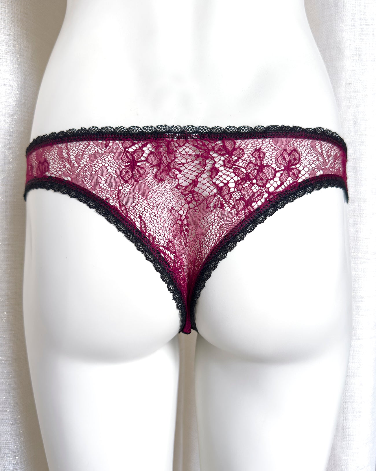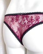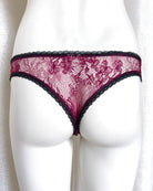 Brasiliana a vita regolare totalmente realizzata in magnifico pizzo. La parte frontale è in pizzo nero retato con smerlo dal disegno floreale e mantiene perfettamente l'aderenza grazie al comodissimo elastico in silicone (ecco spiegata la magica illusione di trasparenza). Retro in pizzo floreale color vino a contrasto. Una combinazione di colore super chic! Elastico retato perfettamente coordinato al pizzo! Pattina interna in 100% cotone biologico.