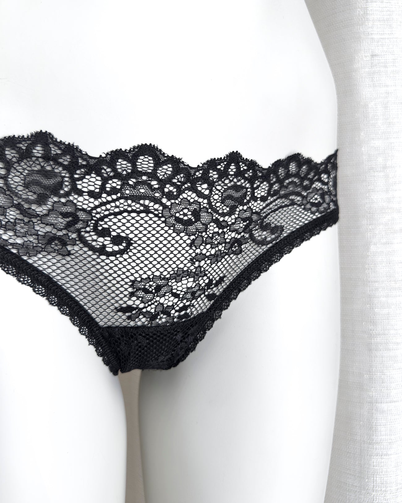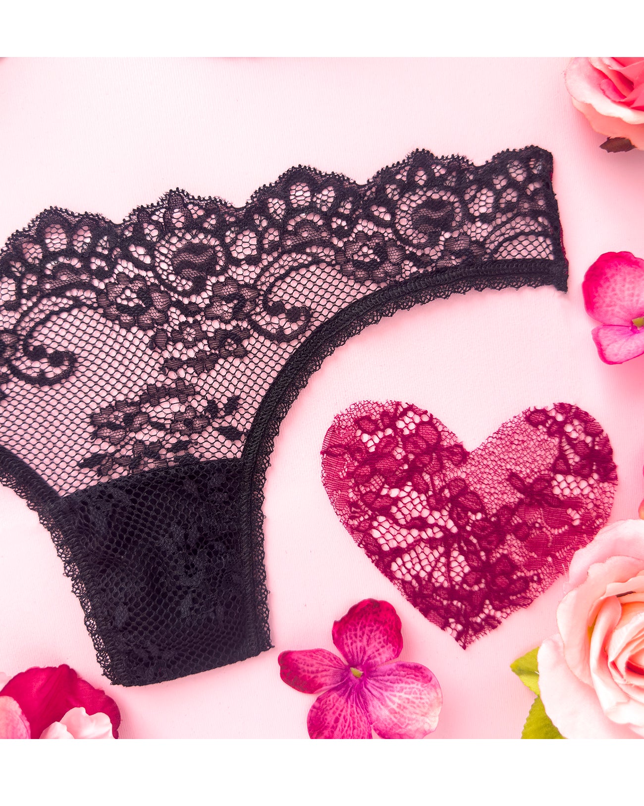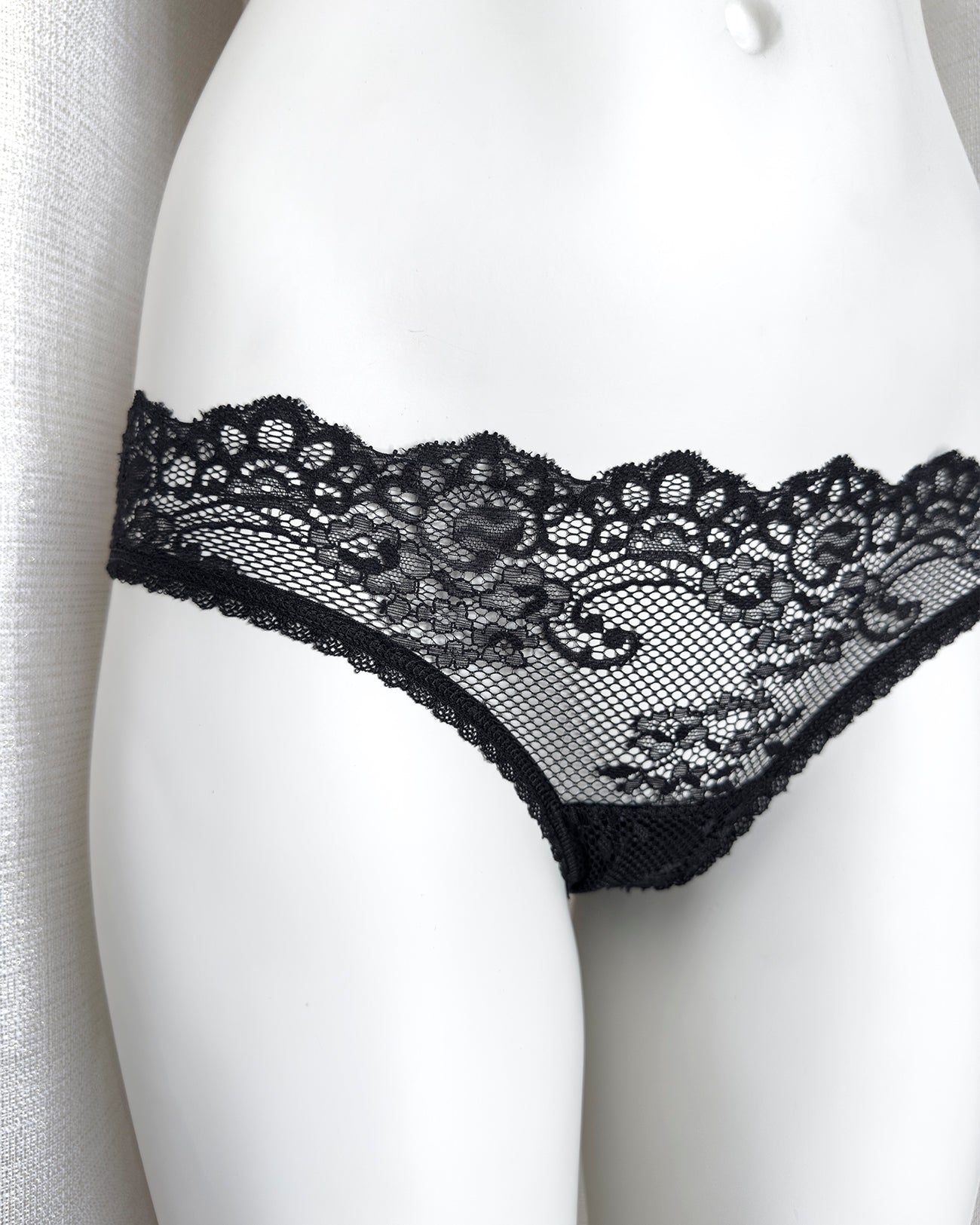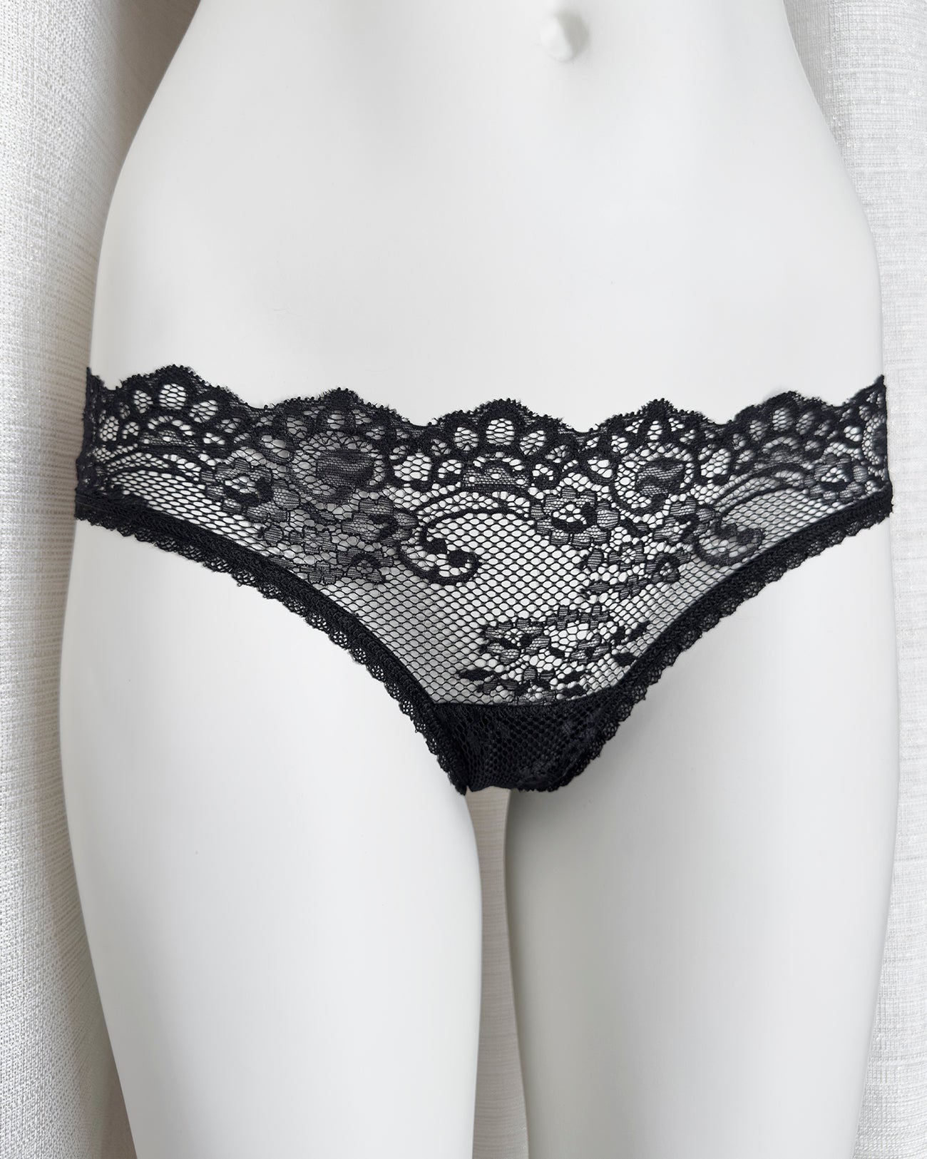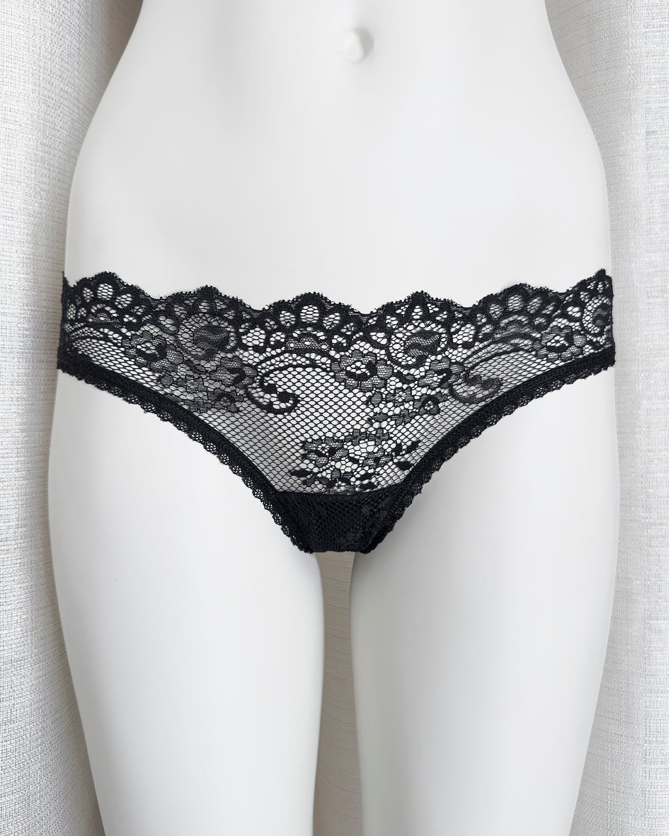 Brasiliana a vita regolare totalmente realizzata in magnifico pizzo. La parte frontale è in pizzo nero retato con smerlo dal disegno floreale e mantiene perfettamente l'aderenza grazie al comodissimo elastico in silicone (ecco spiegata la magica illusione di trasparenza). Retro in pizzo floreale color vino a contrasto. Una combinazione di colore super chic! Elastico retato perfettamente coordinato al pizzo! Pattina interna in 100% cotone biologico.