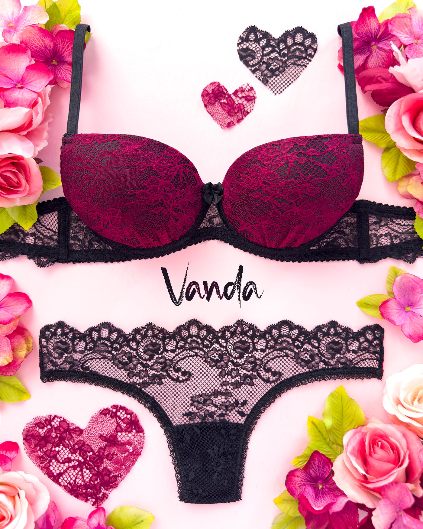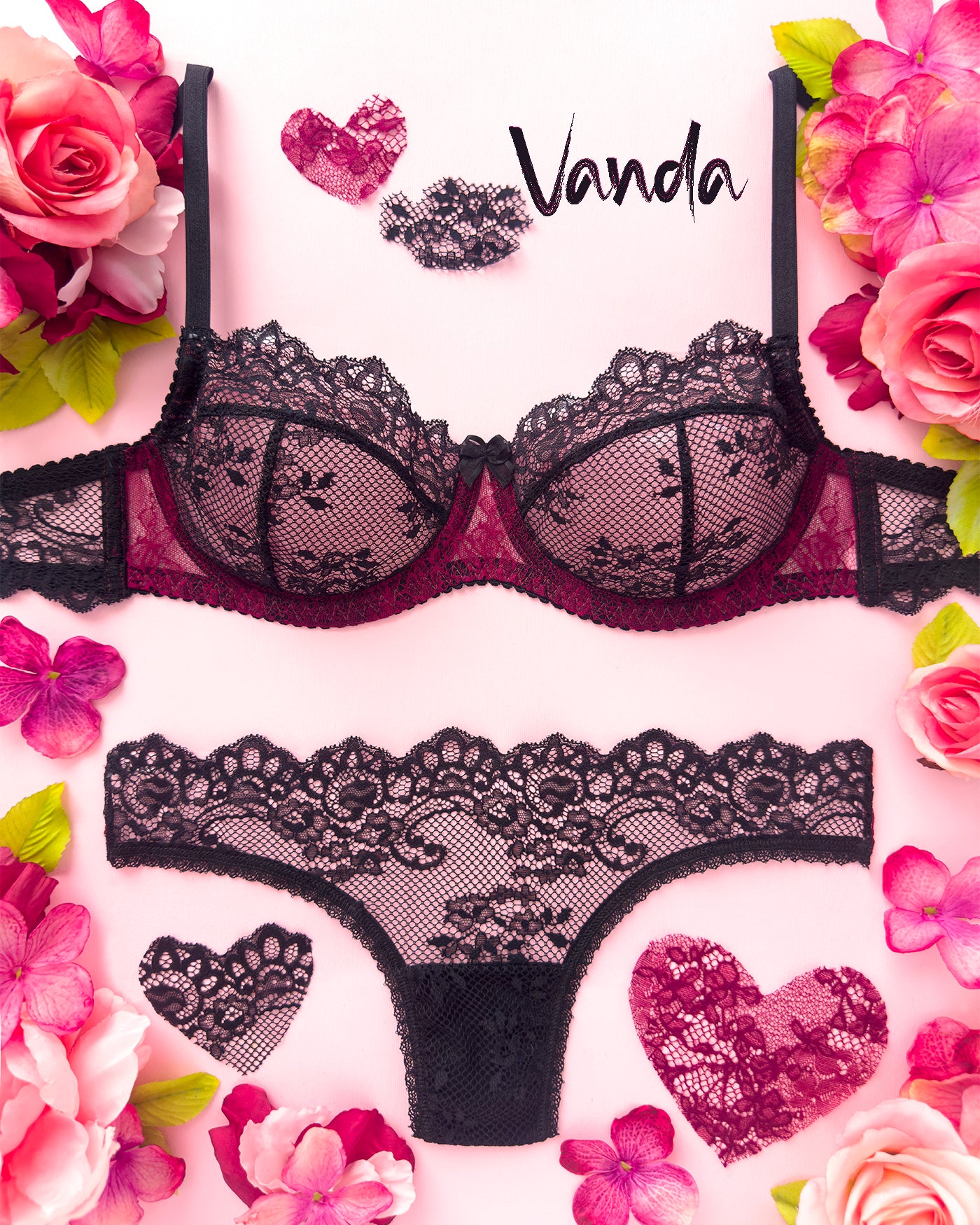 Pizzo nero, fondo retato, disegno floreale e l'originalità dell'abbinamento con il corposo color vino: Vanda "profuma" di meraviglia!