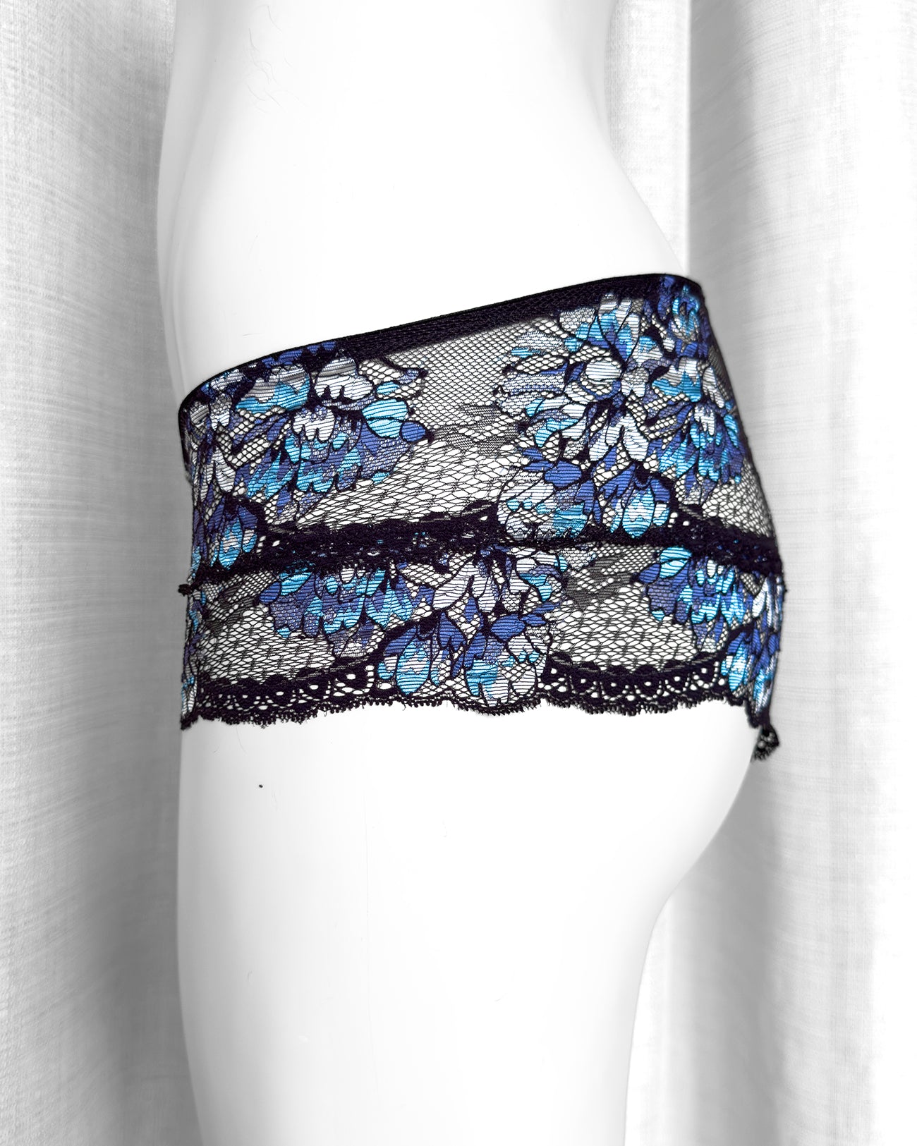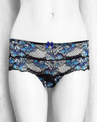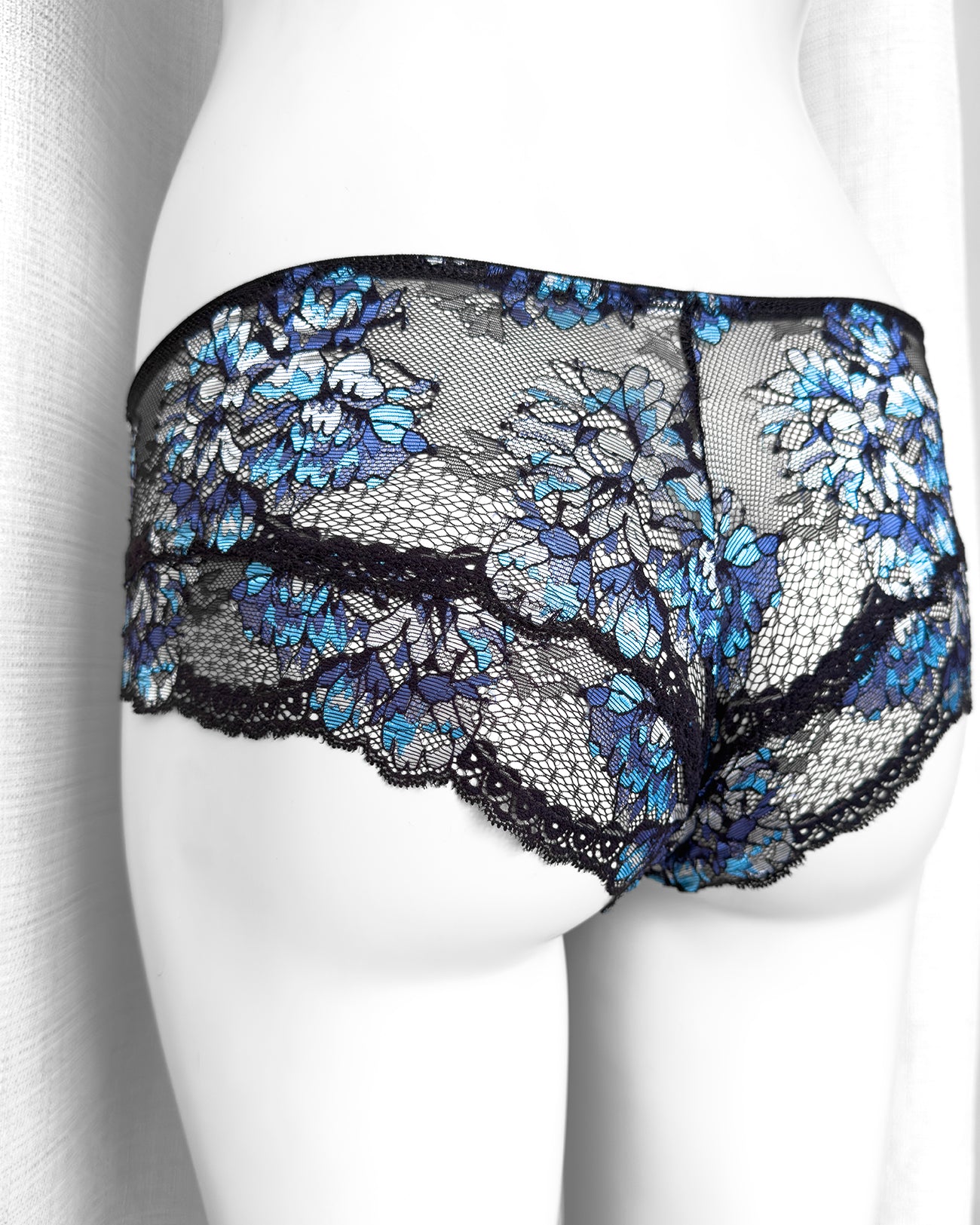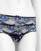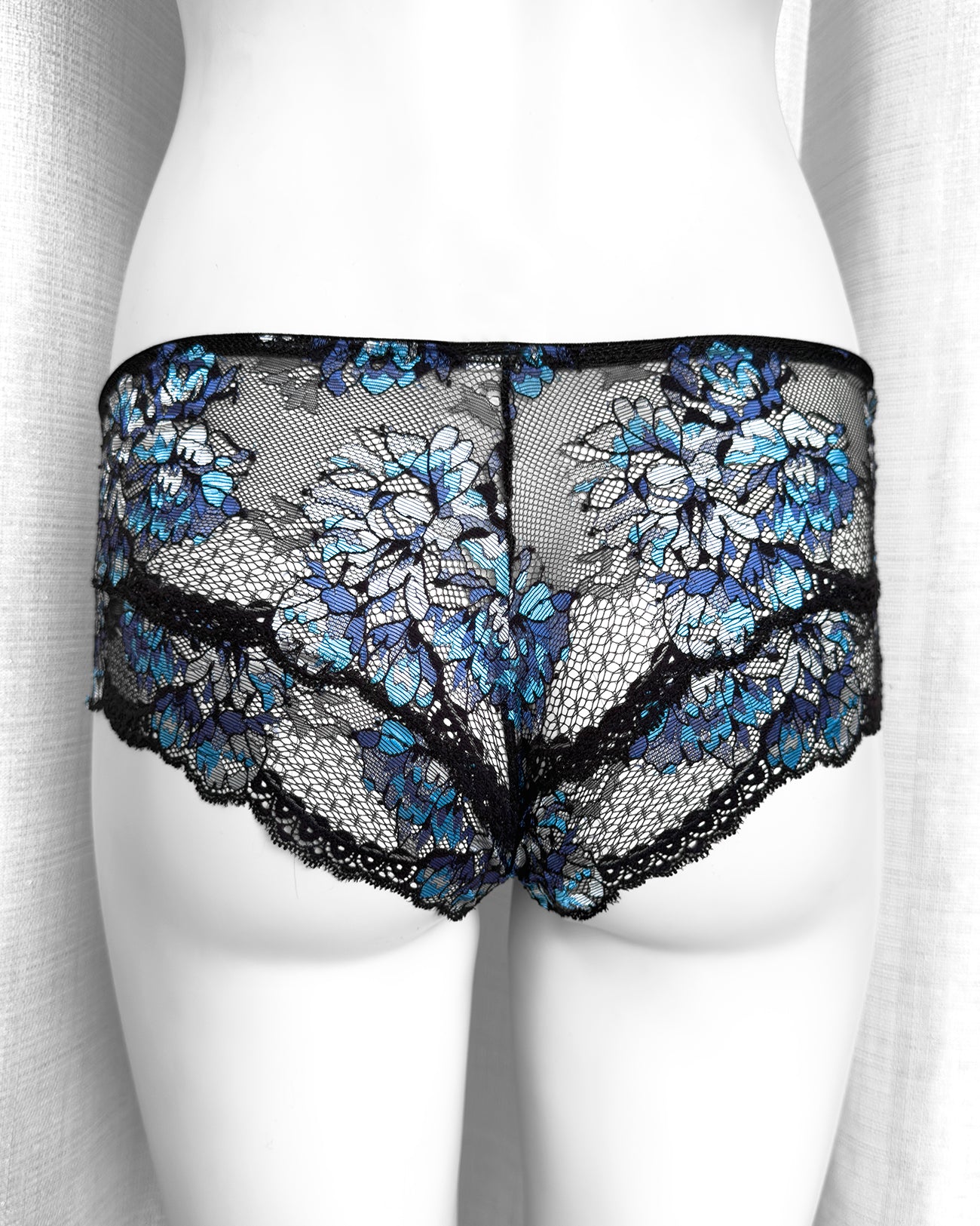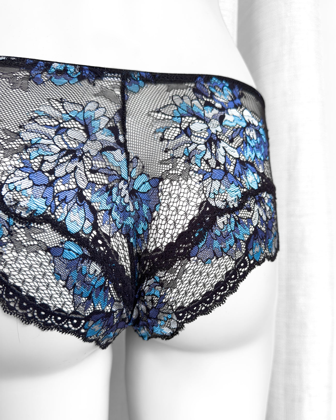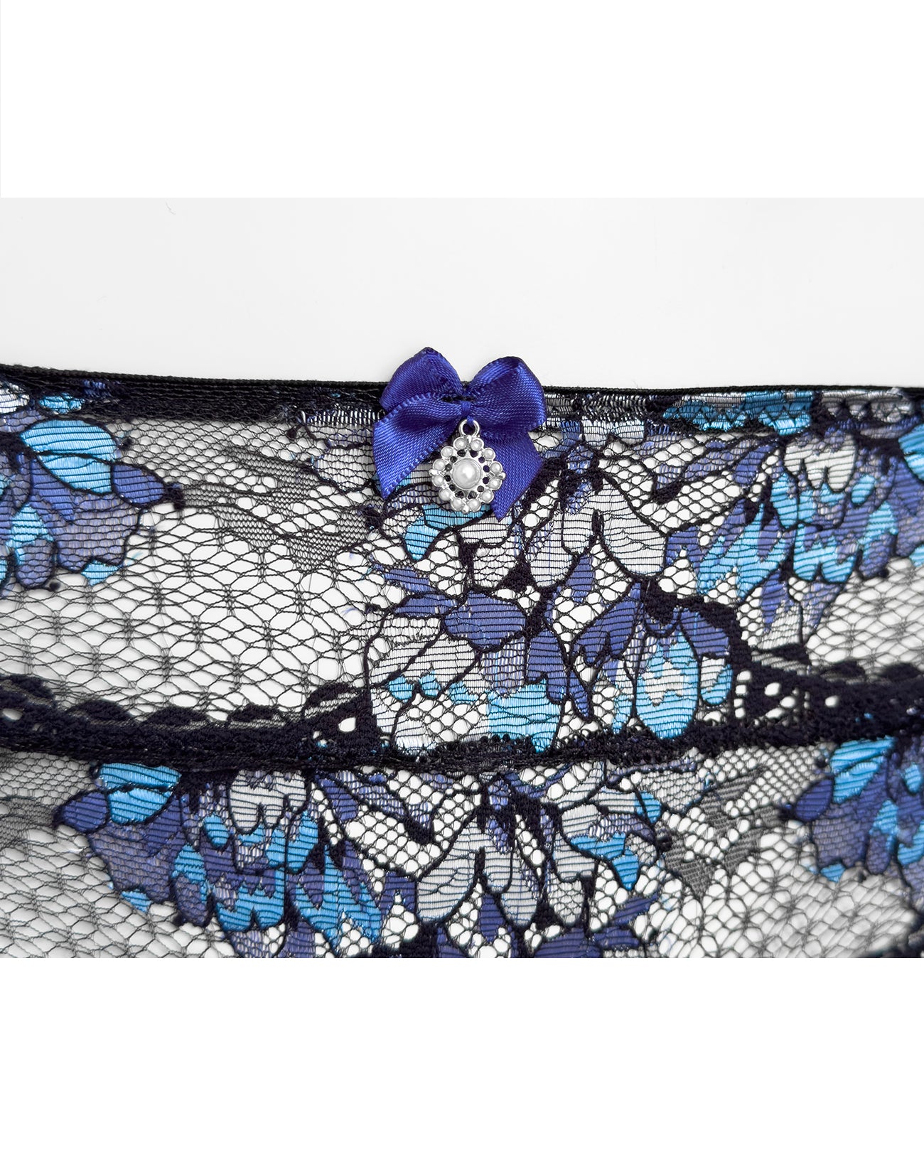 Culotte a vita media realizzata in speciale pizzo nero con fiori lucidi multicolore: argento, azzurro, indaco si intrecciano in una combinazione unica. Fiocchetto centrale in raso indaco ed incantevole pendente gioiello con perle. Goditi tutta la bellezza di questo pizzo grazie al doppio smerlo: il capo risulta comodissimo e non segna sui glutei! Pattina interna in 100% cotone.