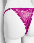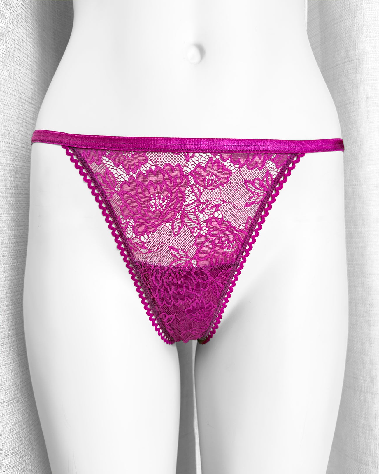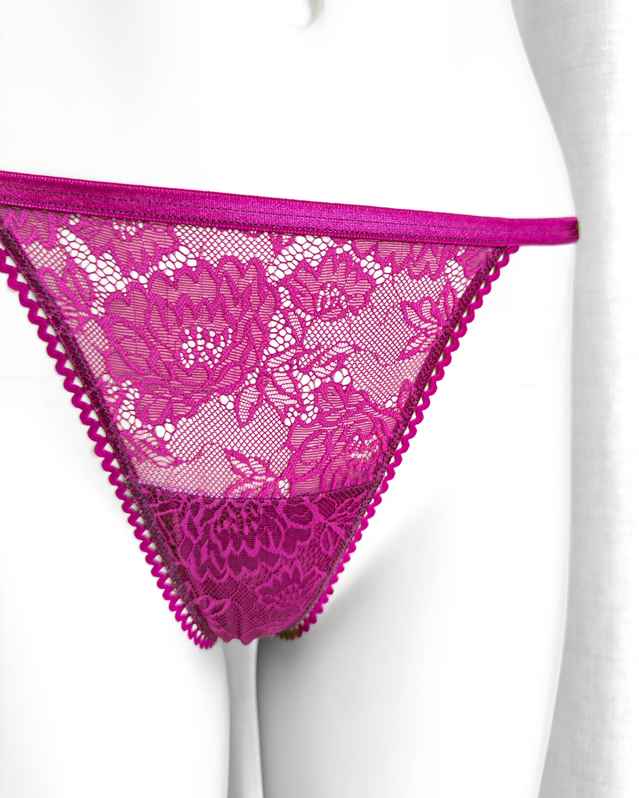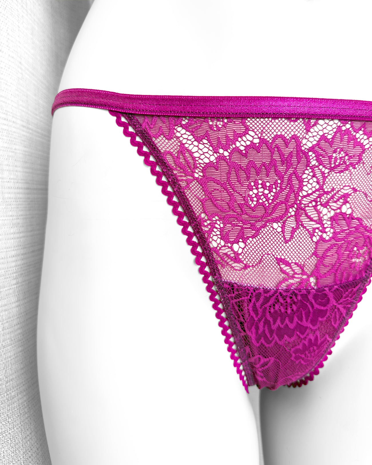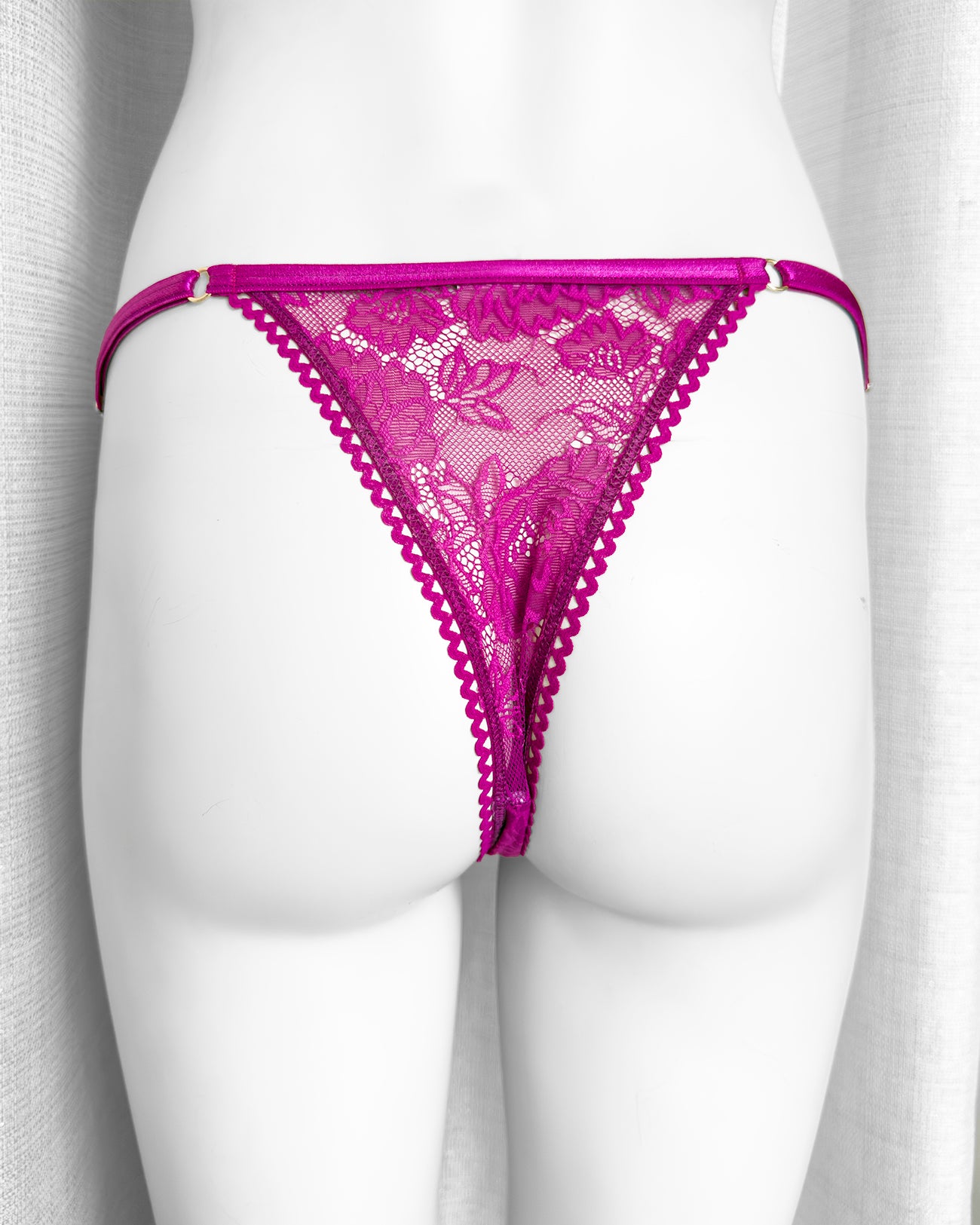Perizoma regolabile a vita standard realizzato in morbidissimo pizzo magenta dal fondo retato con maxi fiori profilati che regalano un delizioso effetto bicromatico. Grazie ai cursori puoi regolare la taglia per ottenere la vestibilità perfetta. Il capo super hot che ogni donna dovrebbe avere. Pattina interna in 100% cotone.